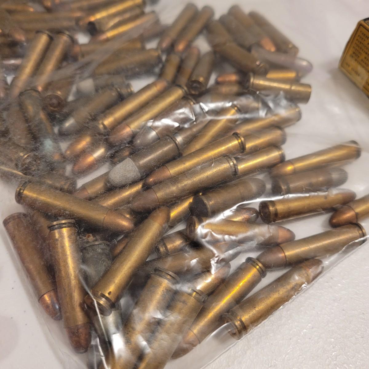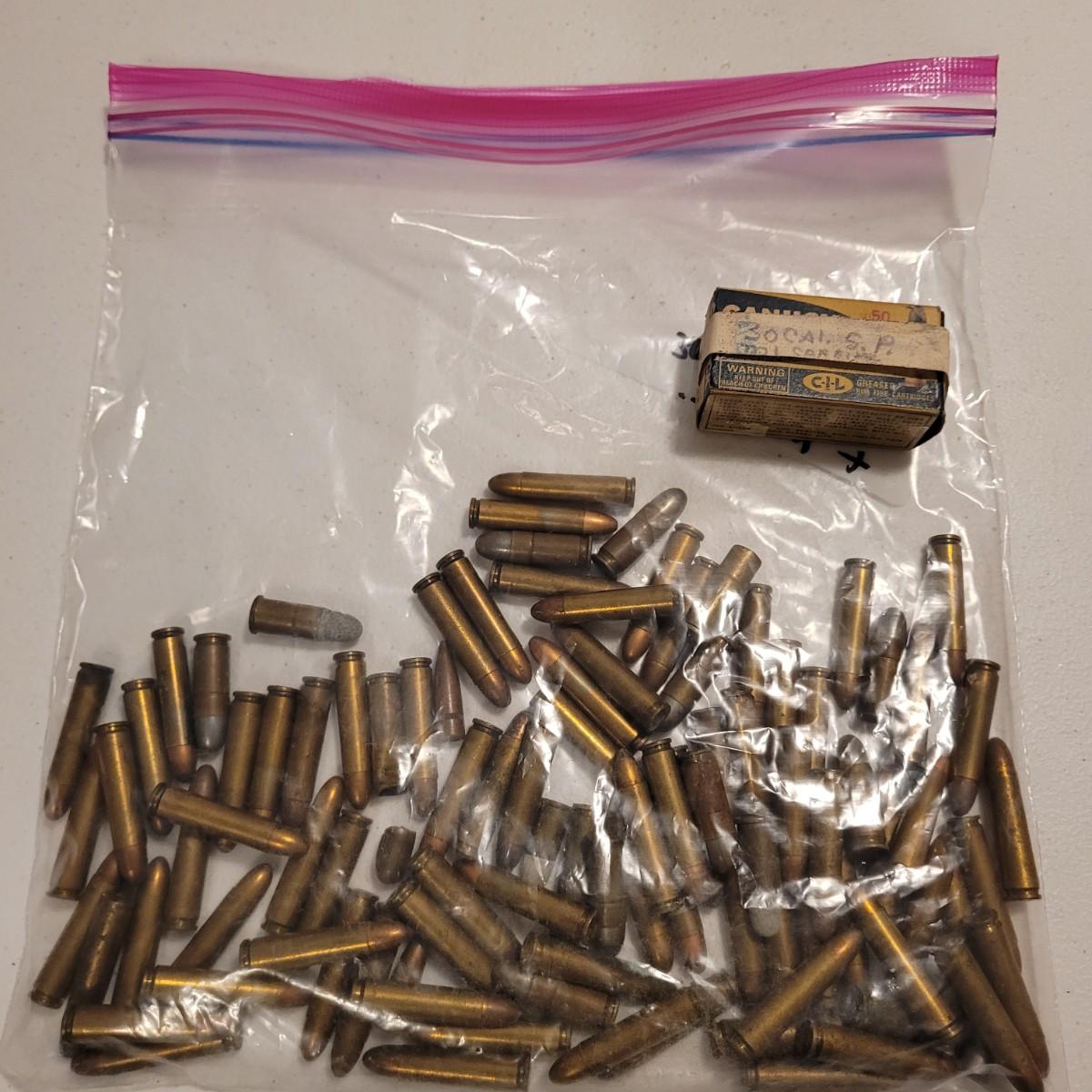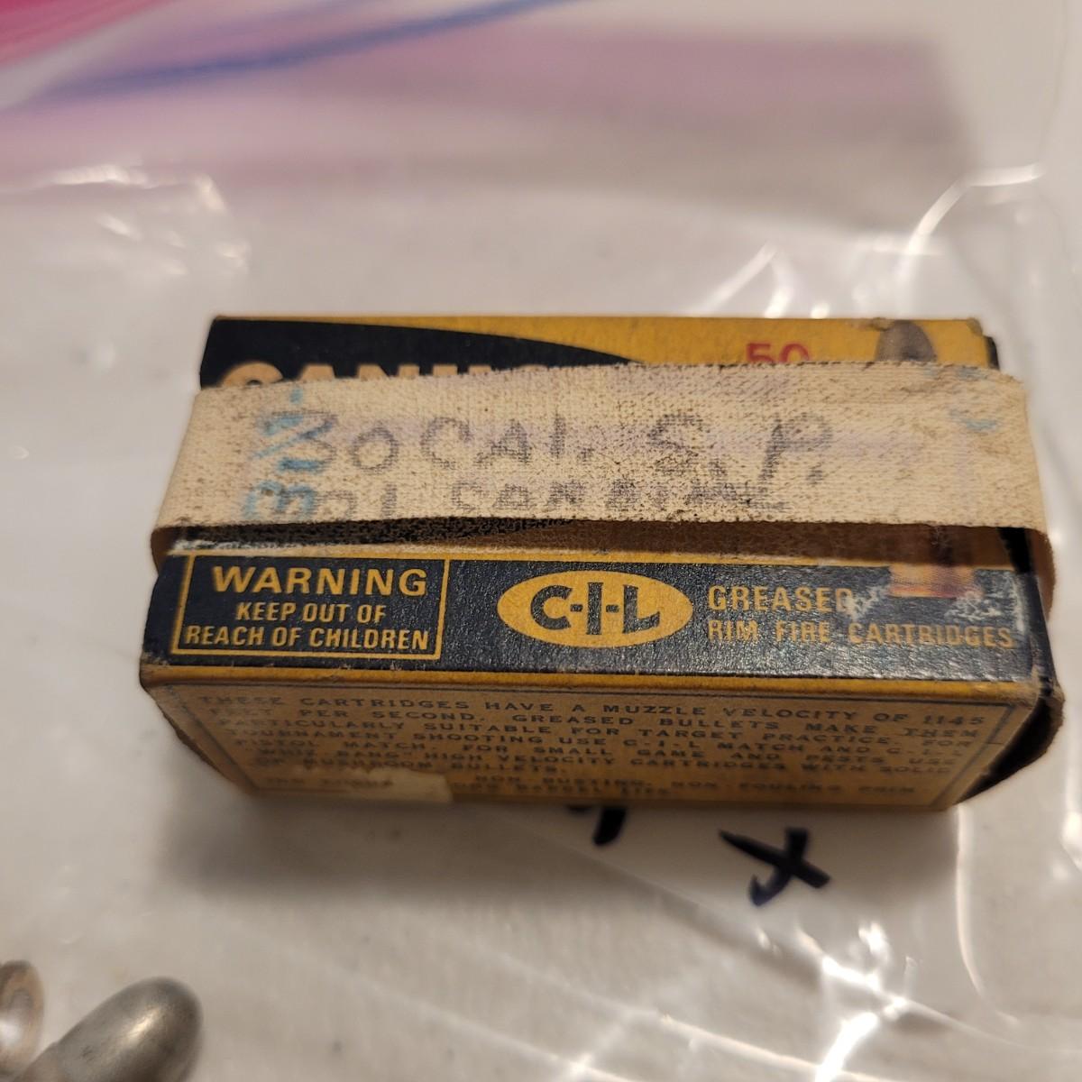 This lot includes four boxes of 30-30 Winchester cartridges, one military style ammo can, and one bag full of miscellaneous center fire cartridges. These cartridges are older and need to be assessed before firing. The four boxes of 30-30 contain 20 rounds. One box is open and only contains 11 rounds. The ammo can is practically brand new. The bag of miscellaneous ammo contains .22, .30 carbine, .38, and more.