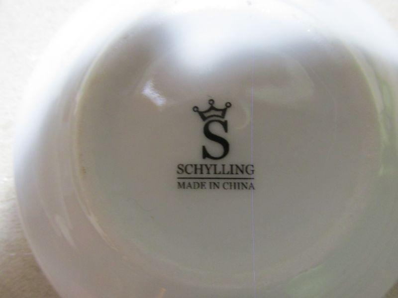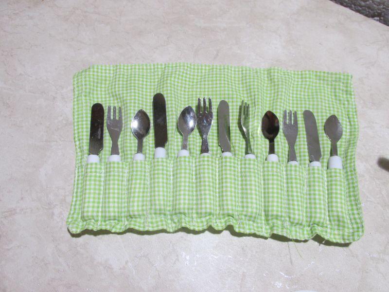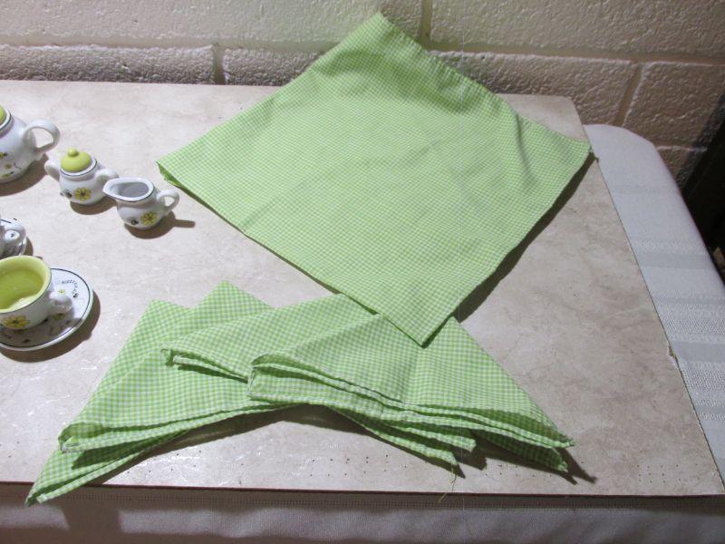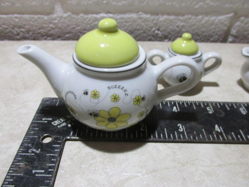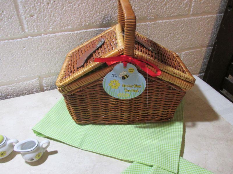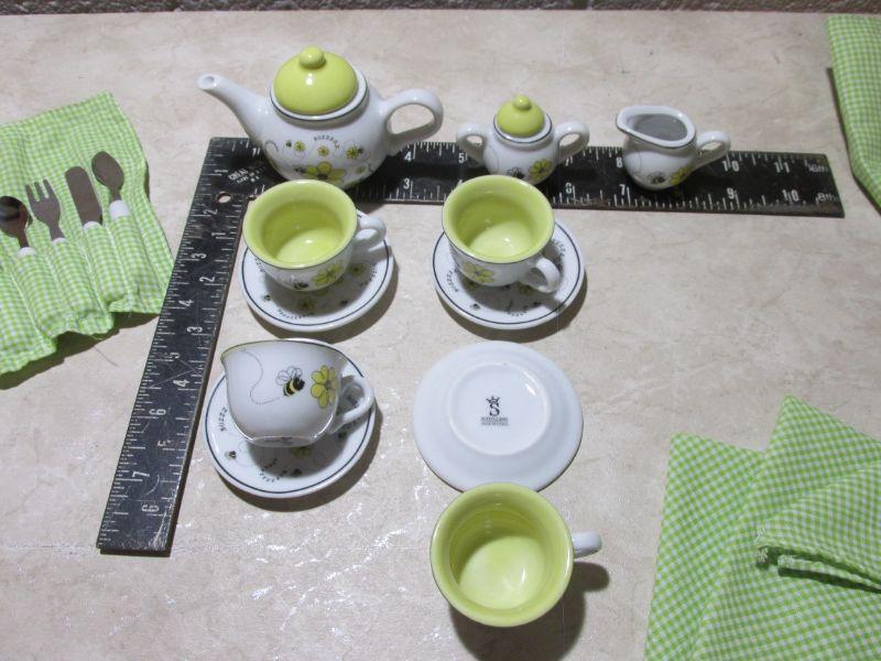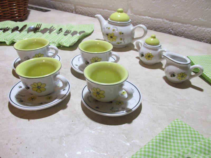 3-036 Busy Bee Tea Set. Tea service for 4. Cups, saucers, Teapot with lid, sugar bowl with lid and creamer. It also has 4 piece serving set of flatware. Comes with 4 cute green and white checkered napkins and tablecloth, and cute wicker basket for storage. Any little girls dream.