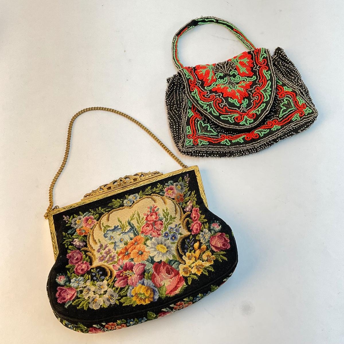 304 Vintage Beaded Bag & Vintage Antique Victorian Black Petit Point Needlepoint Handbag