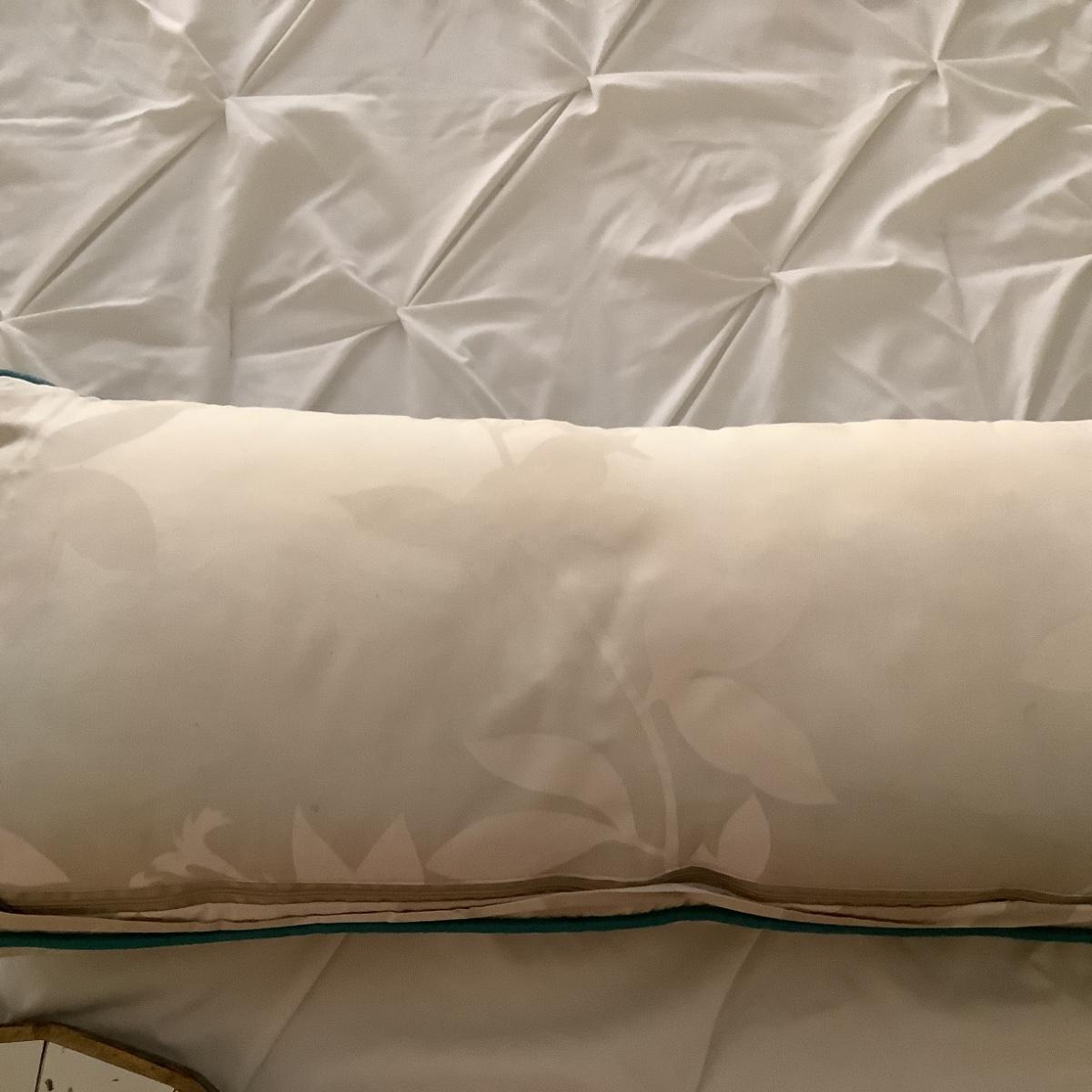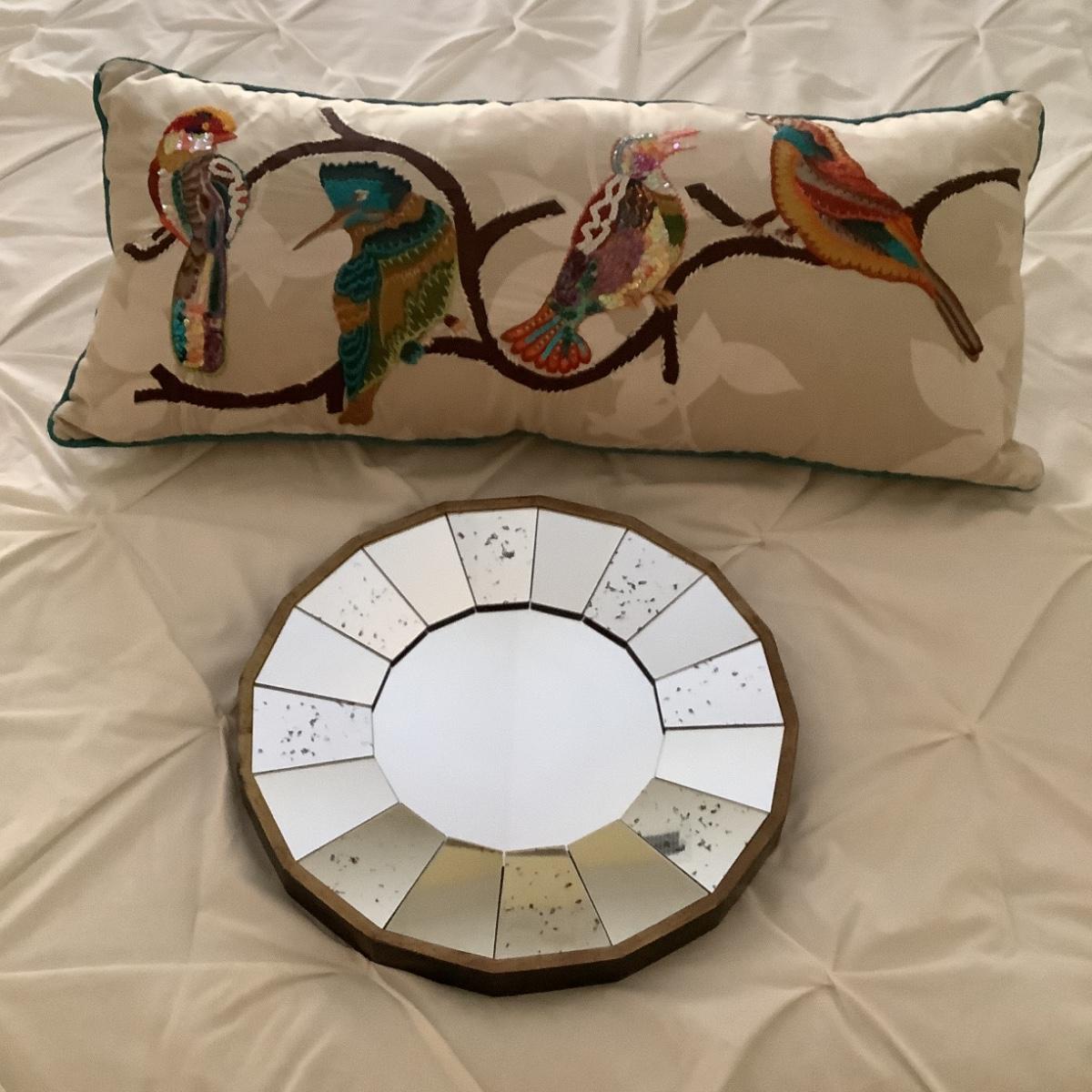 Bird pillow has some fading on back from window seat measuring 28" x 13"