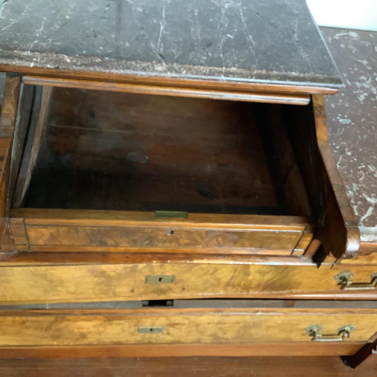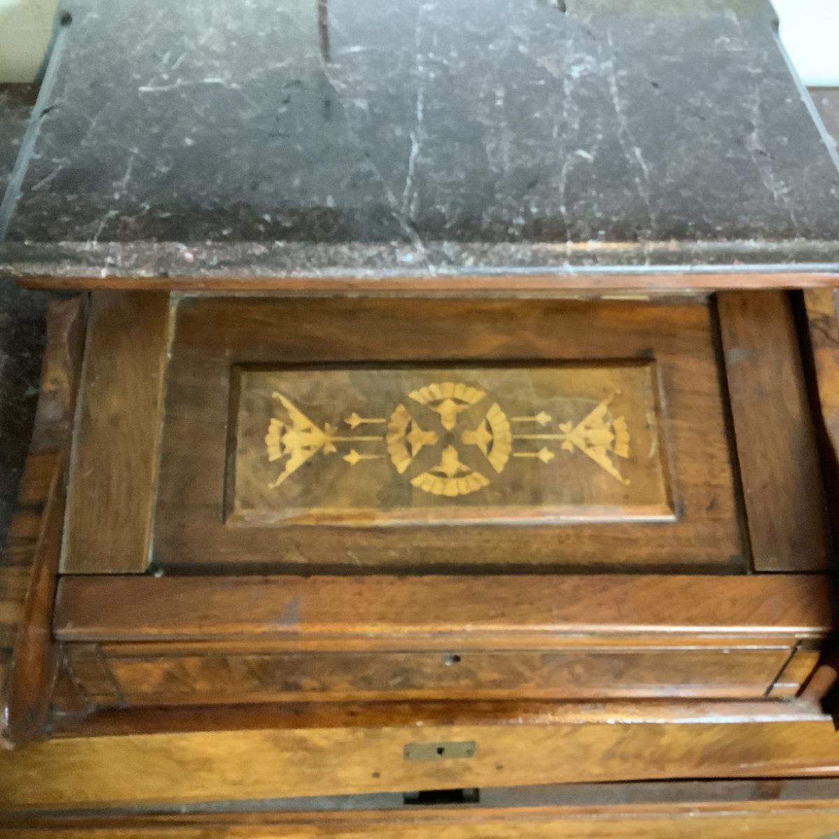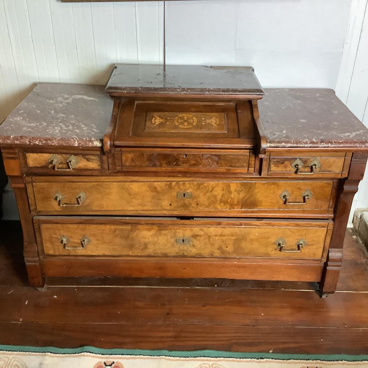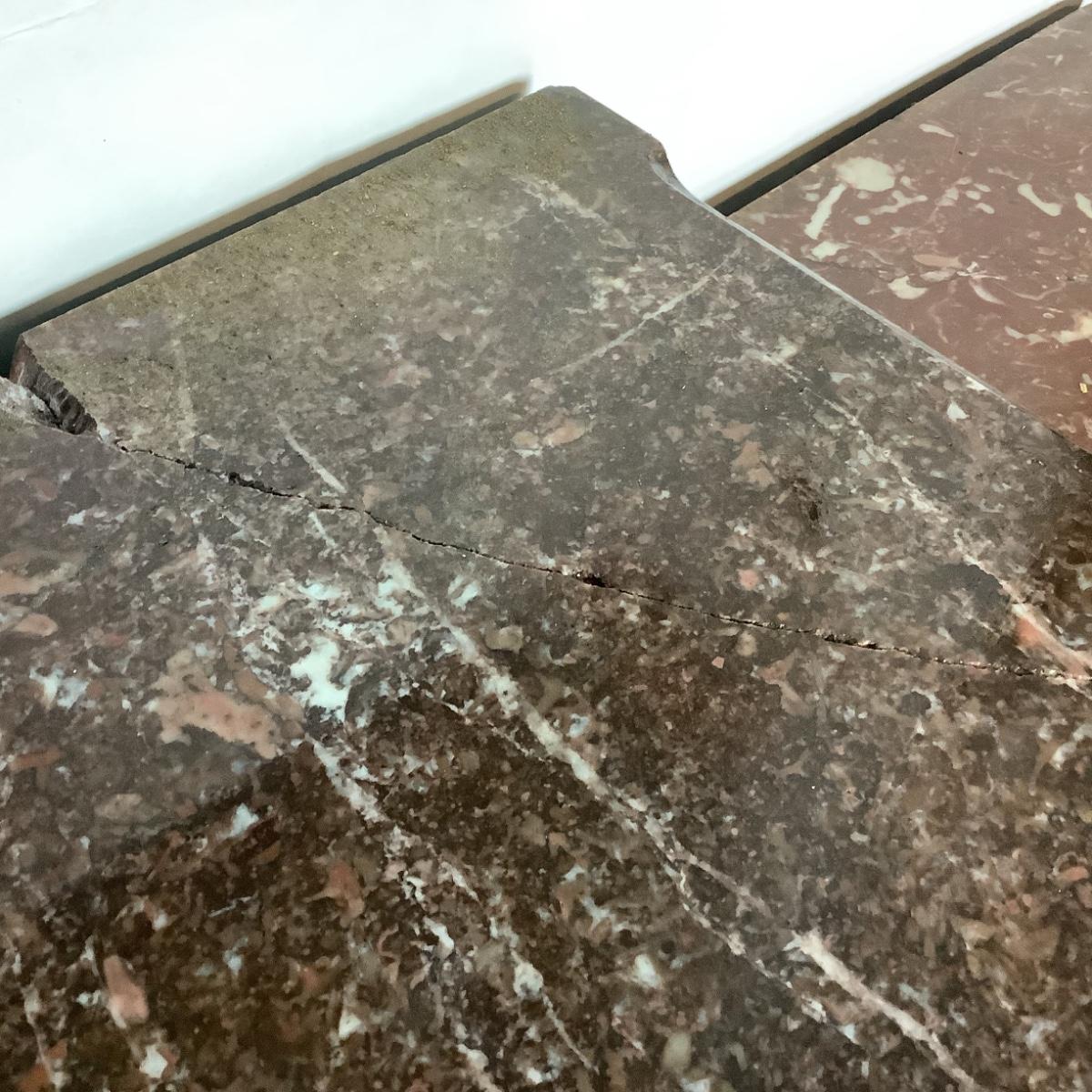 Two side pieces of marble in very good condition, however top center piece has noticeable repair marks and very slight damage.