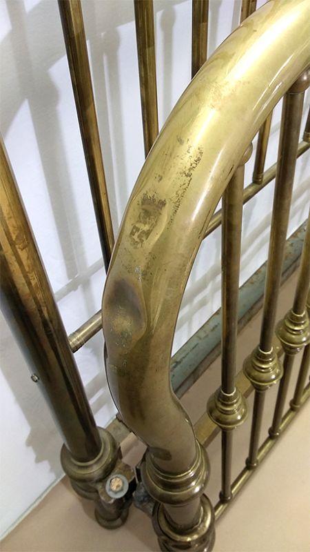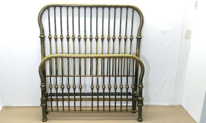 Brass bed frame, full size? Dents and missing slate, in found as condition