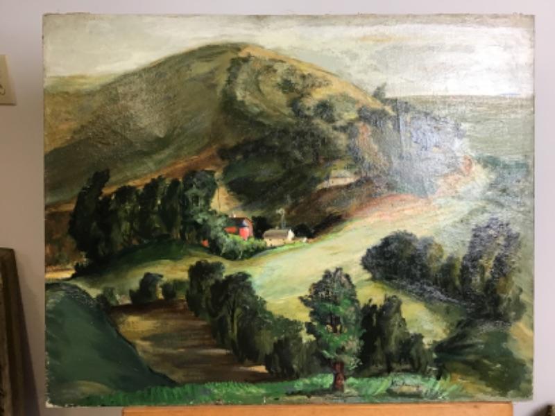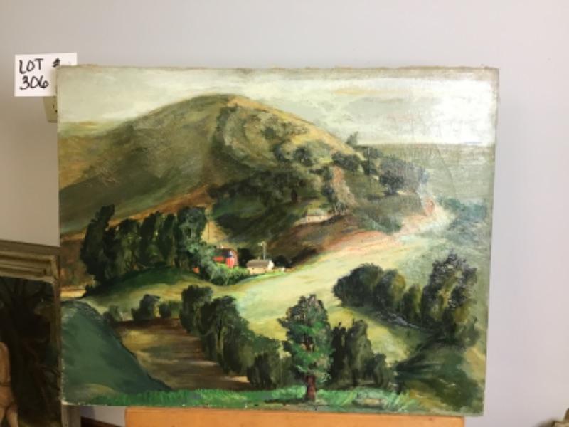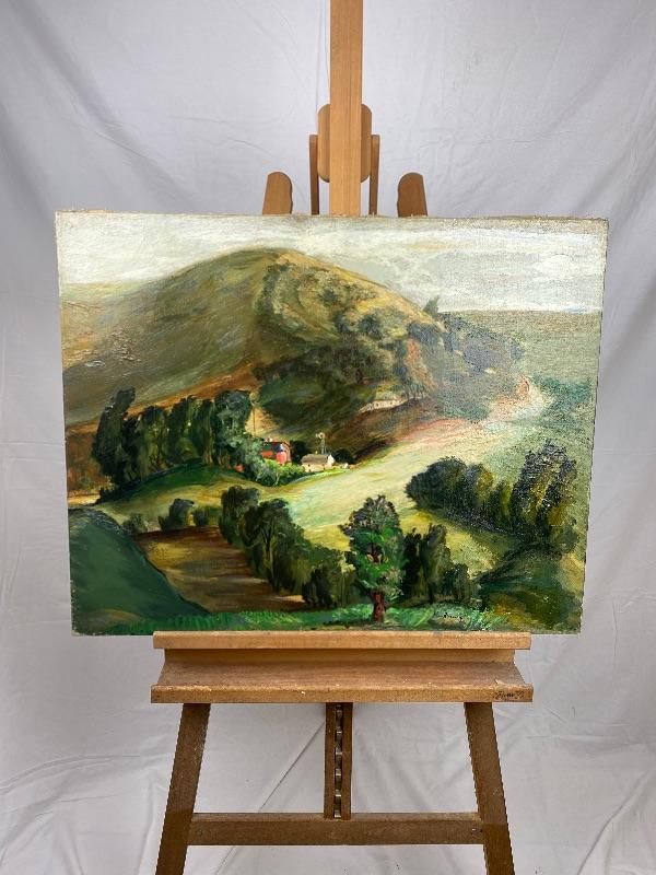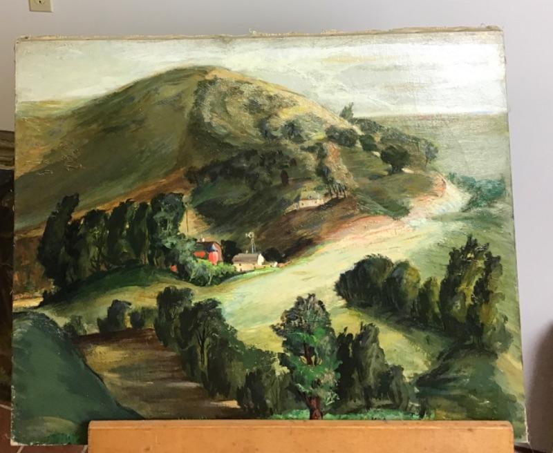 A signed original oil painting by Glen Ranney on stretched canvas of windmill in the valley, measures 24” T x 30” W