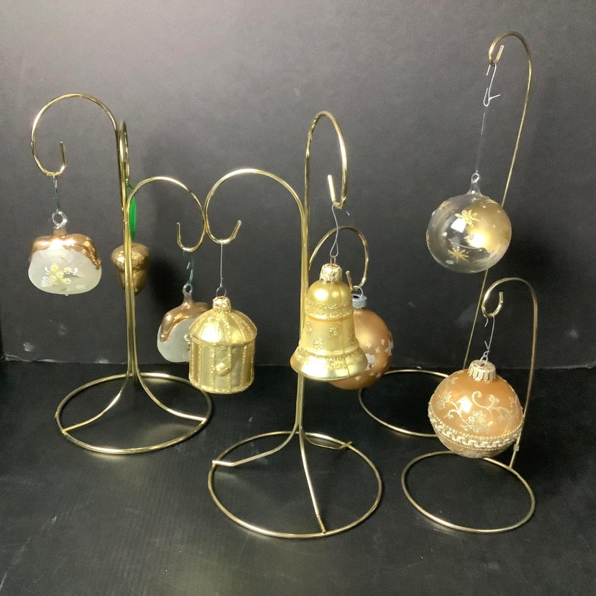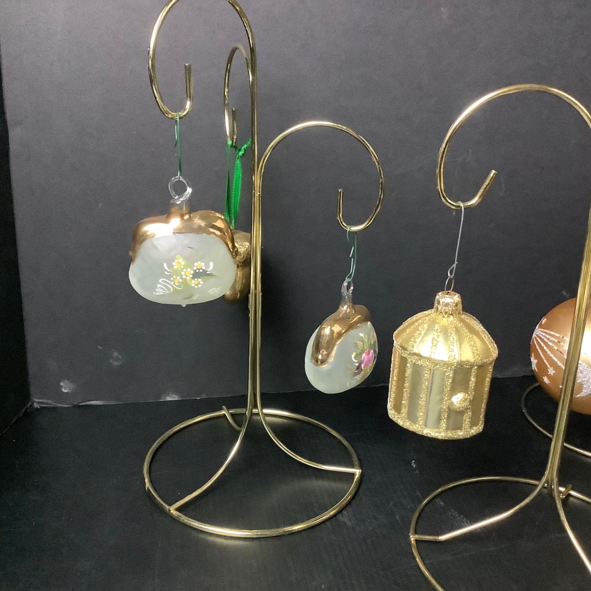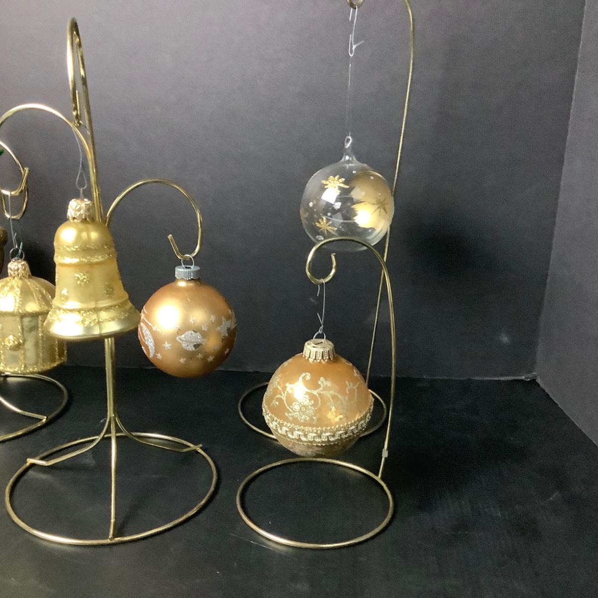 There is 1 golde vintage shiny brite ornament, several hand blown and glass ornaments. There are 8 ornaments in the lot.