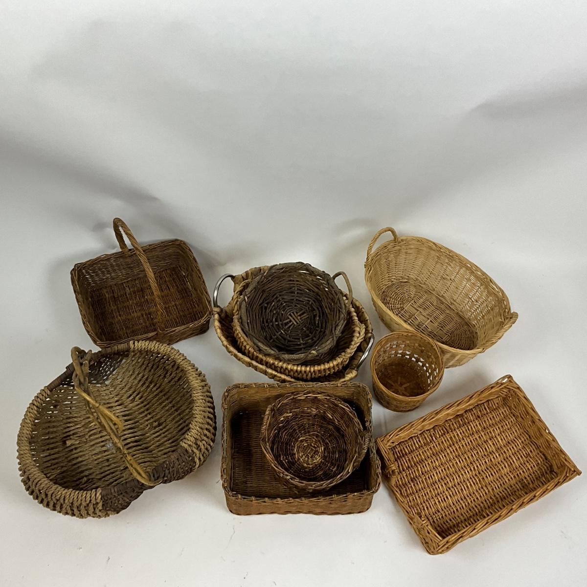 Assorted baskets of various sizes, one basket has a twig handle.