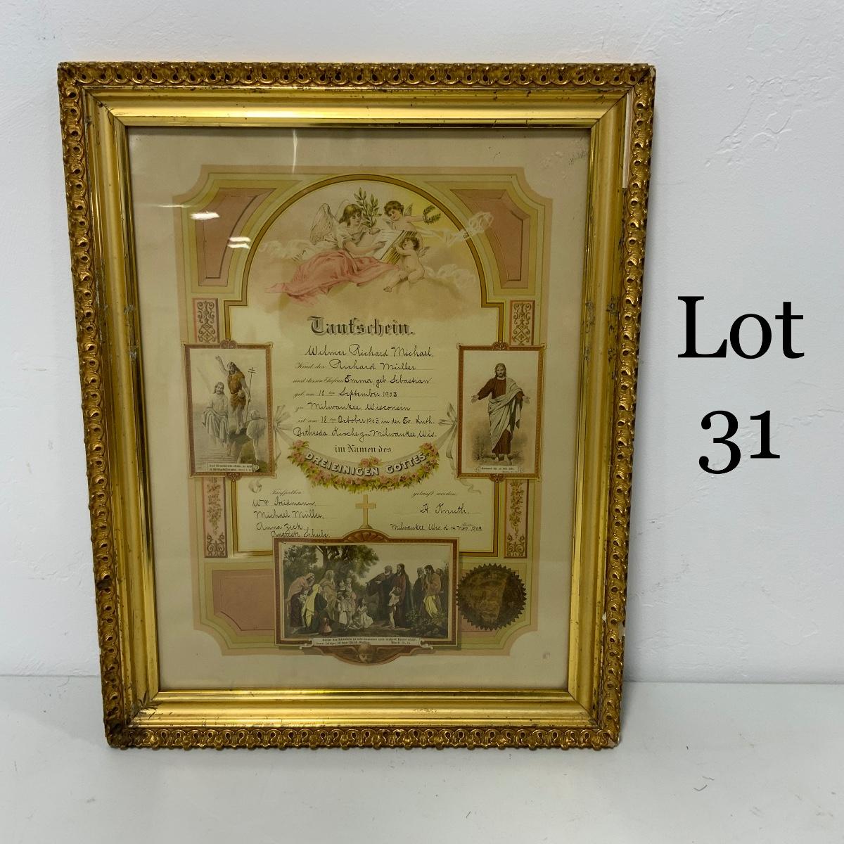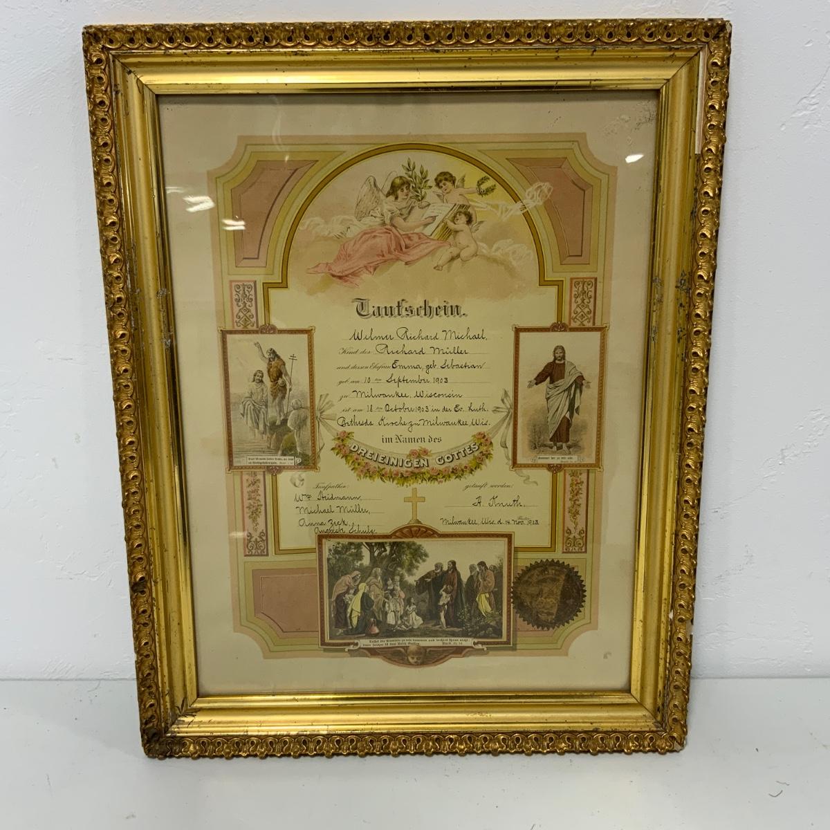 A lovely piece of History from Milwaukee, Wisconsin. A beautifully framed Baptismal Certificate from November of 1903. Frame shows some wear from years of display and no doubt, many moves. Frame measures 19 1/2” x 15.5”. Please see photos for details and condition. ::: Shipping is NOT available on this lot. If you have any questions regarding this lot please contact the auctioneer either via this website, by direct email or by phone. PICK UP TIMES and other important information can be found in the TERMS and DESCRIPTION of the auction. Please take a look for pertinent information. Thanks!