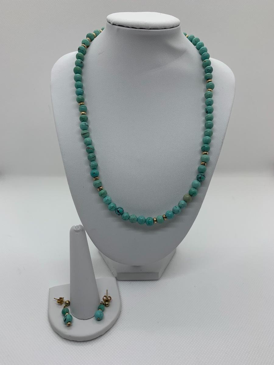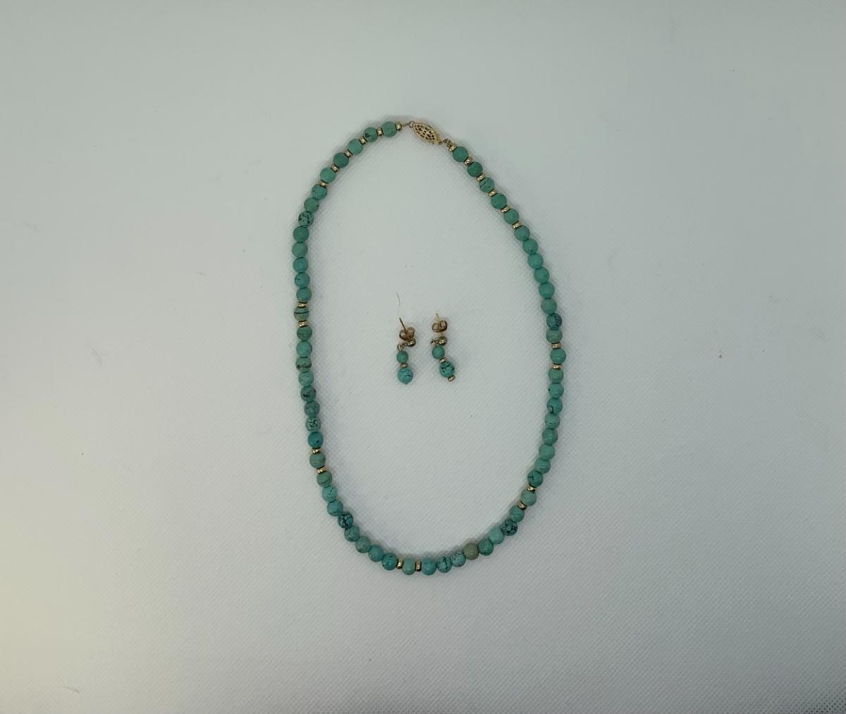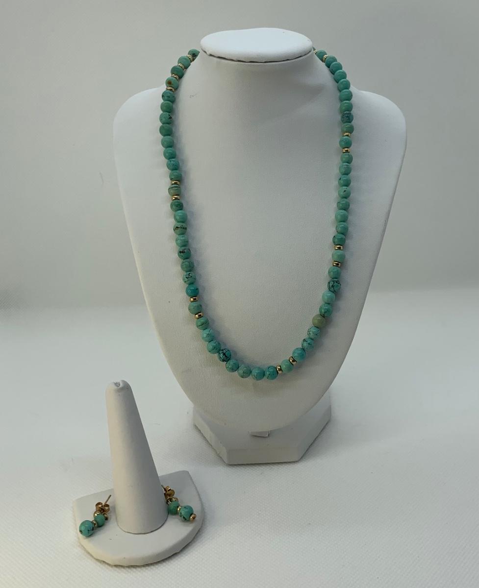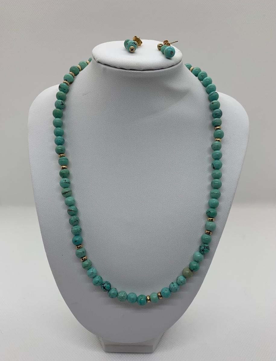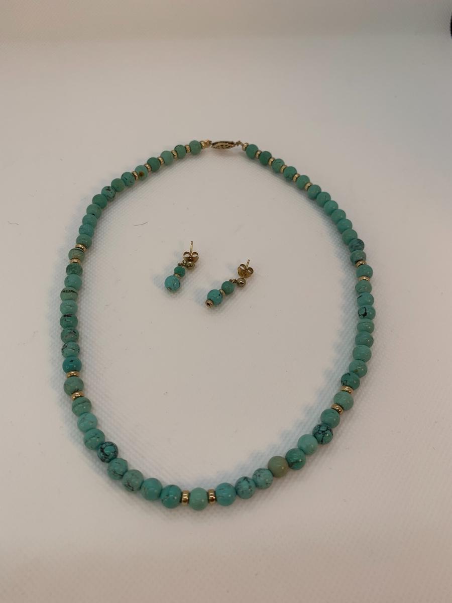 Turquoise beads with gold tone spacers with matching pierced earrings.