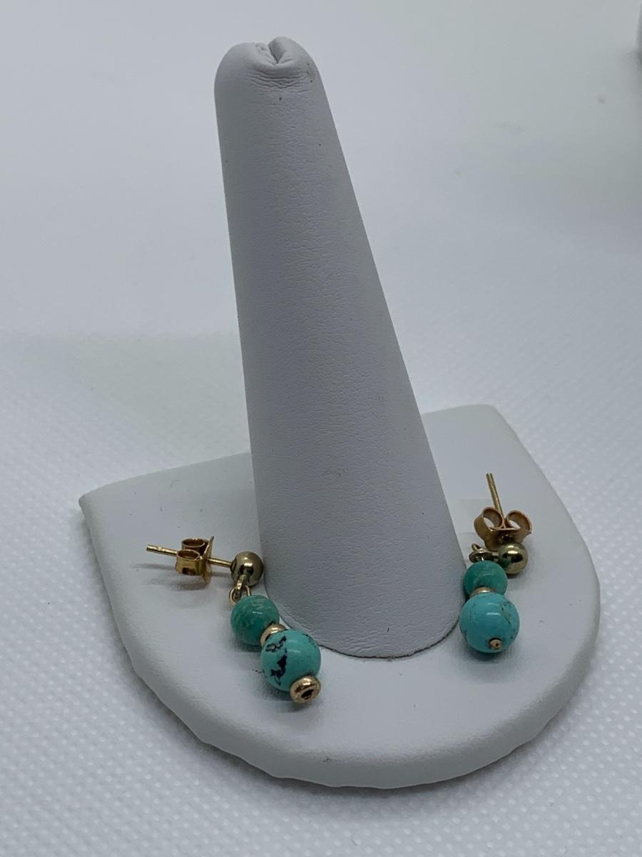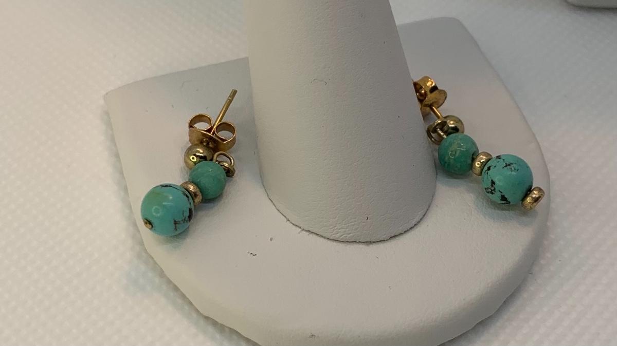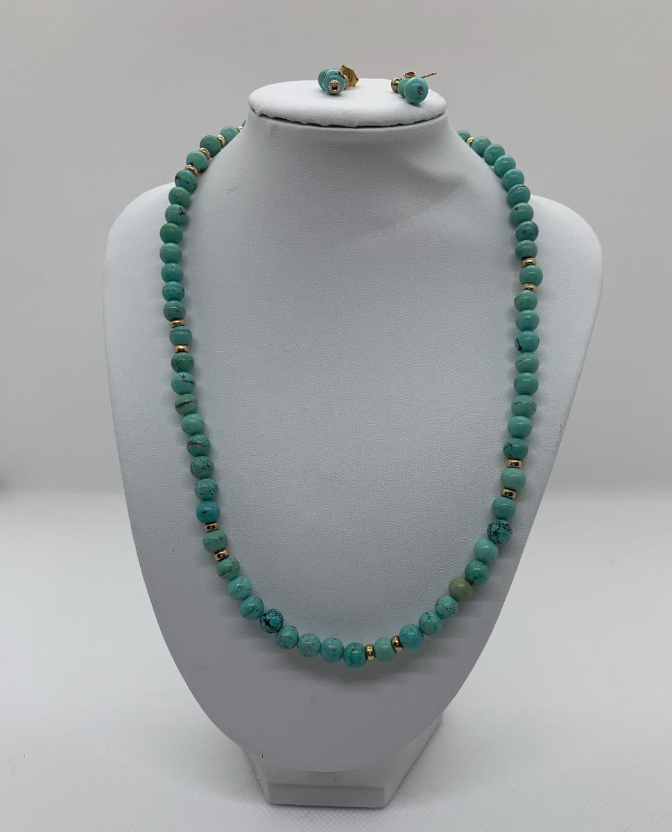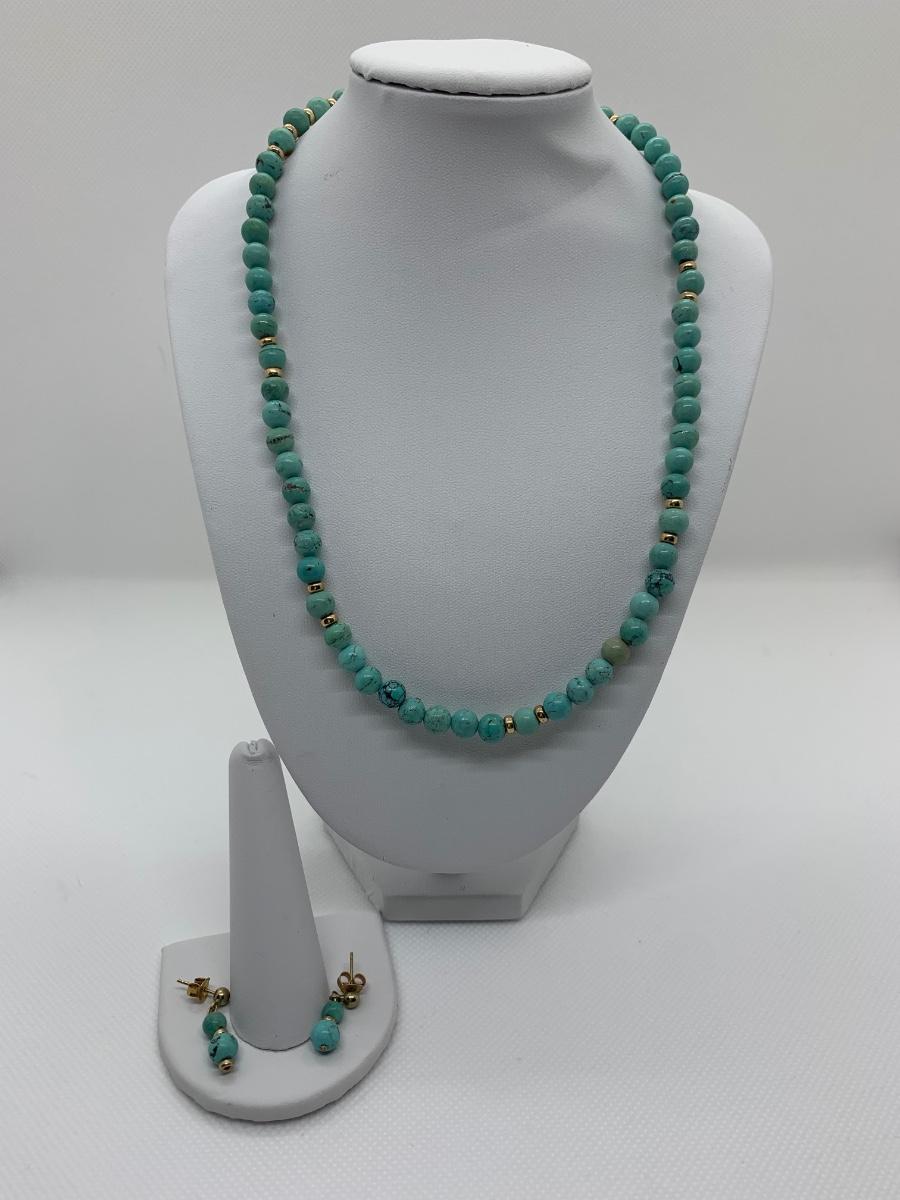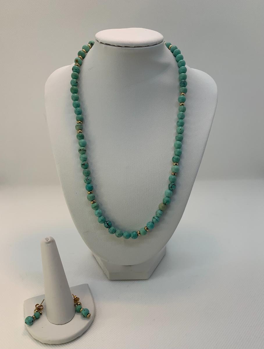 Turquoise beads with gold tone spacers with matching pierced earrings.