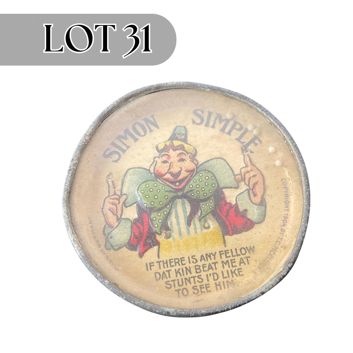 One antique small hand held game Simon Simple 1904 Germany. Please see photos for details and condition. Any condition statement is given as a courtesy to a client, is an opinion, and should not be treated as a statement of fact. Reference to condition written, oral or within a condition report shall not be regarded as a full account of condition and may not include all defects, alterations, or restorations. Absence of a condition report does not imply a lot is flawless or lacking imperfections or damage. Katherine’s Auction & Appraisal Service shall have no responsibility for any error or omission. Returns shall not be accepted on the basis of condition. ::: Shipping is available on this lot. If you require shipping you must let us know at the close of the auction. We will coordinate with you after the item has been won. Shipping fees will include insurance up to or exceeding the value of all items being mailed. If you have any questions regarding this lot please contact the auctioneer either via this website, by direct email or by phone. PICK UP TIMES and other important information can be found in the TERMS and DESCRIPTION of the auction. Please take a look for pertinent information. Thanks!