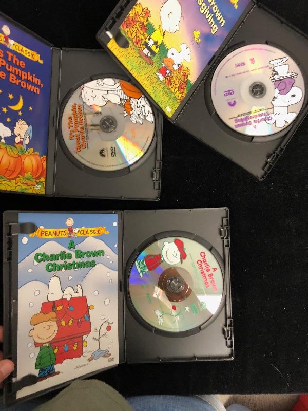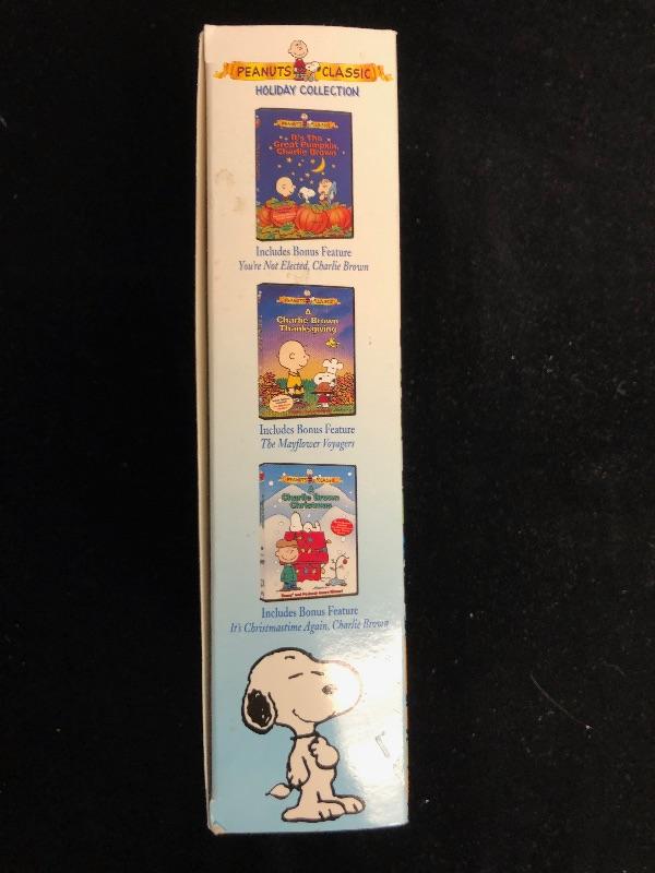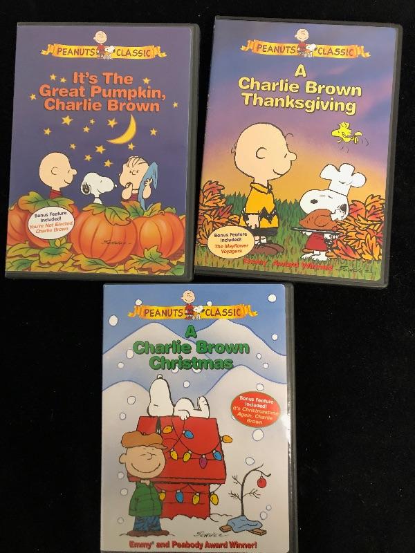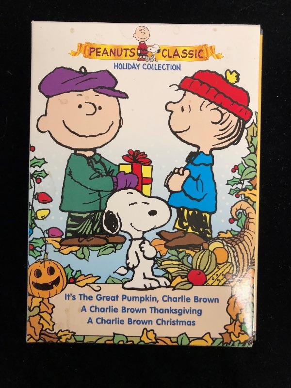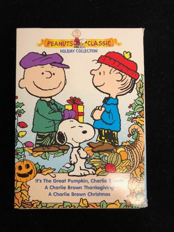 Box set includes it's the great pumpkin, a Charlie Brown thanksgiving, a Charlie Brown Christmas.