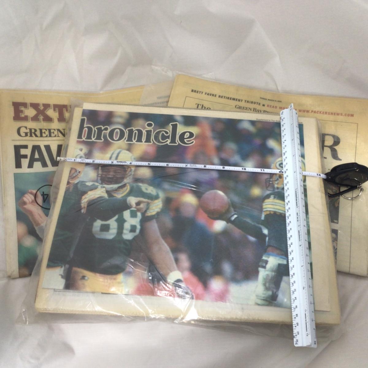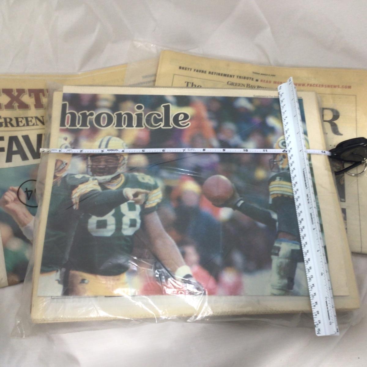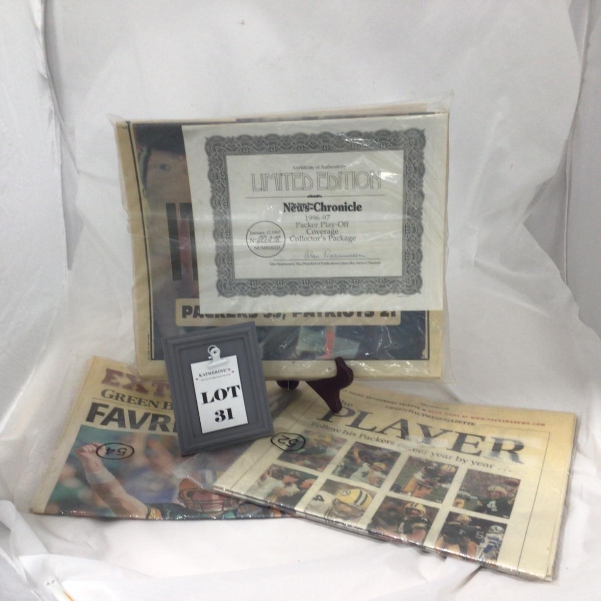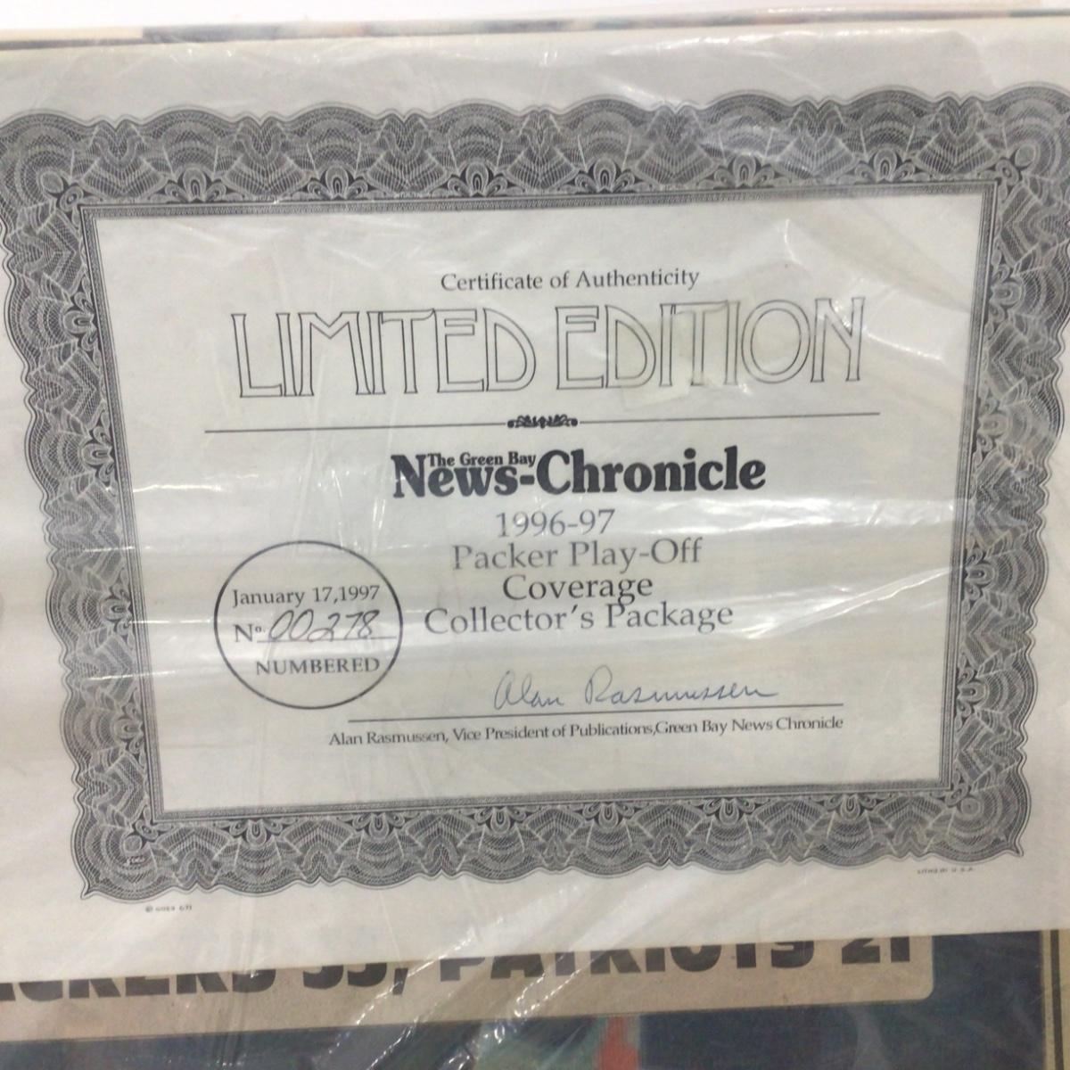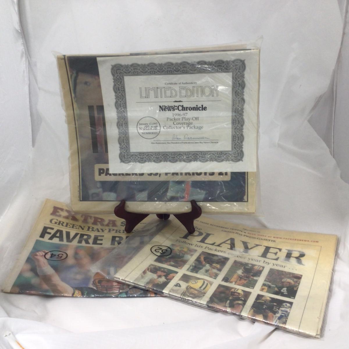 1996-1997 Packers playoff coverage package Signed with Certificate of Authenticity. Two football newspapers. Please see photos for details and condition. ::: Shipping is available on this lot. If you require shipping you must let us know at the close of the auction. We will coordinate with you after the item has been won. Shipping fees will include insurance up to or exceeding the value of all items being mailed. If you have any questions regarding this lot please contact the auctioneer either via this website, by direct email or by phone. PICK UP TIMES and other important information can be found in the TERMS and DESCRIPTION of the auction. Please take a look for pertinent information. Thanks!