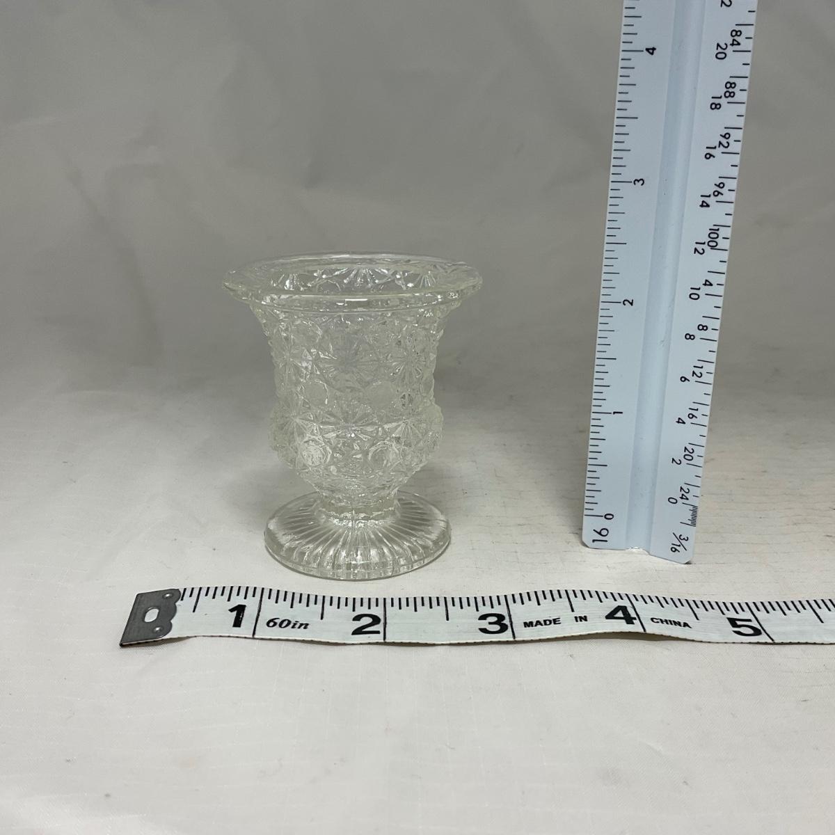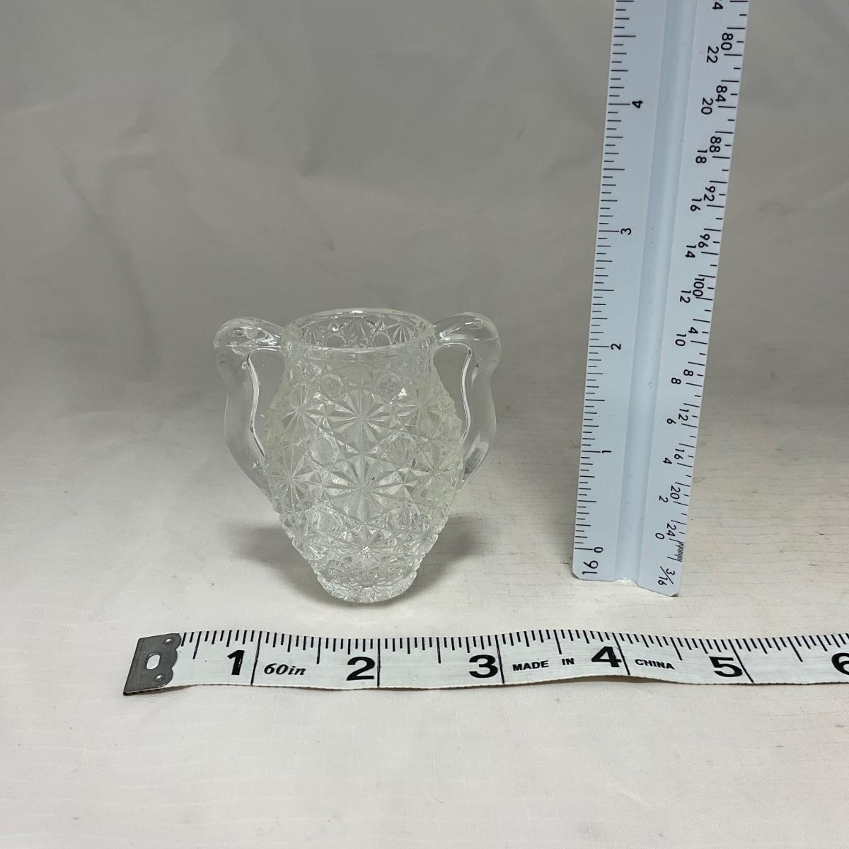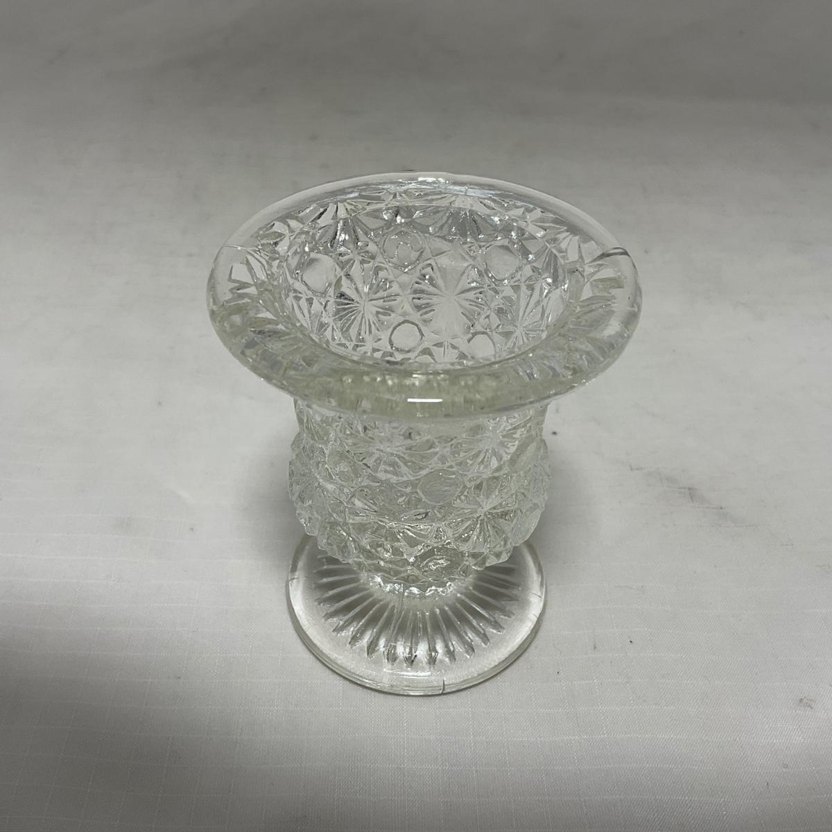 Two small clear glass miniature vases, beautifully designed. Please see photos for details and condition. ::: Shipping is available on this lot. If you require shipping you must let us know at the close of the auction. We will coordinate with you after the item has been won. Shipping fees will include insurance up to or exceeding the value of all items being mailed. If you have any questions regarding this lot please contact the auctioneer either via this website, by direct email or by phone. PICK UP TIMES and other important information can be found in the TERMS and DESCRIPTION of the auction. Please take a look for pertinent information. Thanks!