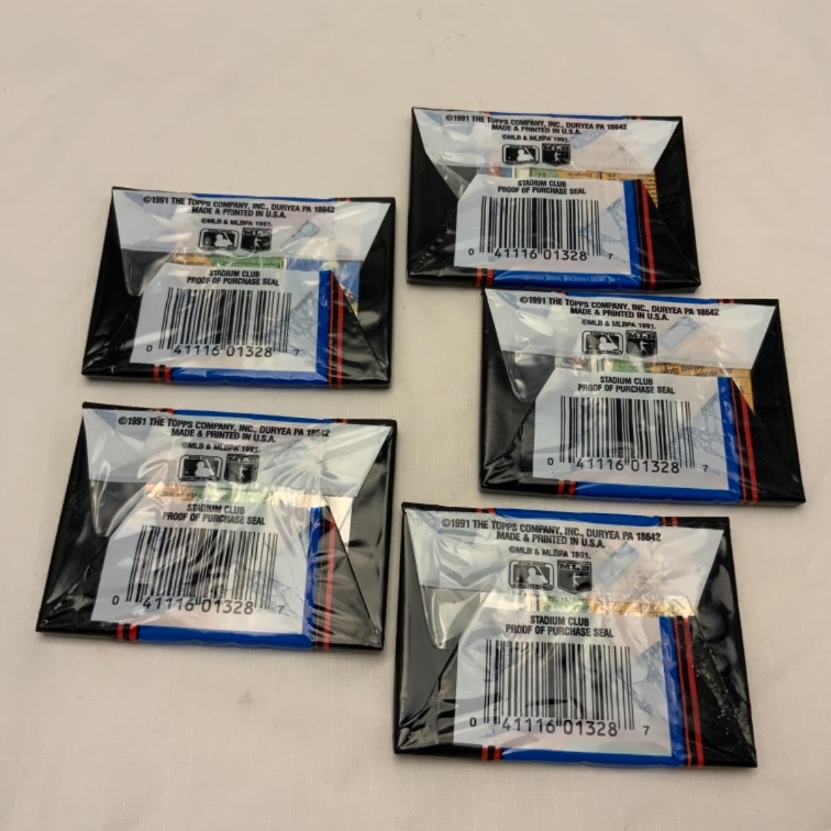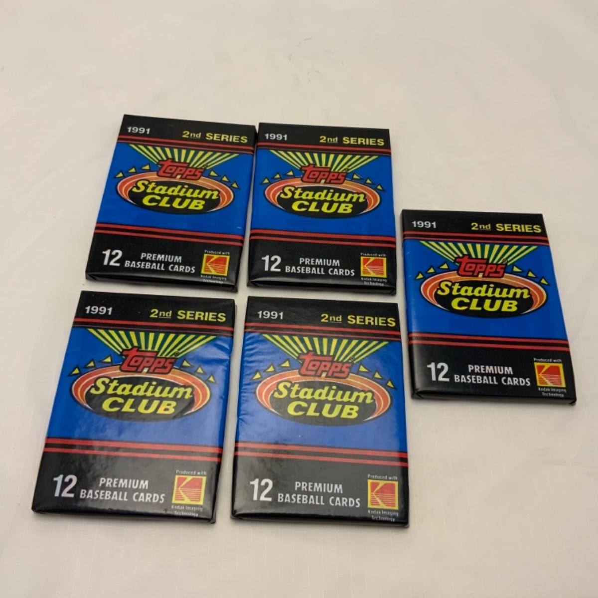 Five Packs of 1991 TOPPS Stadium Club Cards. Unopened. From the Second Series. Each pack contains 12 Cards. A Notable card to look for is the Nolan Ryan Tuxedo Card. Please see photos for details and condition. ::: Shipping is available on this lot. If you require shipping you must let us know at the close of the auction. We will coordinate with you after the item has been won. Shipping fees will include insurance up to or exceeding the value of all items being mailed. If you have any questions regarding this lot please contact the auctioneer either via this website, by direct email or by phone. PICK UP TIMES and other important information can be found in the TERMS and DESCRIPTION of the auction. Please take a look for pertinent information. Thanks!