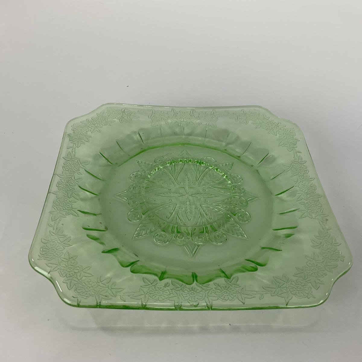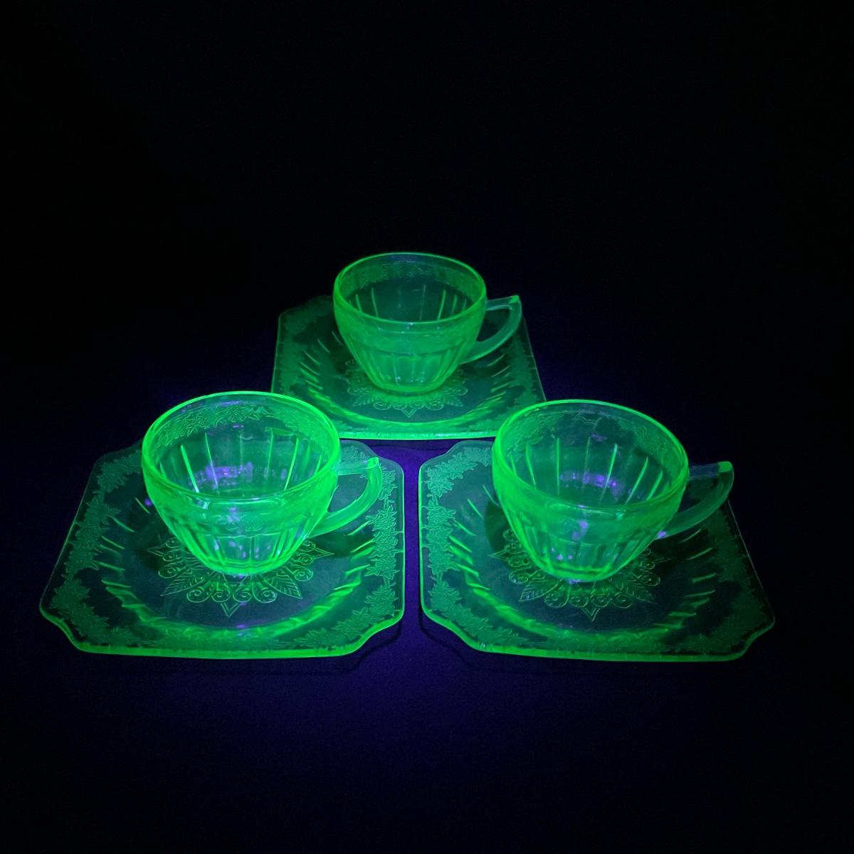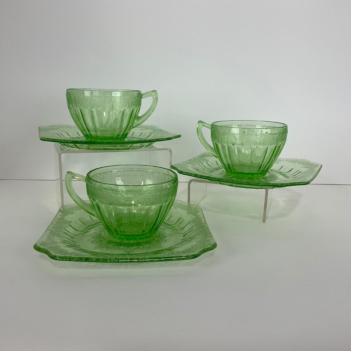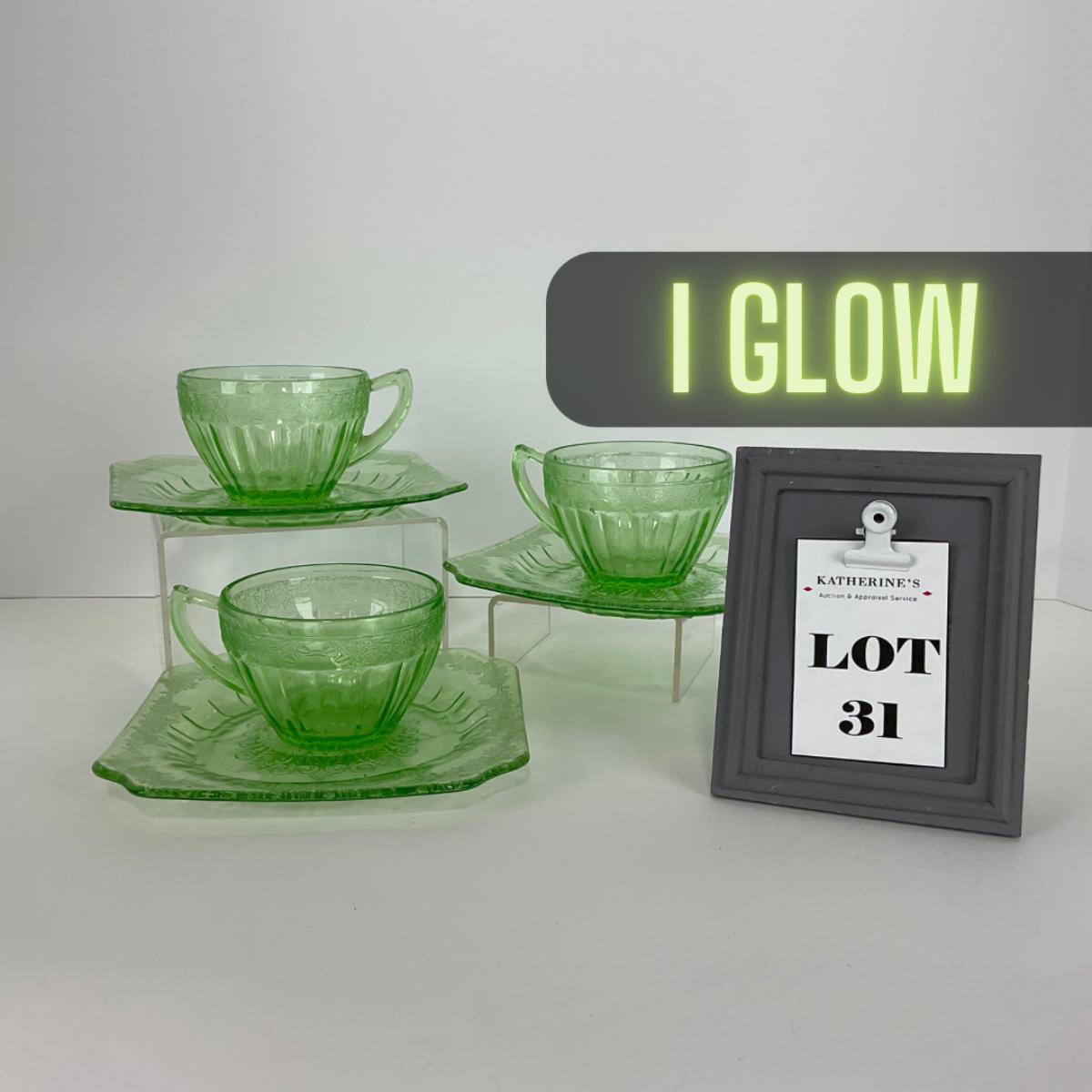 Three cups and three saucers in the Uranium green depression glass Adam Jeanette Glass Co. (1932-1933) These pieces DO GLOW under Black light! Please see photos for details and condition. ::: Shipping is available on this lot. If you require shipping you must let us know at the close of the auction. We will coordinate with you after the item has been won. Shipping fees will include insurance up to or exceeding the value of all items being mailed. If you have any questions regarding this lot please contact the auctioneer either via this website, by direct email or by phone. PICK UP TIMES and other important information can be found in the TERMS and DESCRIPTION of the auction. Please take a look for pertinent information. Thanks!
