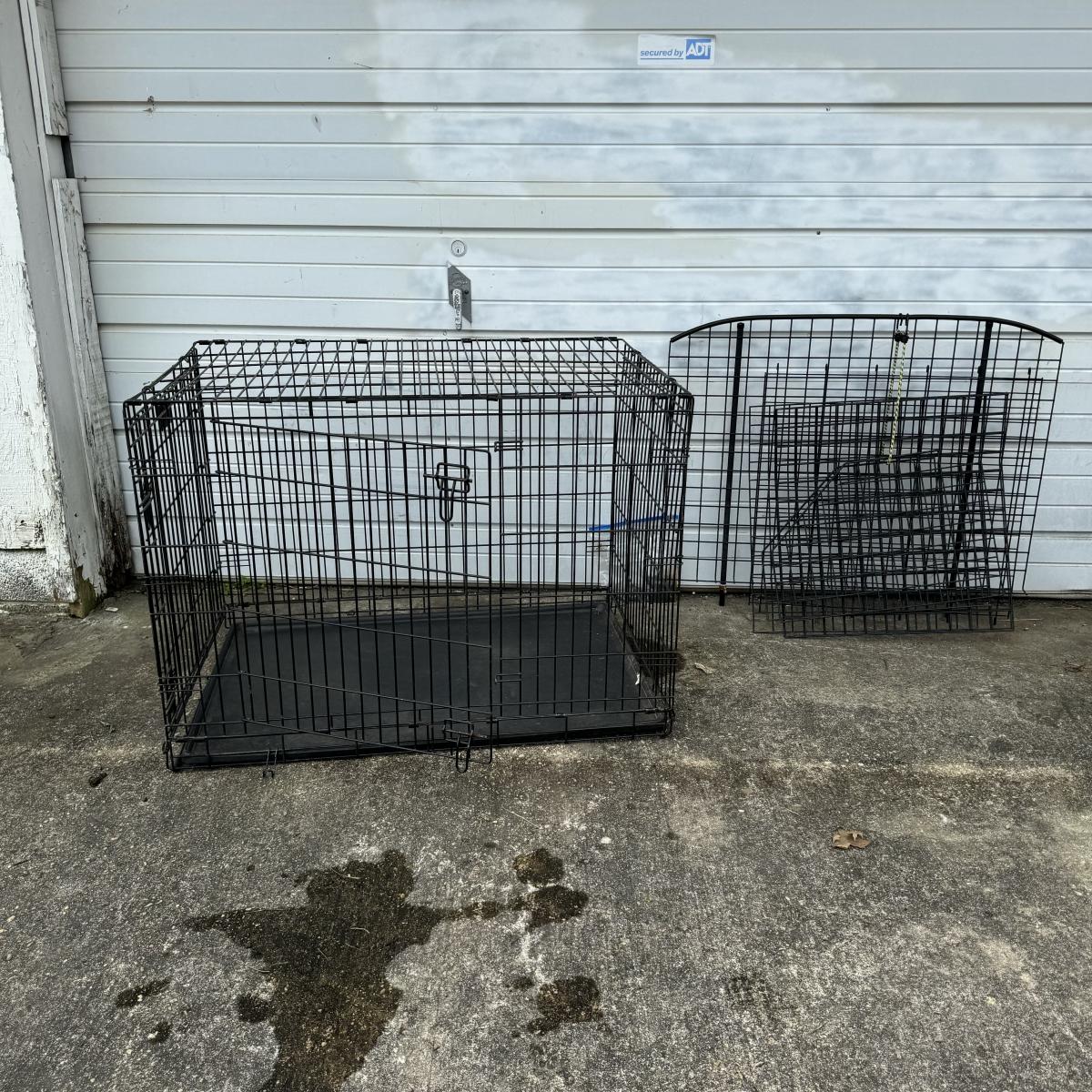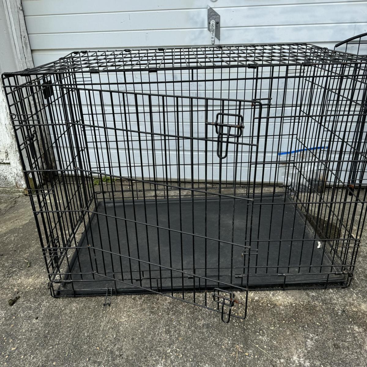 Dog kennel opens on the side and front. It measures 42.5"w x 28"d x 30.5"h-side or end opening.