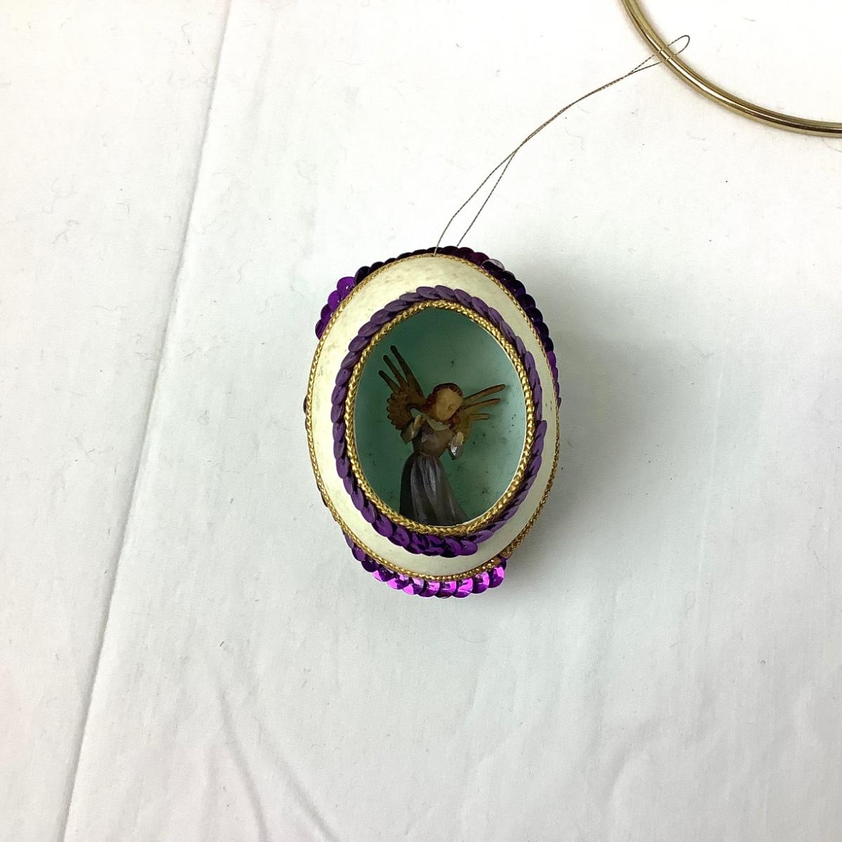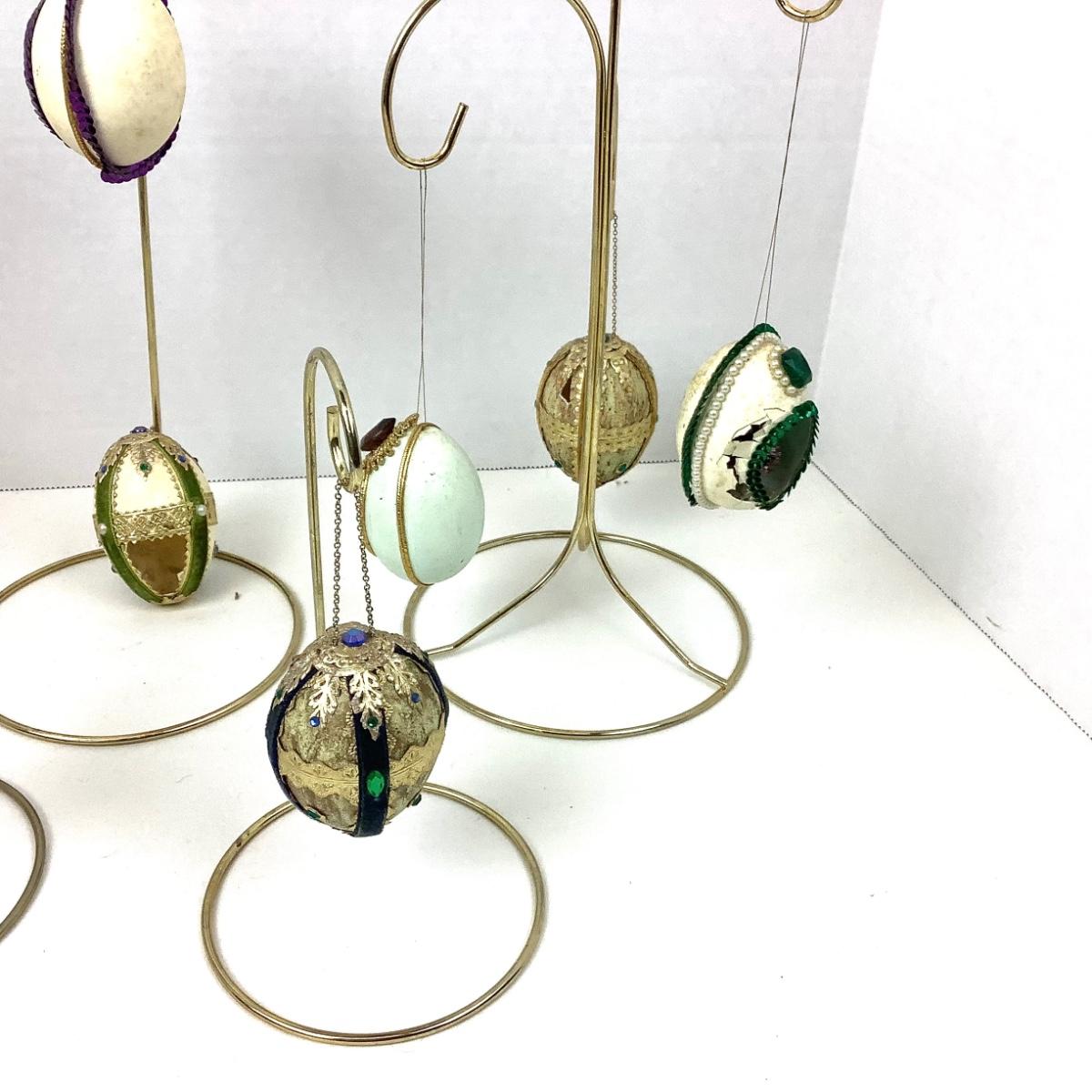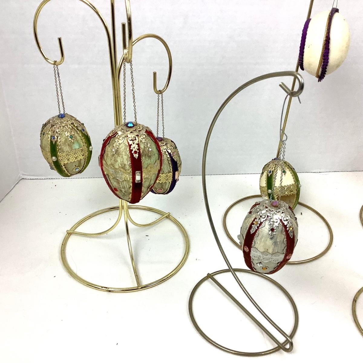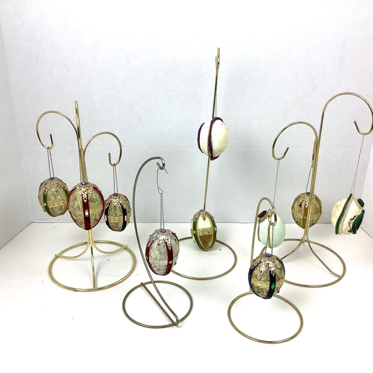 There are 11 of assorted decorations-hand blown out eggs. There are a few eggs with wear.