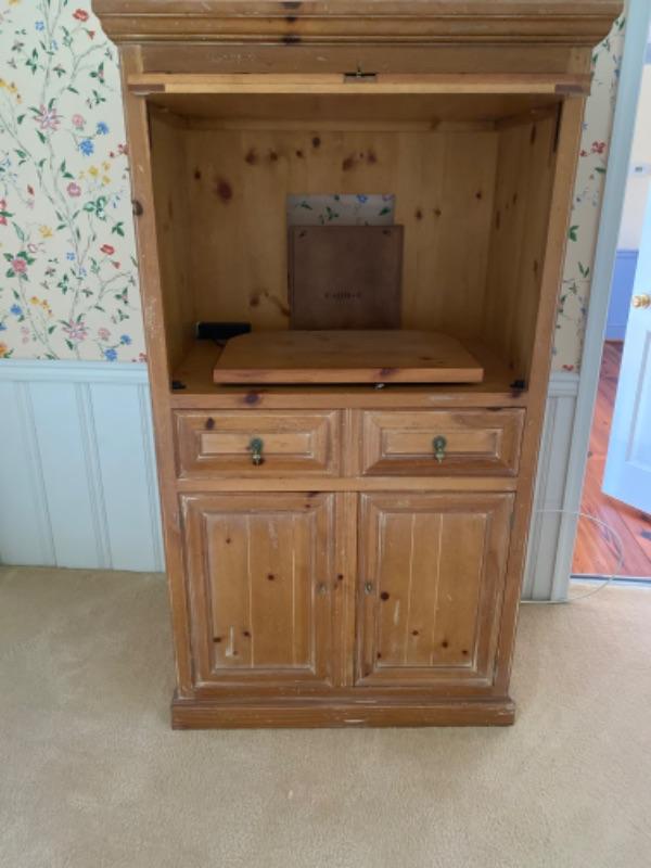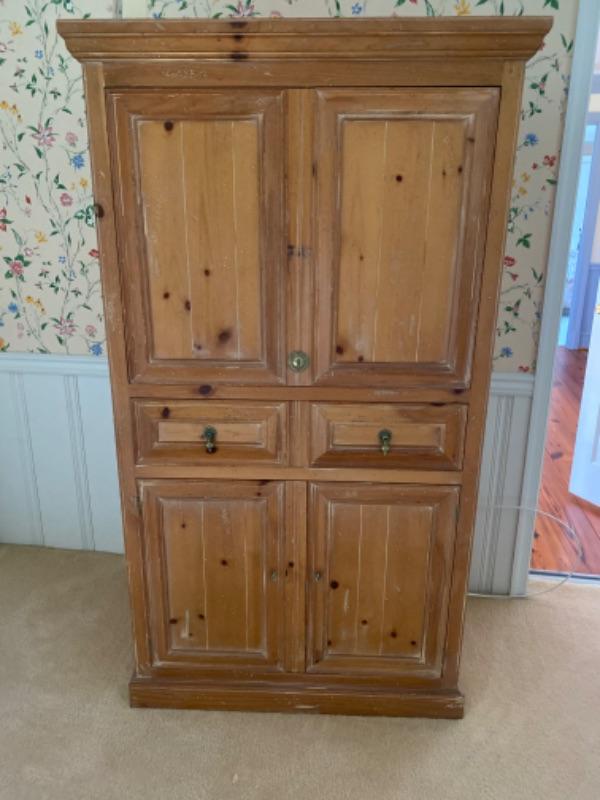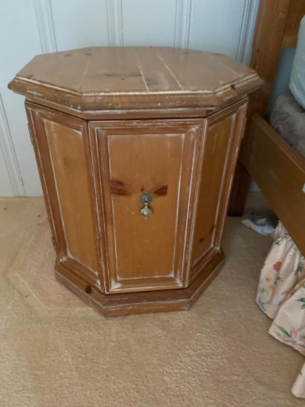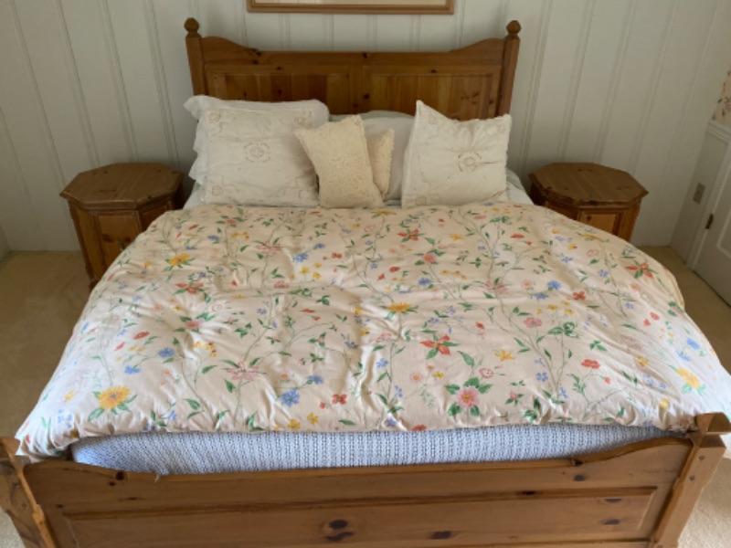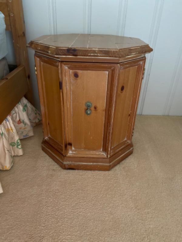 Henredon 4-piece bedroom set. This is a queen bed with a pair of matching octagon shaped nightstands and a wardrobe/ media cabinet. The cabinet measures 67.5” tall x 38” wide, 23” deep. The nightstands measure 24.5” tall x 22.5’ x 22.5”