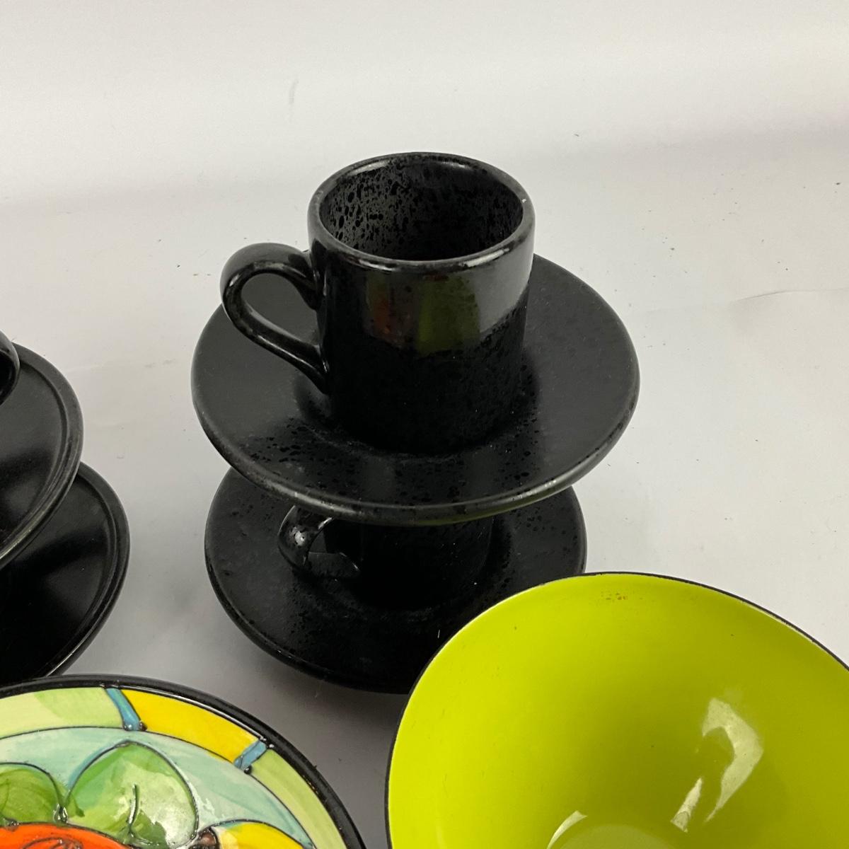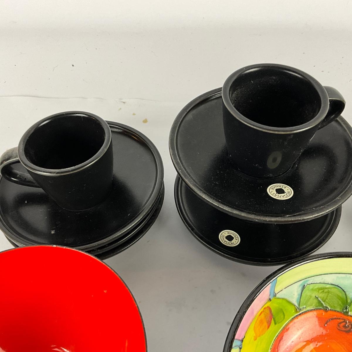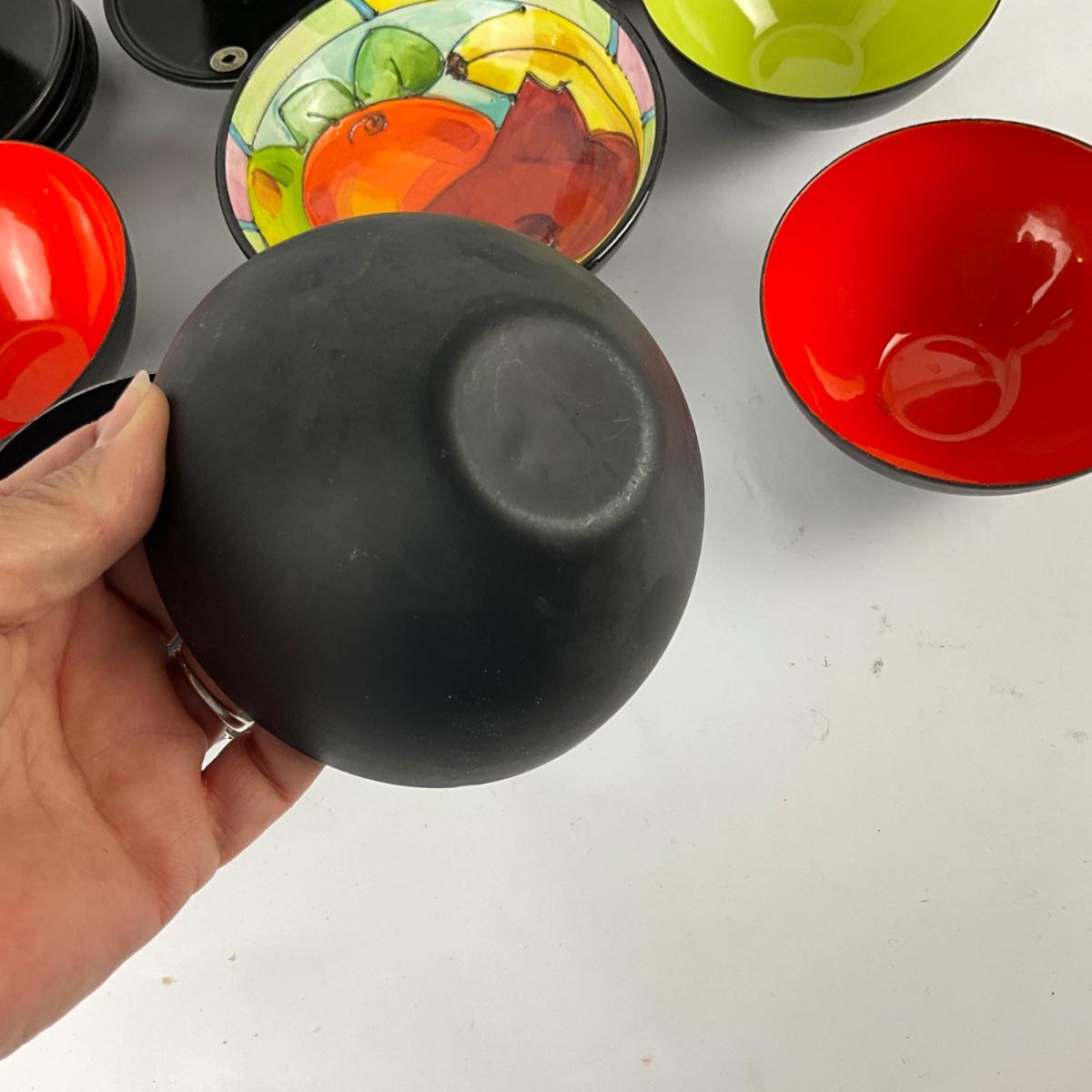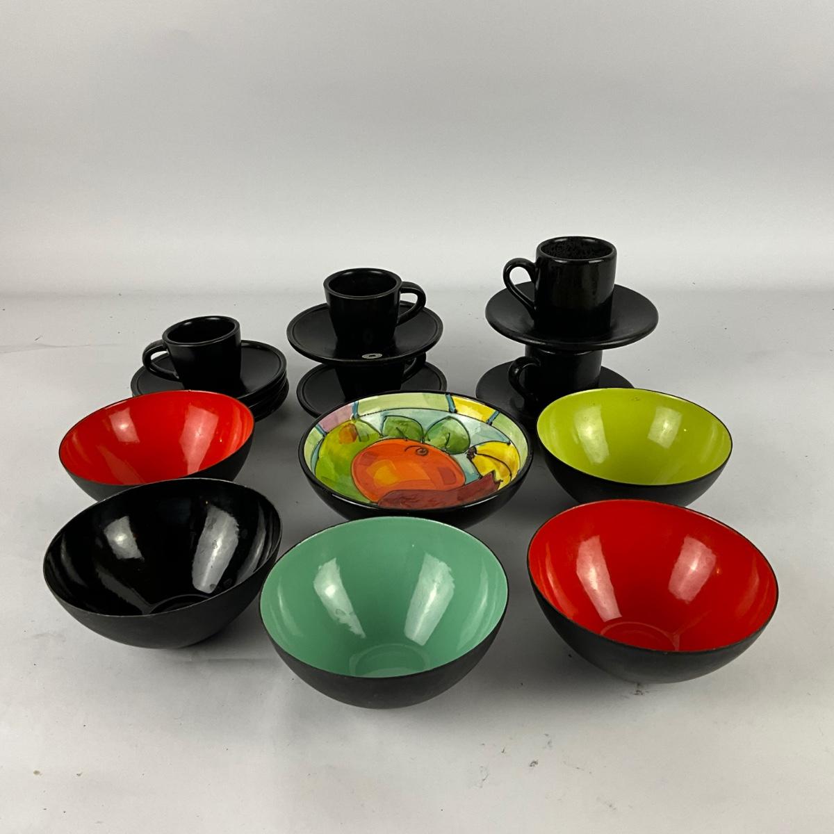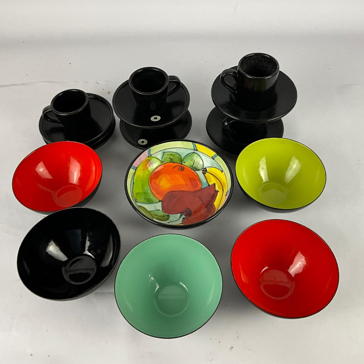 Enamel bowls measure 5" diameter , 5 cups and saucers, 2 black ,2 speckled