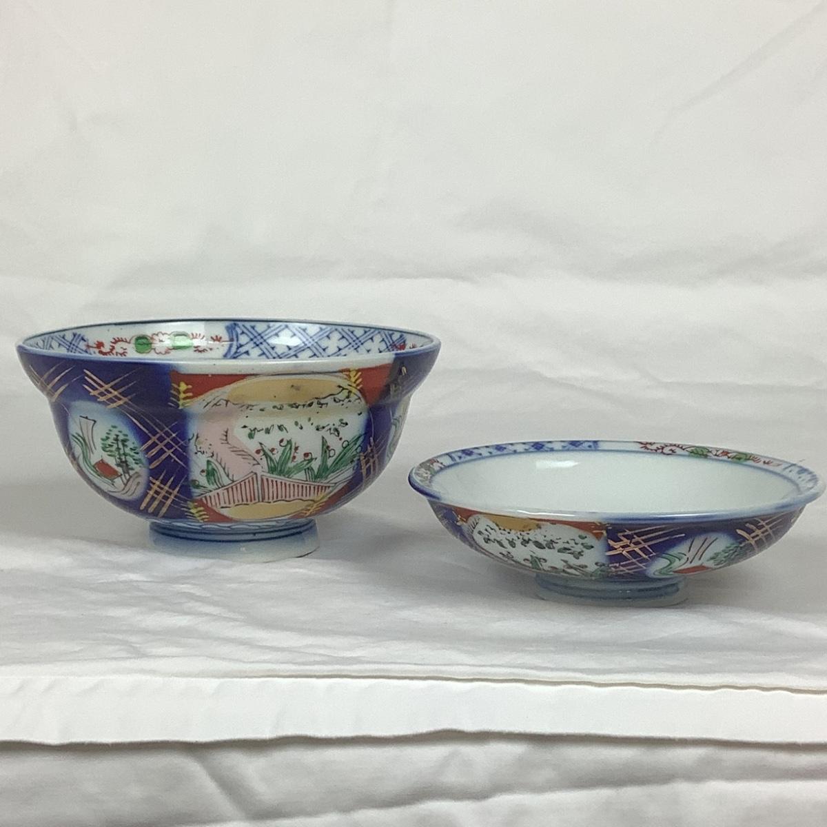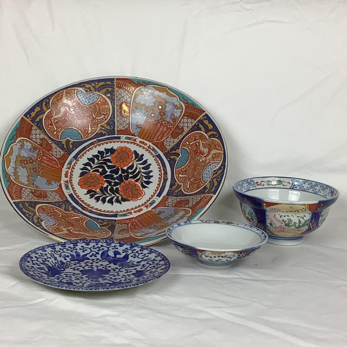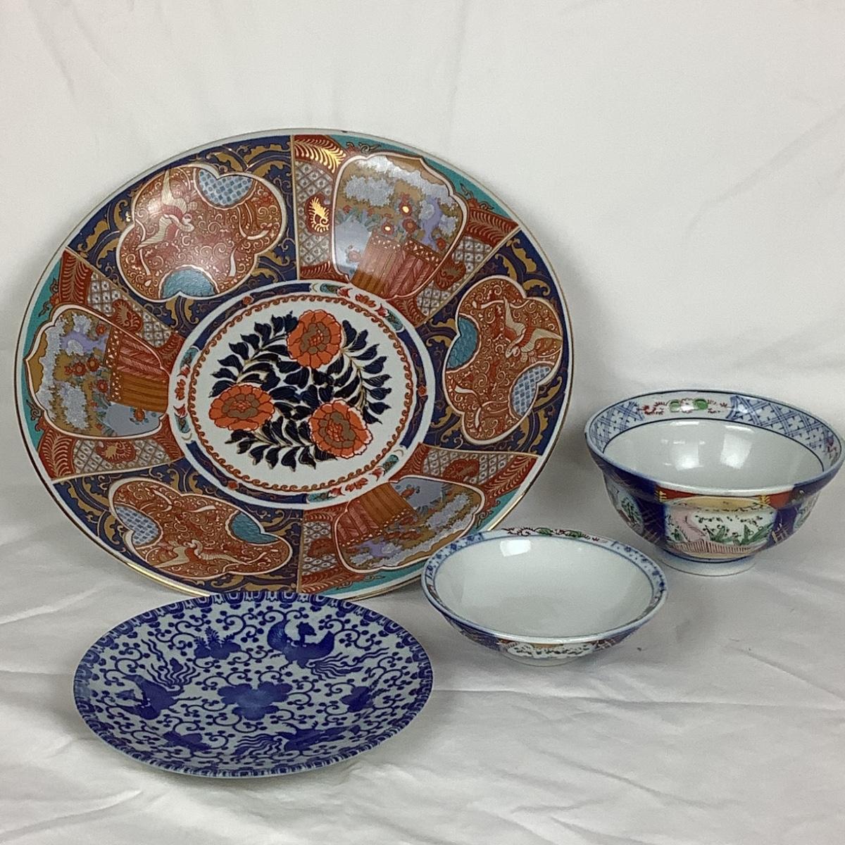 Imari Style Bowls. 14"round Andrea by Sadek Bowl, 7.25"diameter Blue Plate, 5.5" & 6"round Matching Bowls