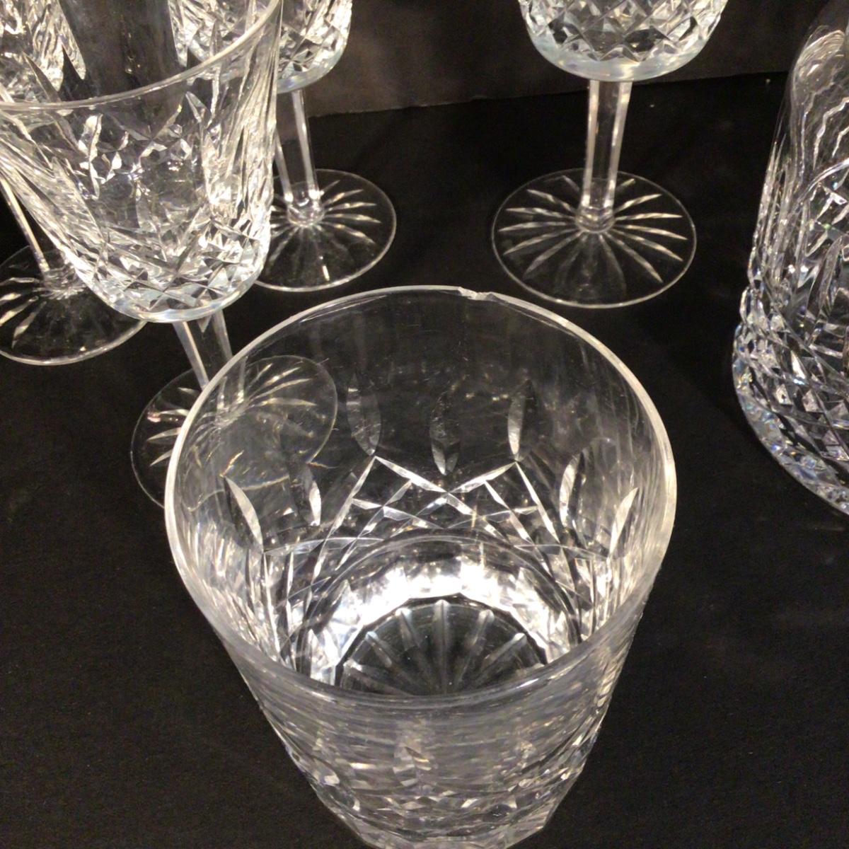 Seven waterford lismore wine glasses, one lismore old fashiond, and one waterford wine glass pattern unknown
