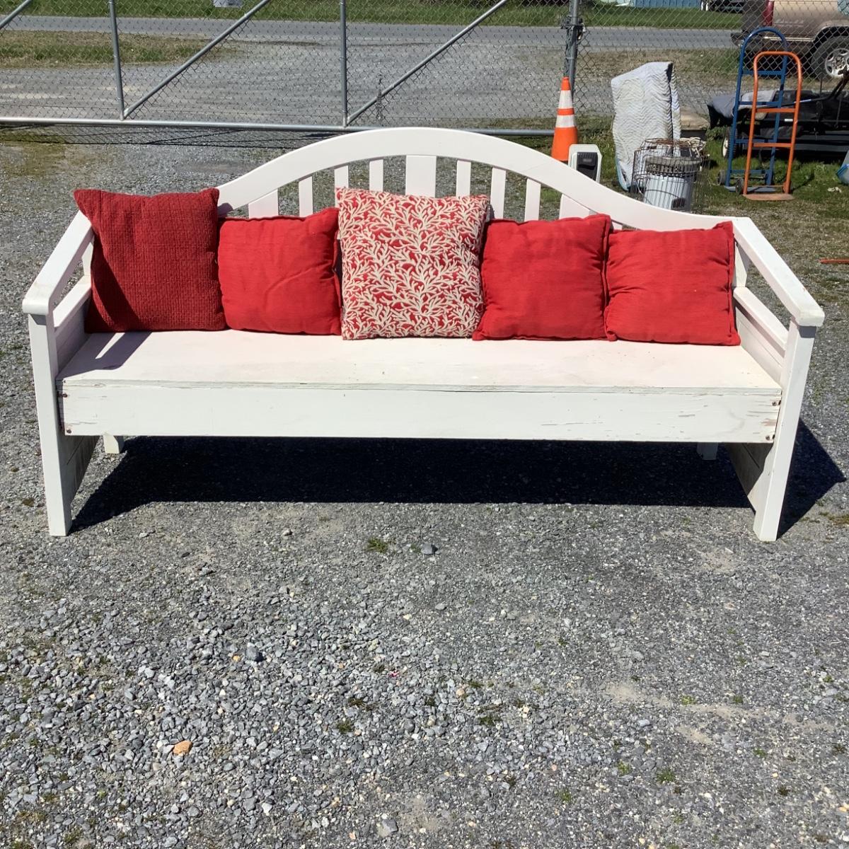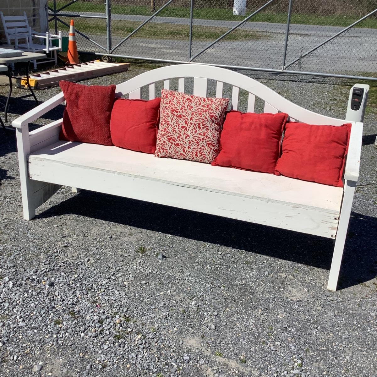 312 Large Outdoor Wood Bench with Red Throw Pillows