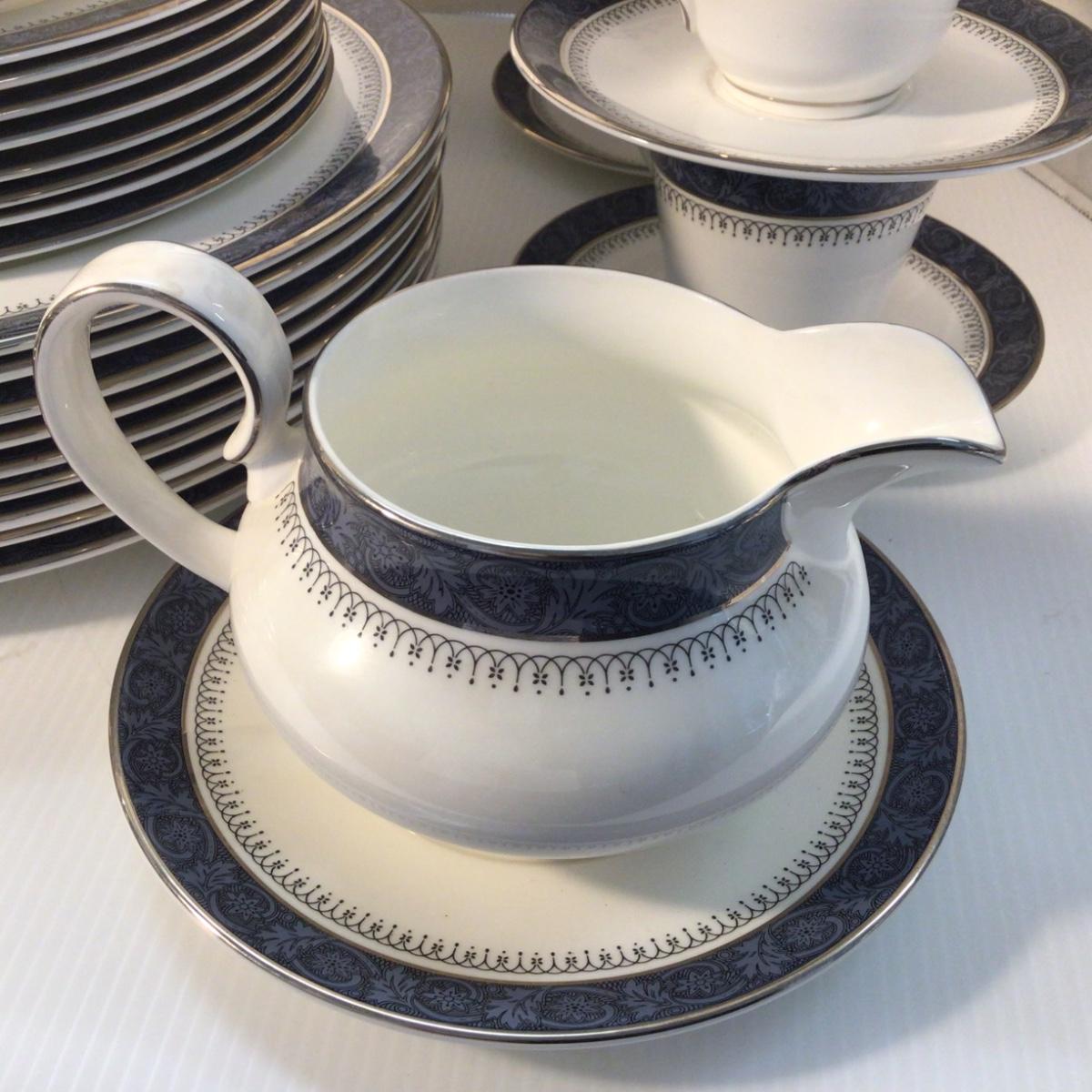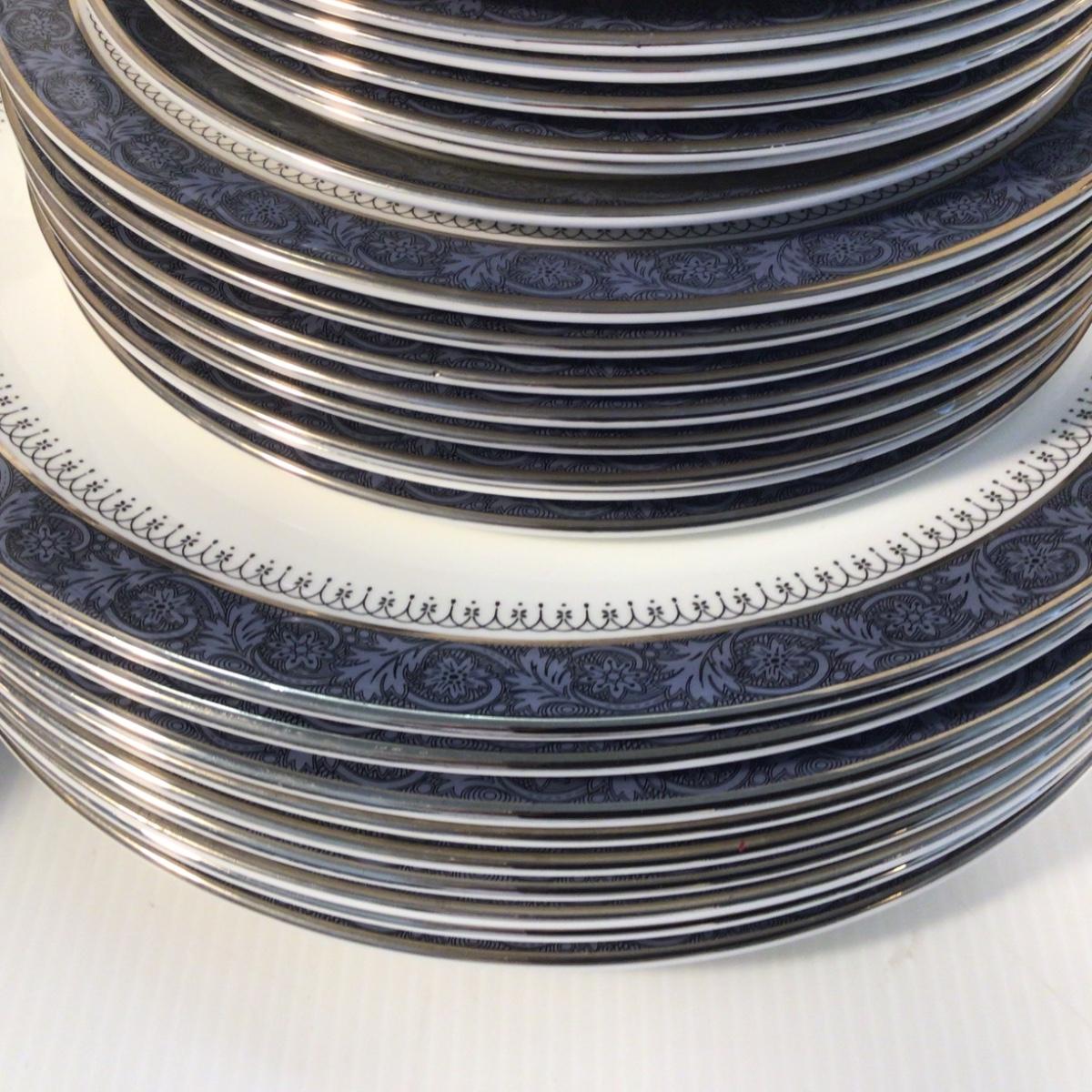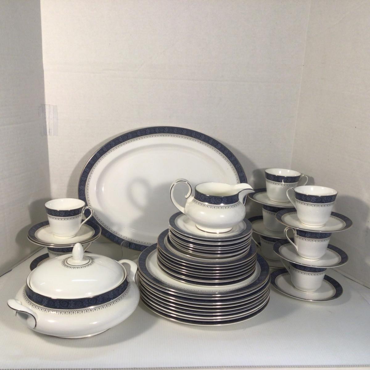 9 dinner plates, 7 salad plates, 7 bread and butter, 1 gravy with saucer, 8 cups and saucers with 1 extra saucer, one covered round vegetable , and one large oval platter