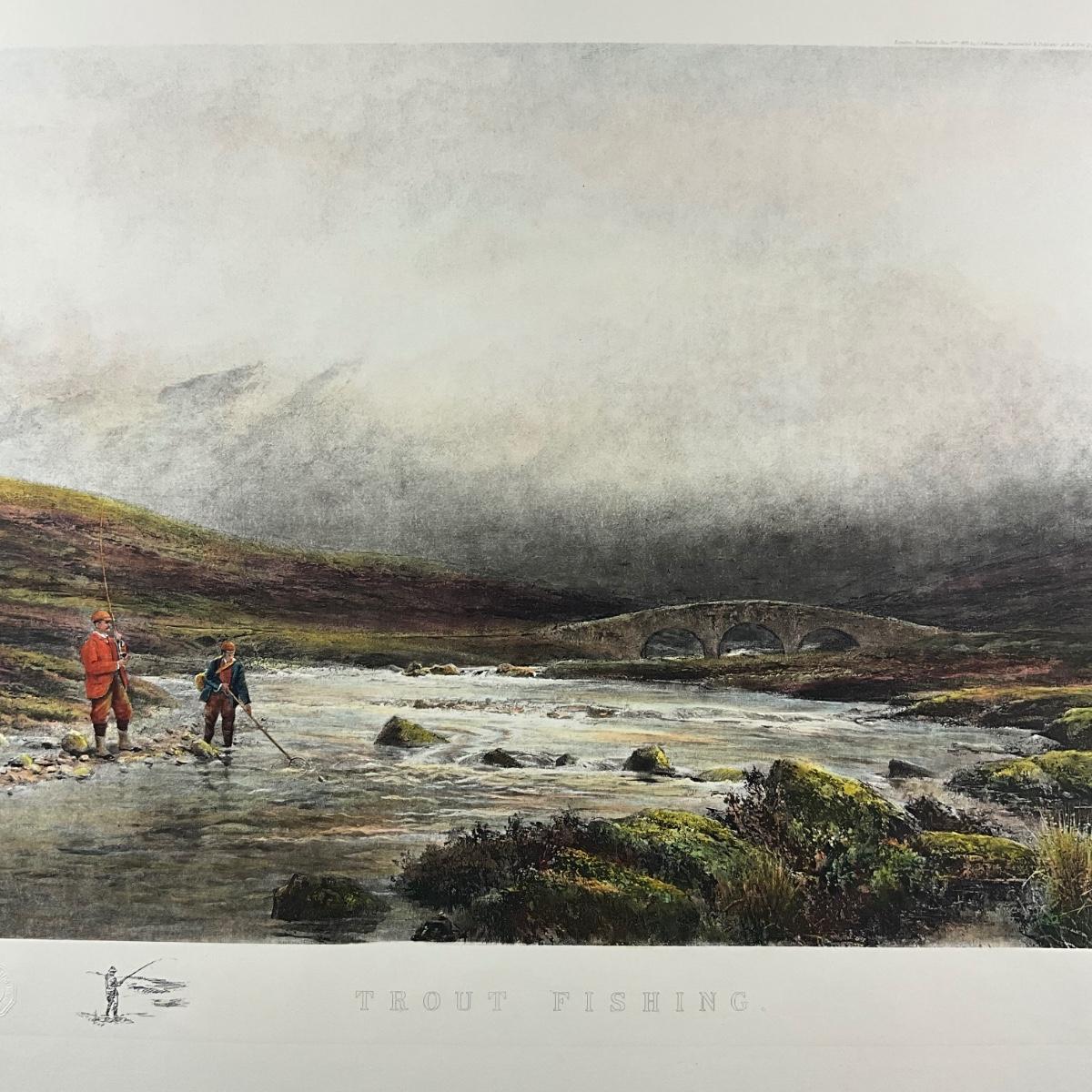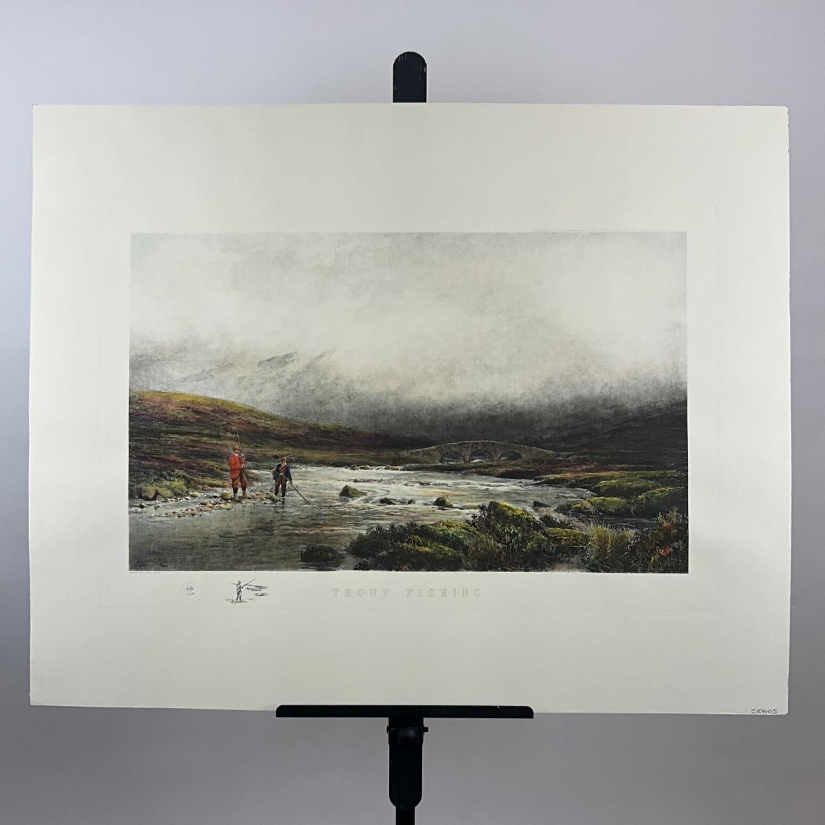 Trout Fishing, limited-edition print depicting anglers fly fishing in a misty river landscape with stone bridge. A classic example of Adams’ sporting and countryside imagery.