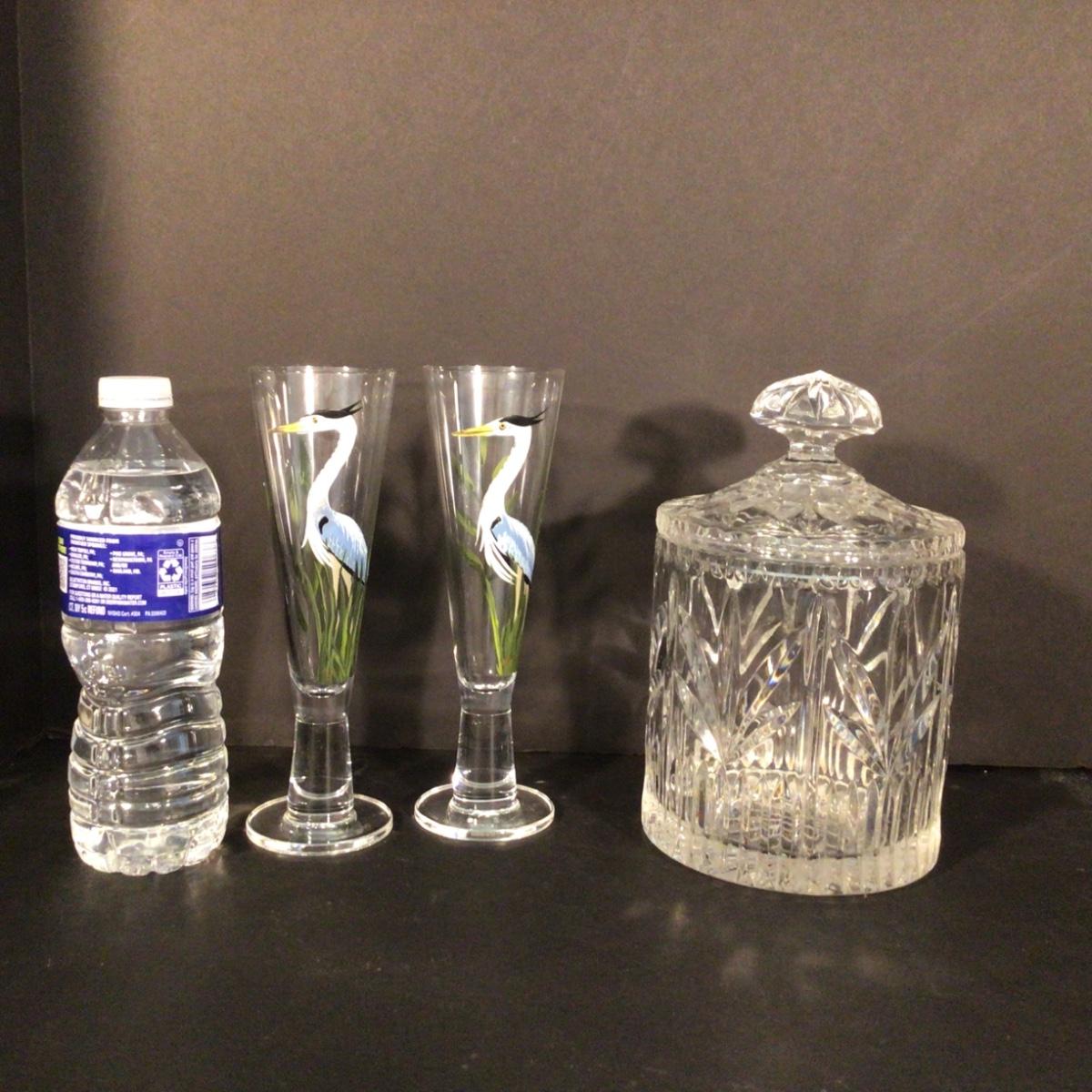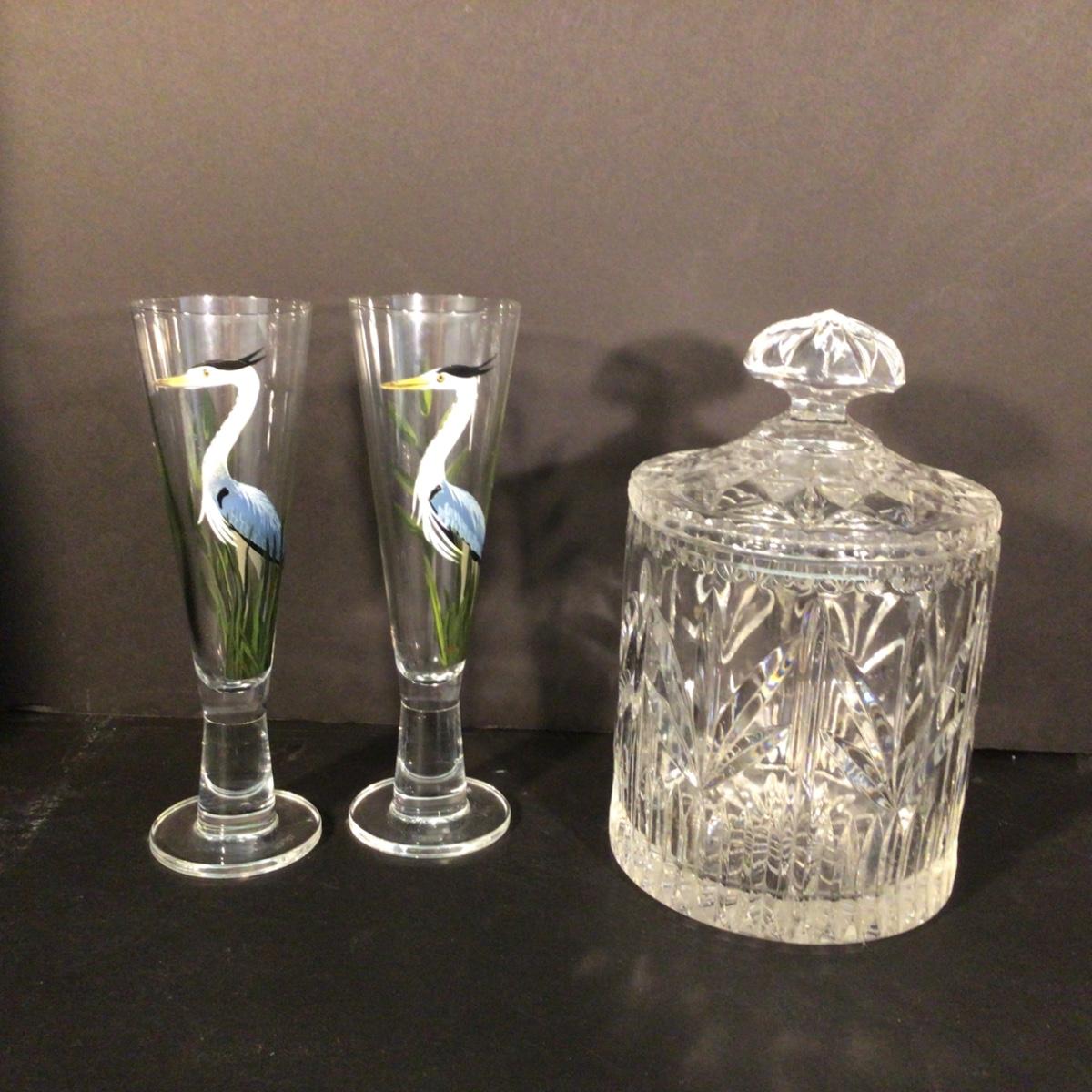 One crystal covered biscuit jar with a pair of Blue Heron handpainted glassware
