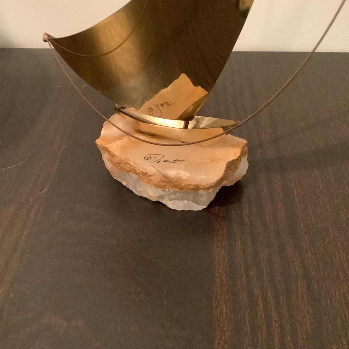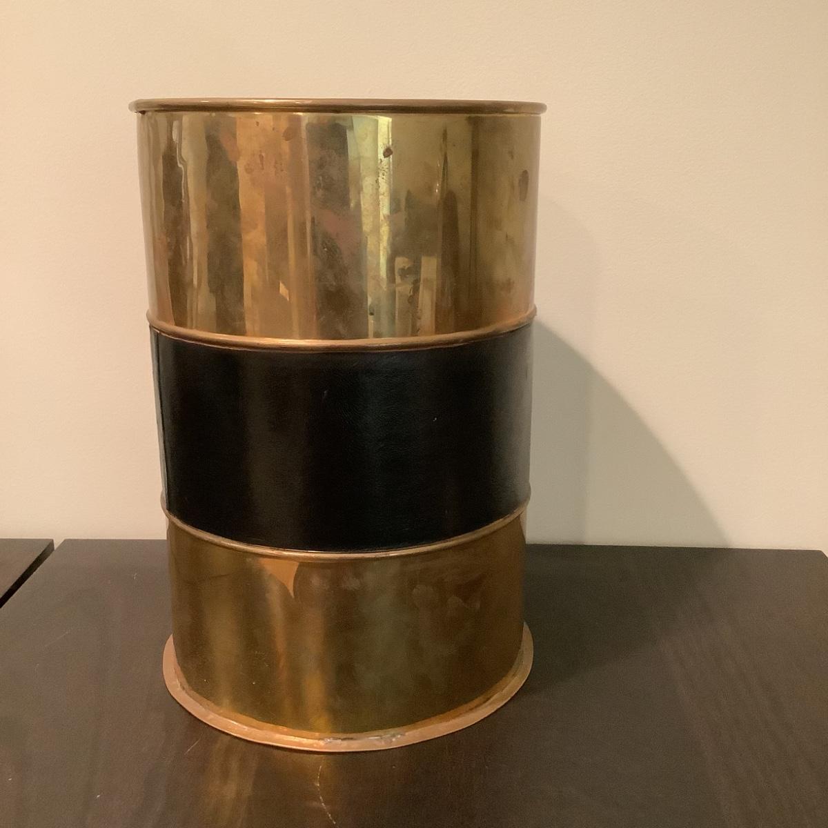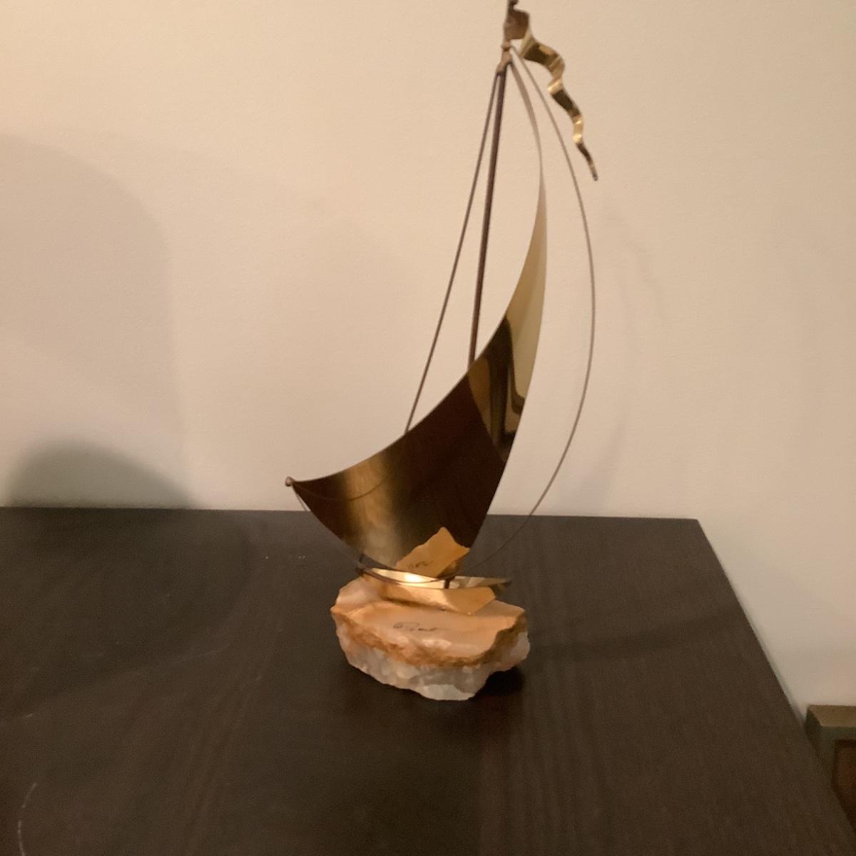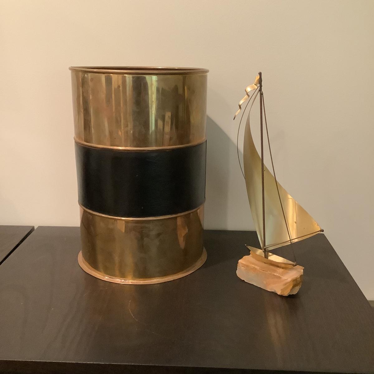 314 Demott Signed Mid Century Sailboat with Brass and Leather Waste can
