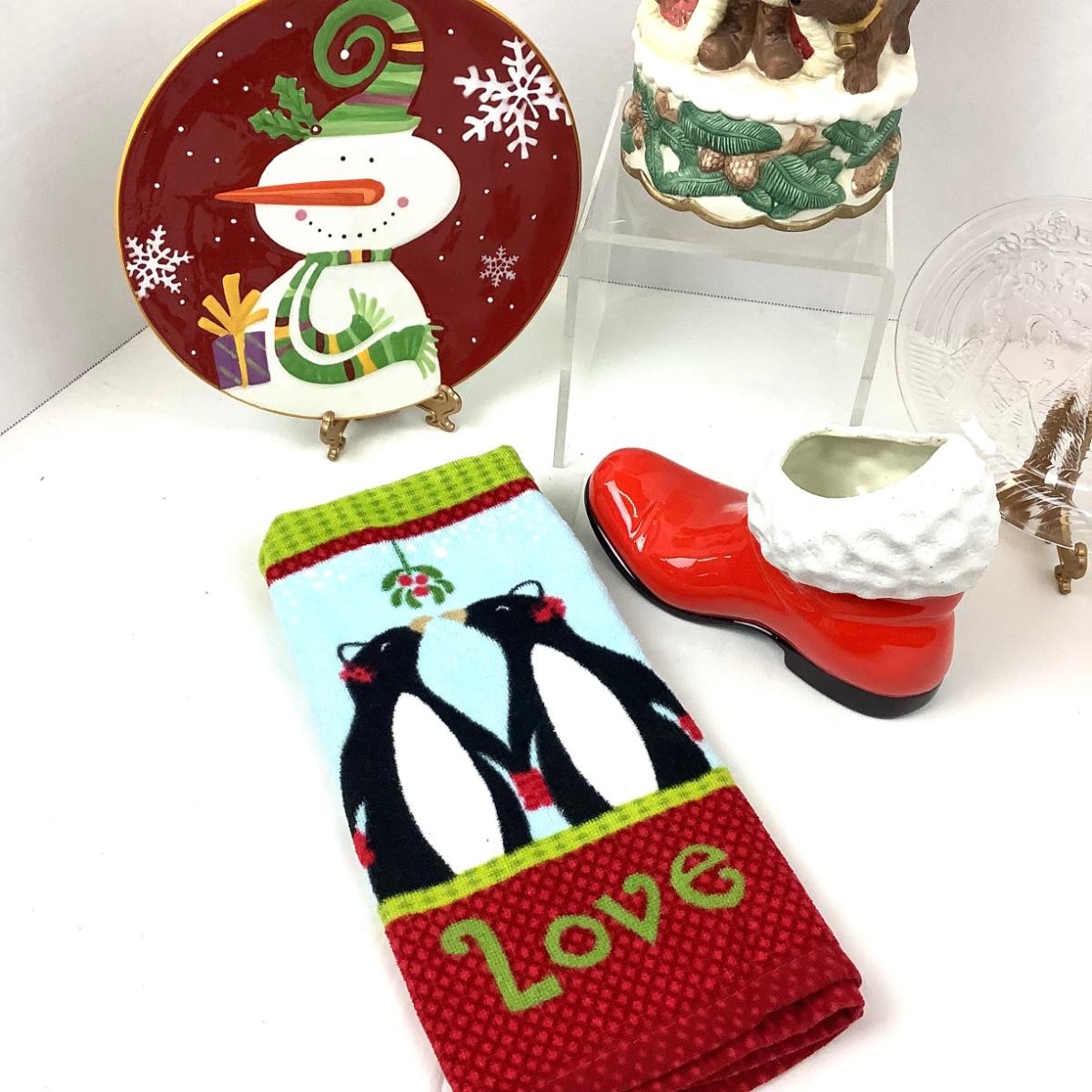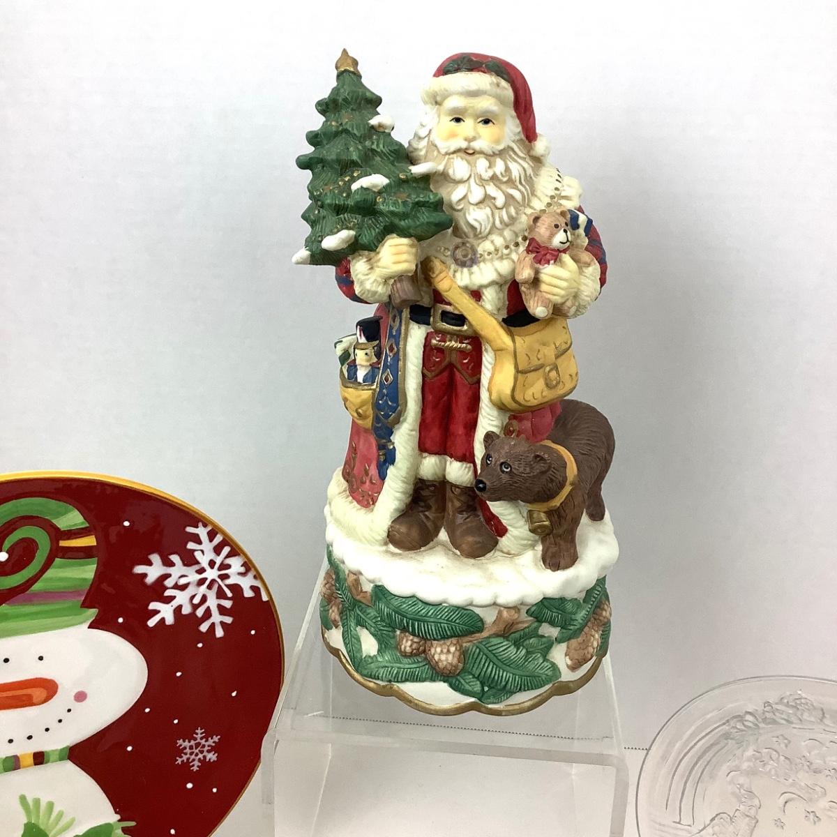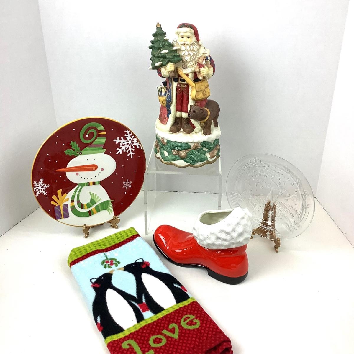 Lot contains-10" musical Santa, 2 holiday serving plates, Santa boot planter/dish and towel.
