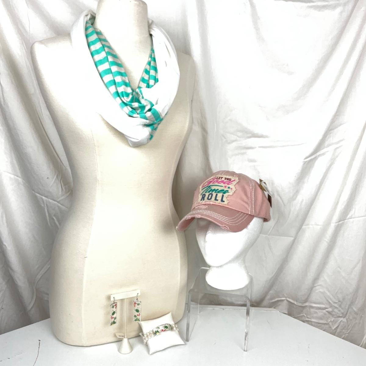 314 Let the Good Times Roll Hat, Turtle Earrings & Bracelet, Green and White Cotton Infinity Scarf