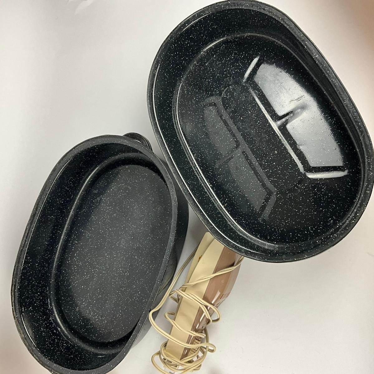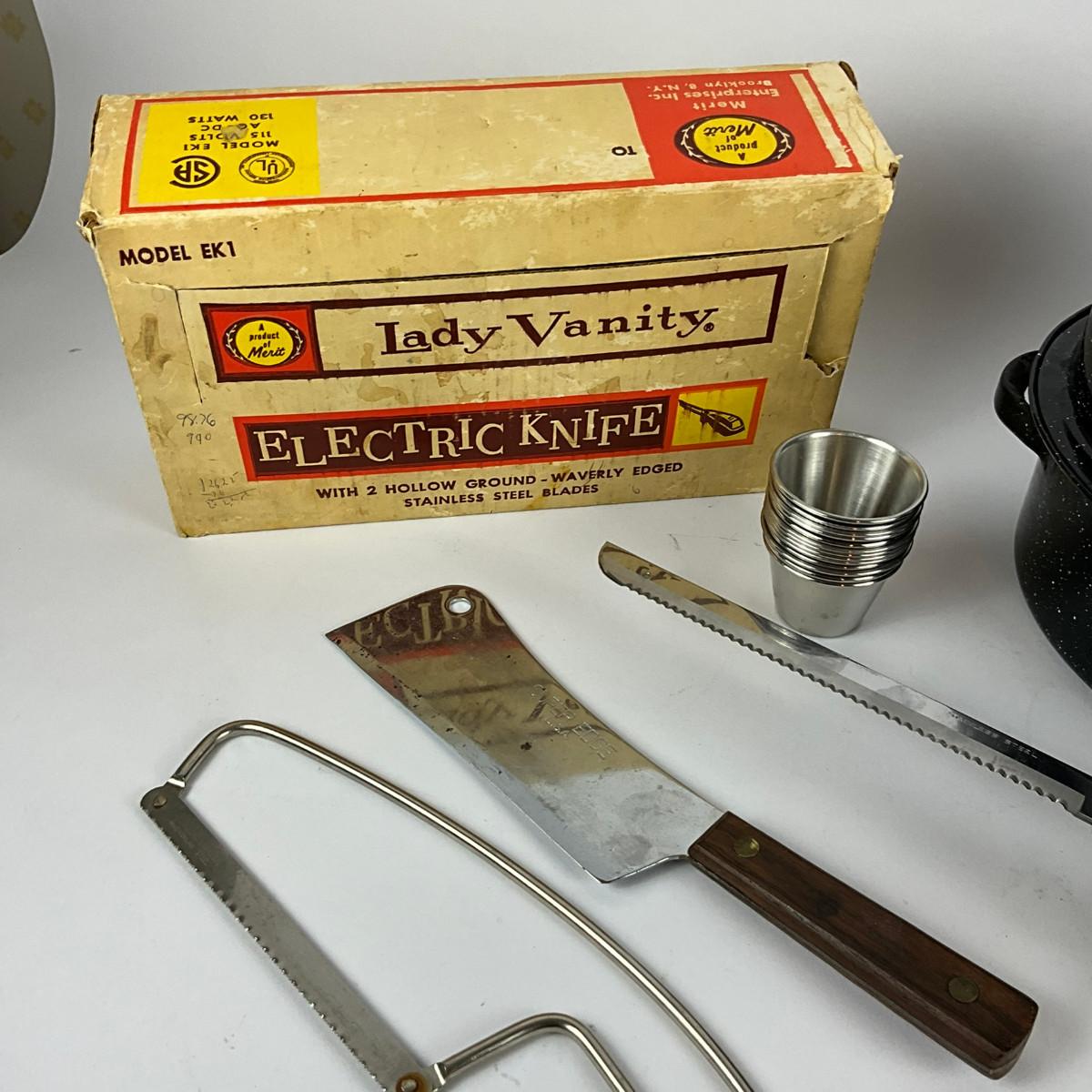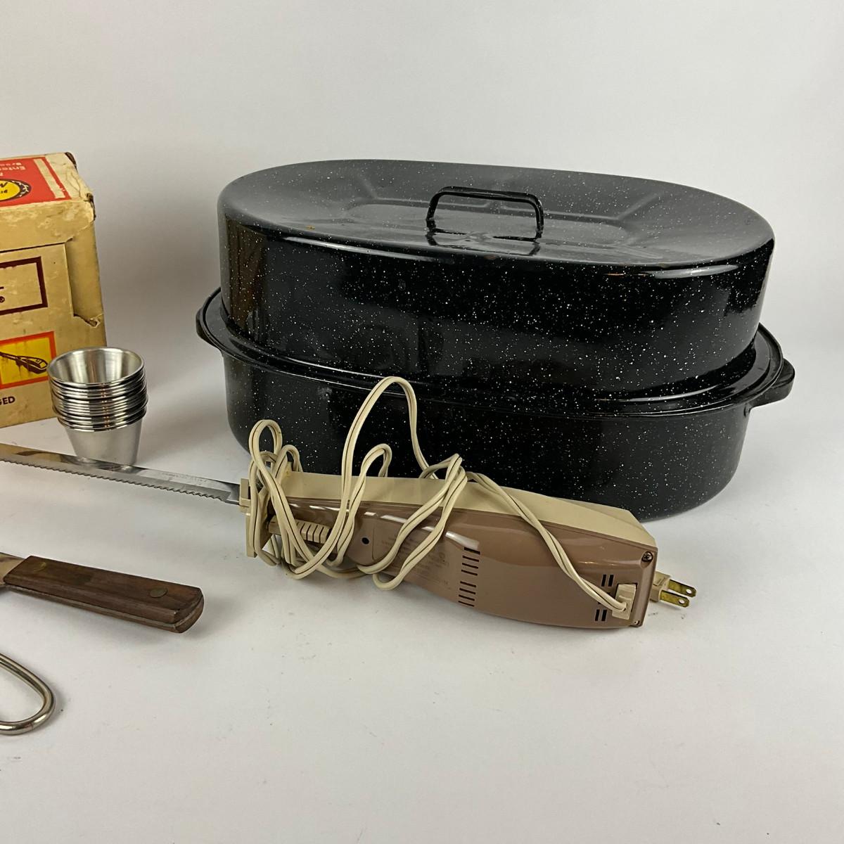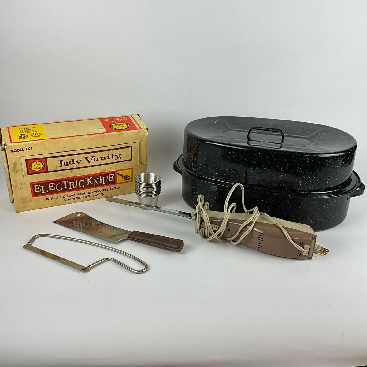 314 Oval Enamel Roasting Pan With Lady Vanity Electric Knife & Butcher Knife