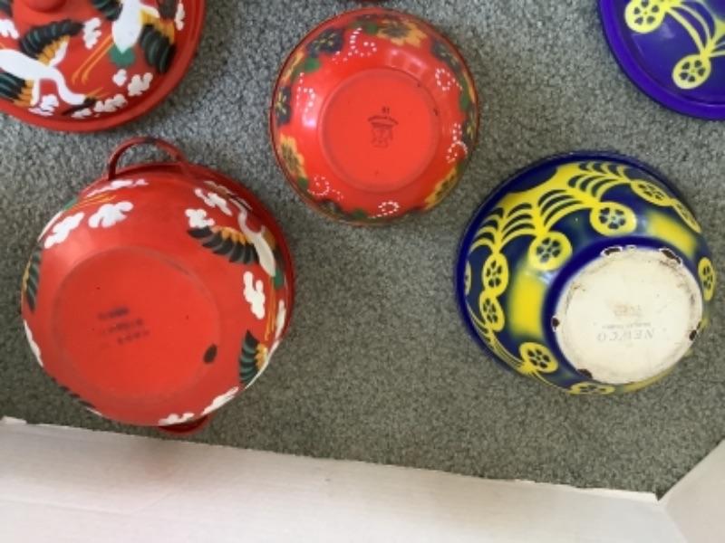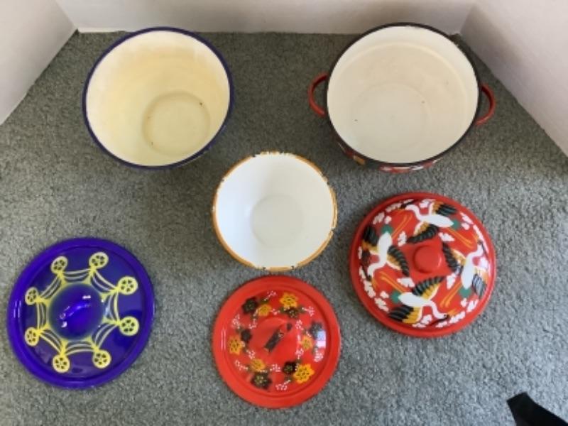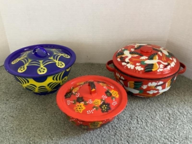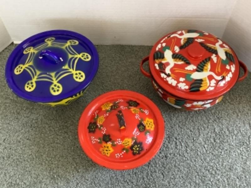 Blue and yellow pot by Newco is made in Nigeria and measures 8-1/2” round and 5” deep. Red pot with handles made in Nigeria and measures 8-1/2” round and 4” deep. Red pot with floral design made in Poland and measures 6-1/2” round and 4” deep
