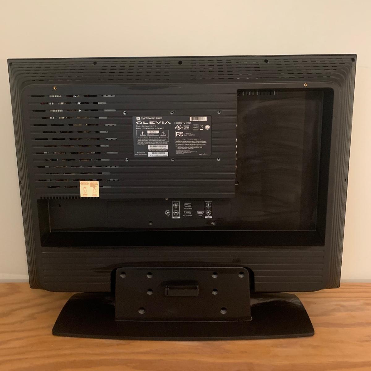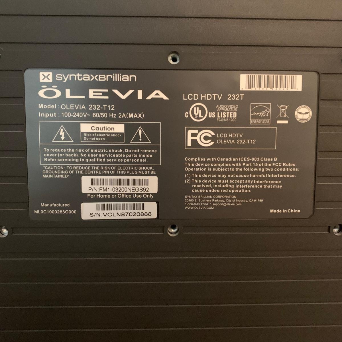 Olevia 232-t12 LCD television with 32” screen. Unit measures, 32”L x 7.5”W x 24”H. TV does not have a power cord, so we are unable to test functionality. Unit appears to be in good condition physically. Power cords for this model can be purchased from Amazon.