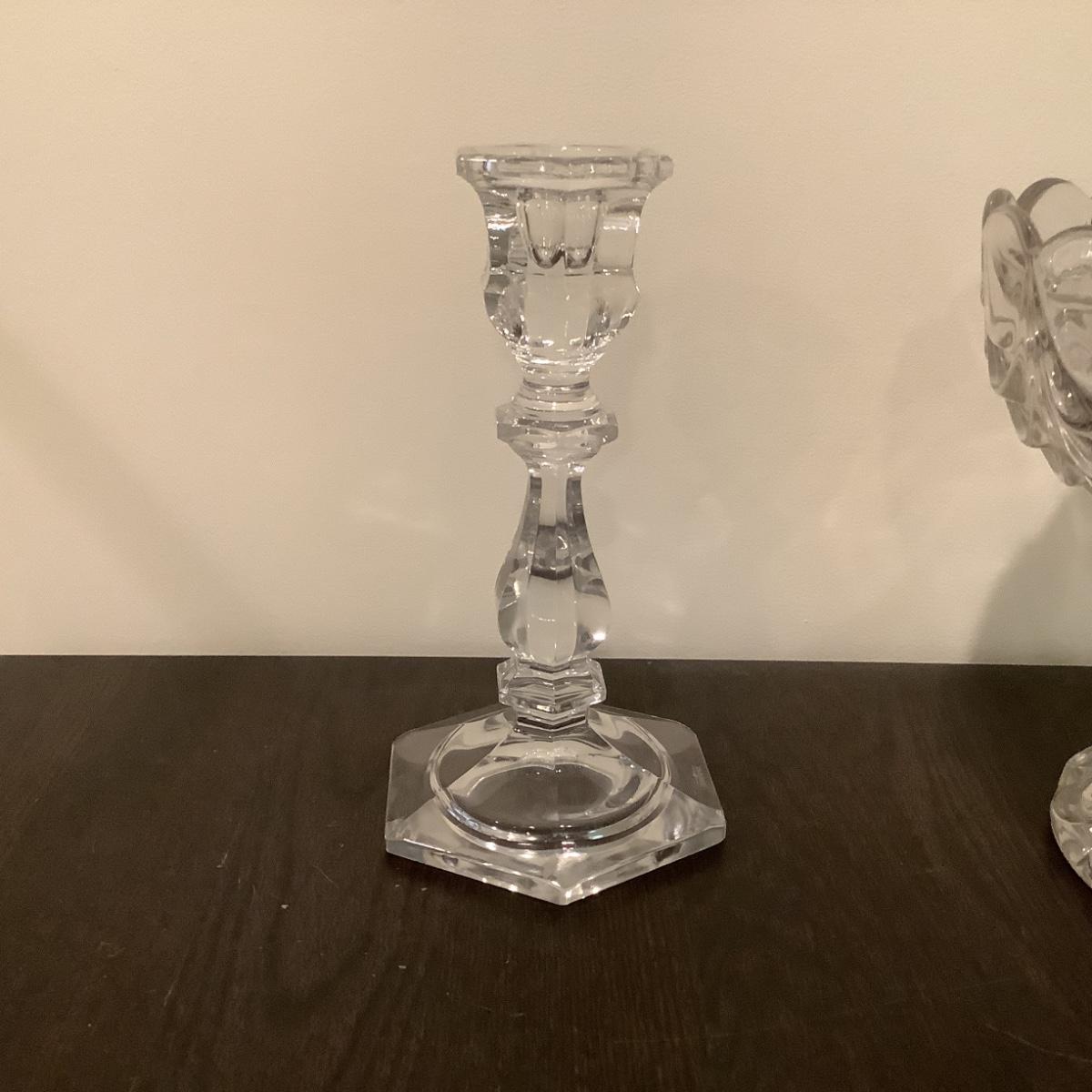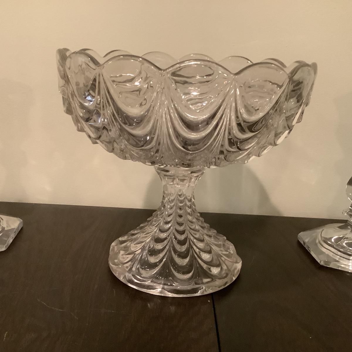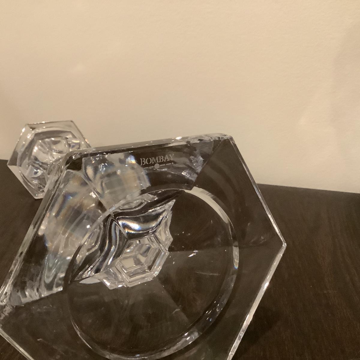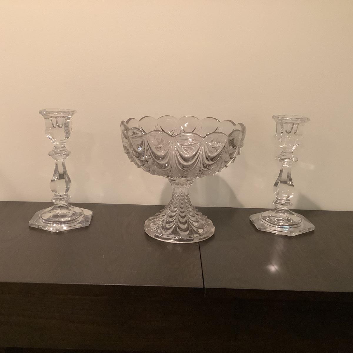 316 Pair of Bombay Signed Crystal Candlesticks with Pressed Glass Pedestal Dish