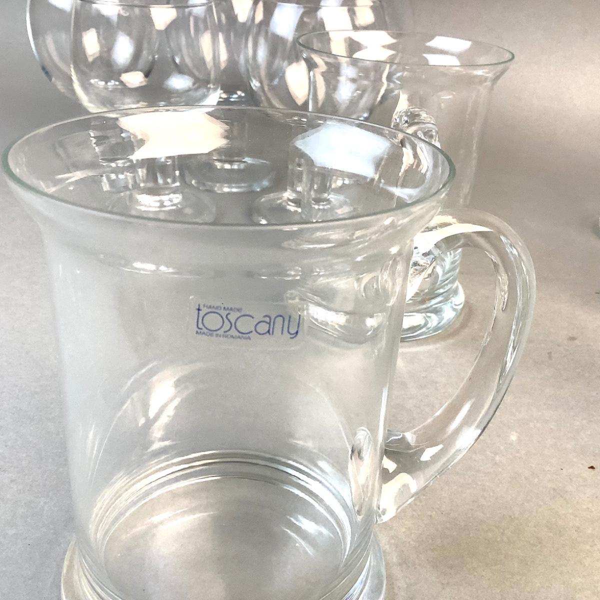 the set of 6 handblown Tuscany clear glass mugs are in new condition with tag , measuring 5" high x 3.5" diameter
