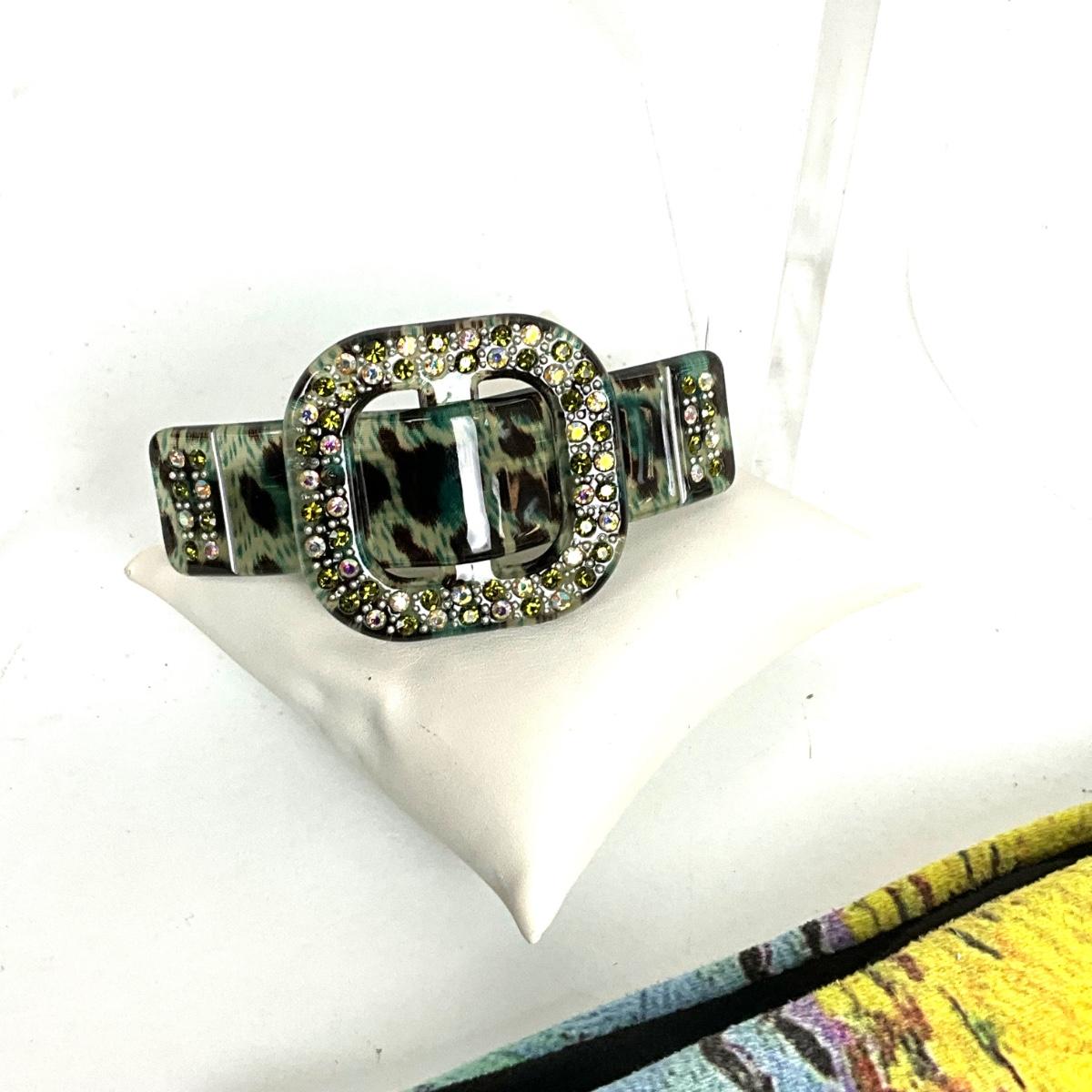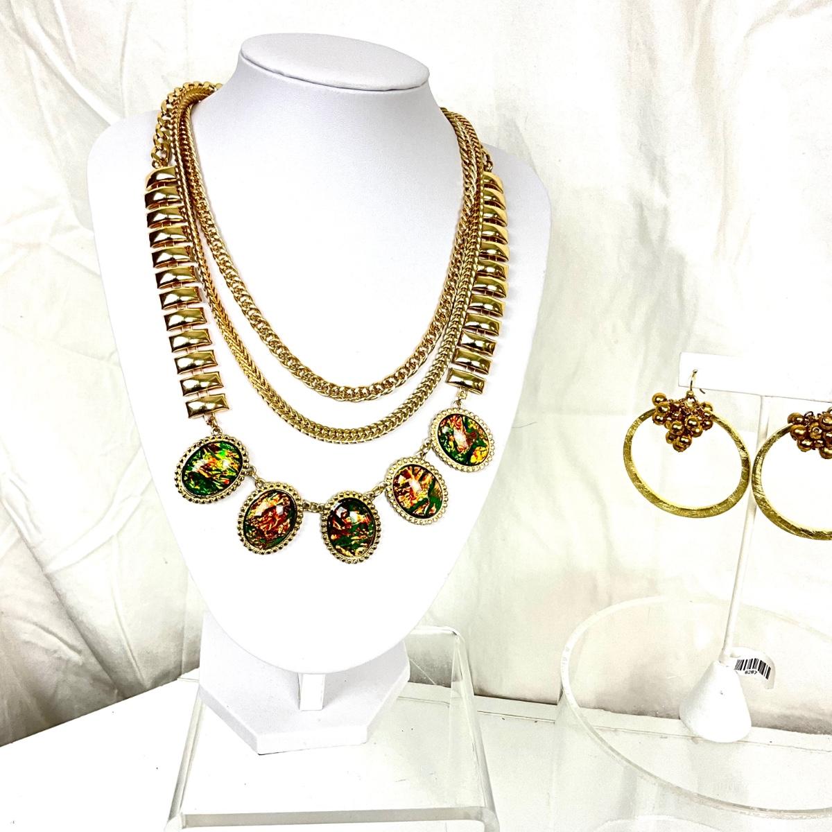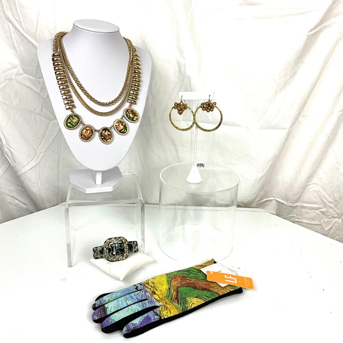 319 Green and Gold Necklace with Earrings, Rhinestone Barrette, Van Gogh Smart Gloves