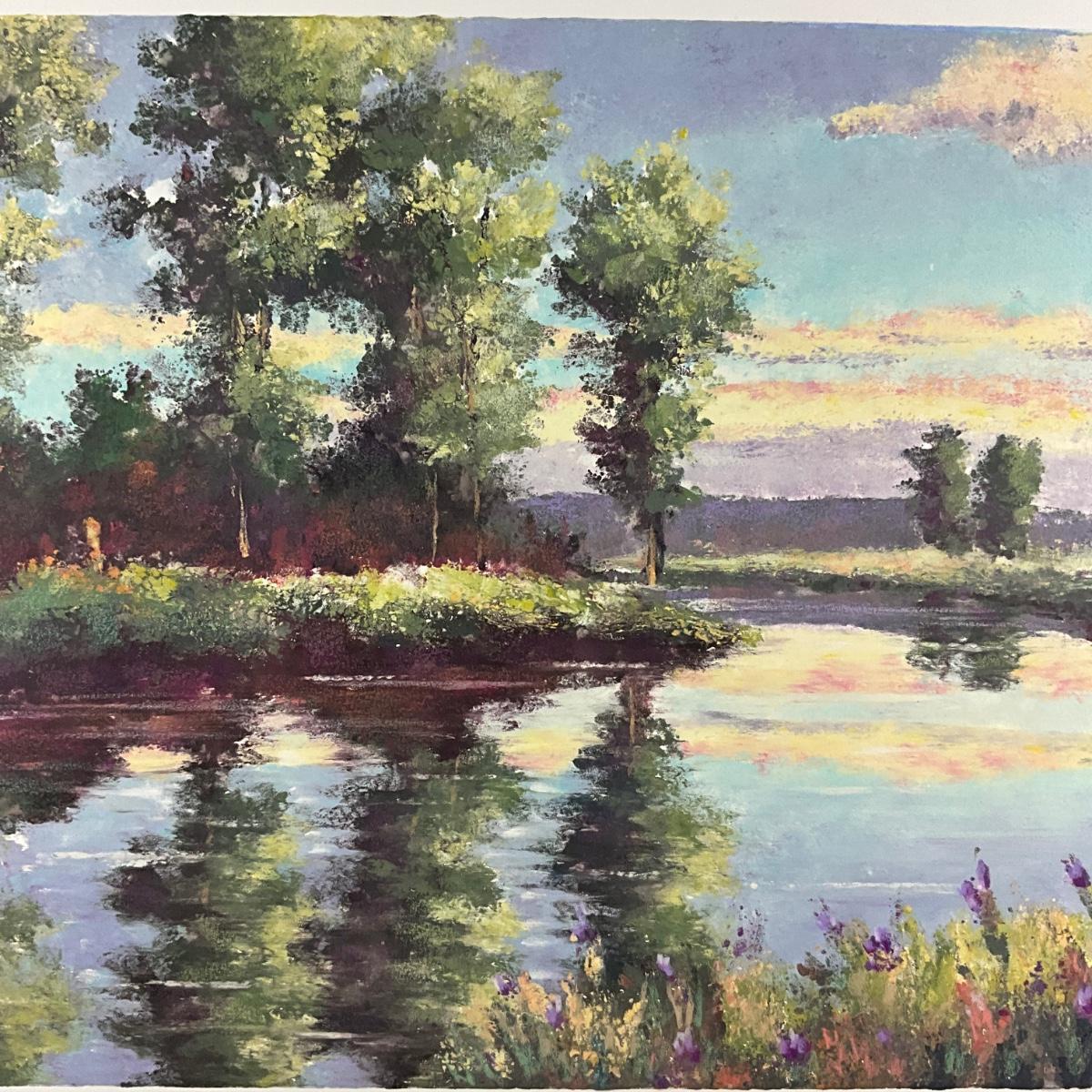 Signed landscape depicting a tranquil river scene with trees and reflections, executed in a painterly impressionistic style.