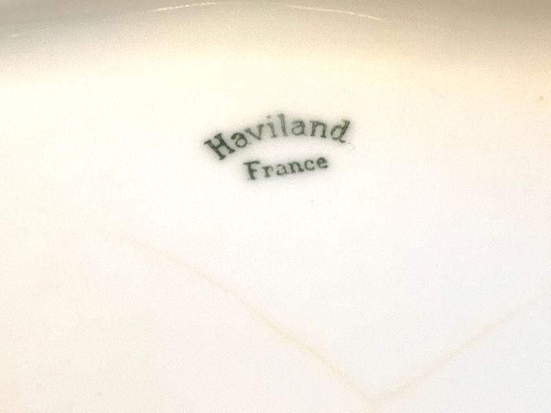 Antique white with gold trim, covered oval bowl. Marked Haviland France. Some stress crackling on the bottom.