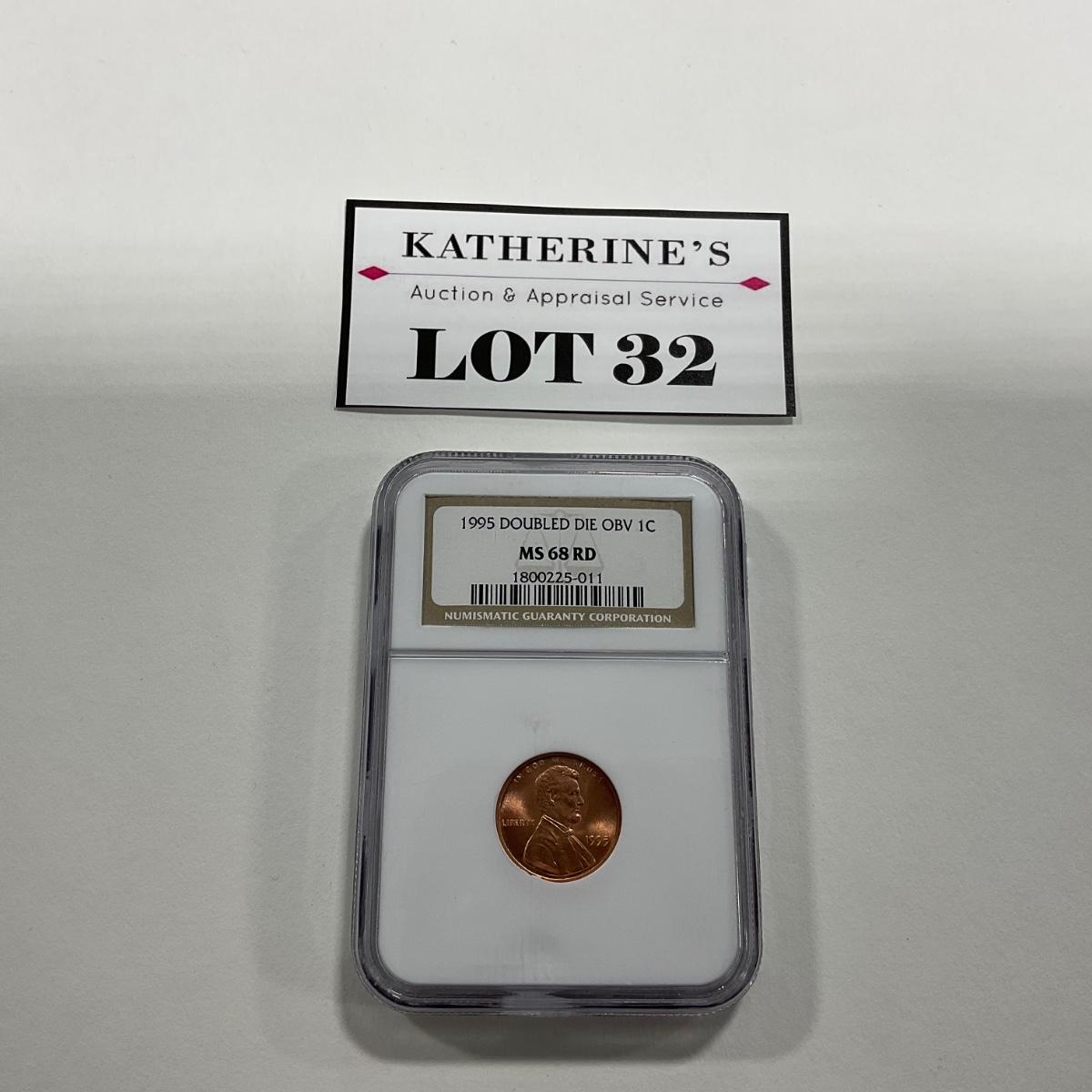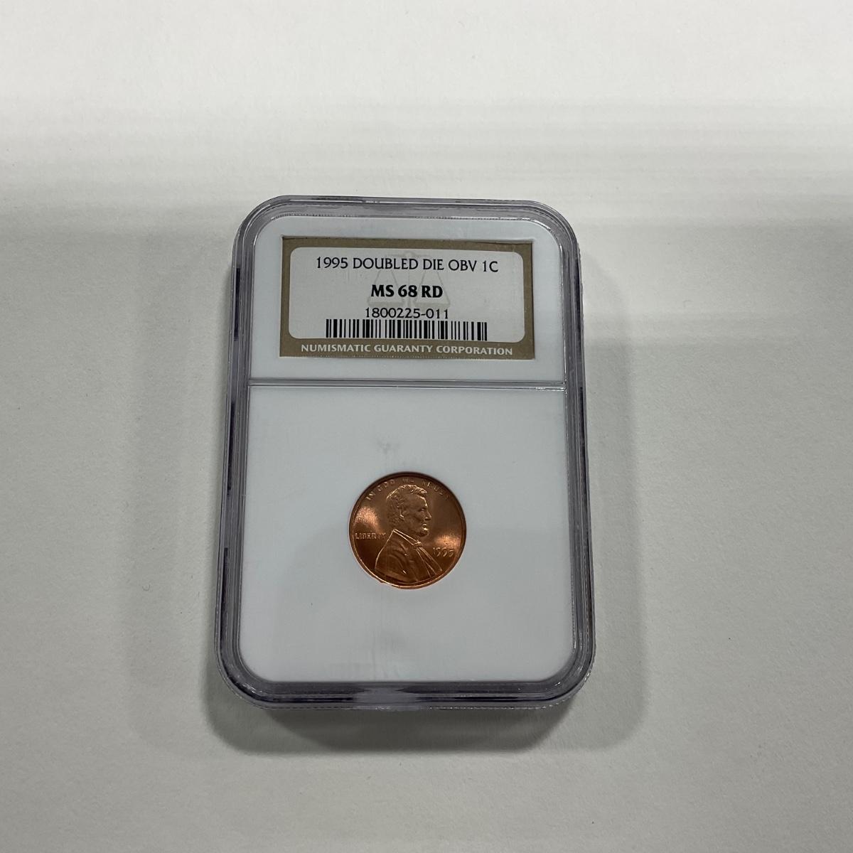 One 1995 Lincoln double die obv. MS-68 graded coin. Back NGC label pulled off did verify with NGC. Please see photos for details and condition. ::: Shipping is available on this lot. If you require shipping you must let us know at the close of the auction. We will coordinate with you after the item has been won. Shipping fees will include insurance up to or exceeding the value of all items being mailed. If you have any questions regarding this lot please contact the auctioneer either via this website, by direct email or by phone. PICK UP TIMES and other important information can be found in the TERMS and DESCRIPTION of the auction. Please take a look for pertinent information. Thanks!