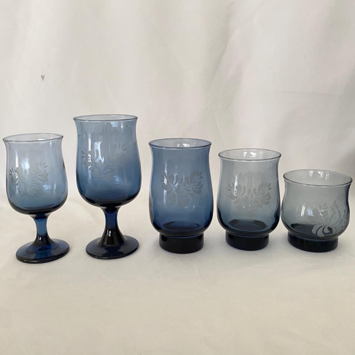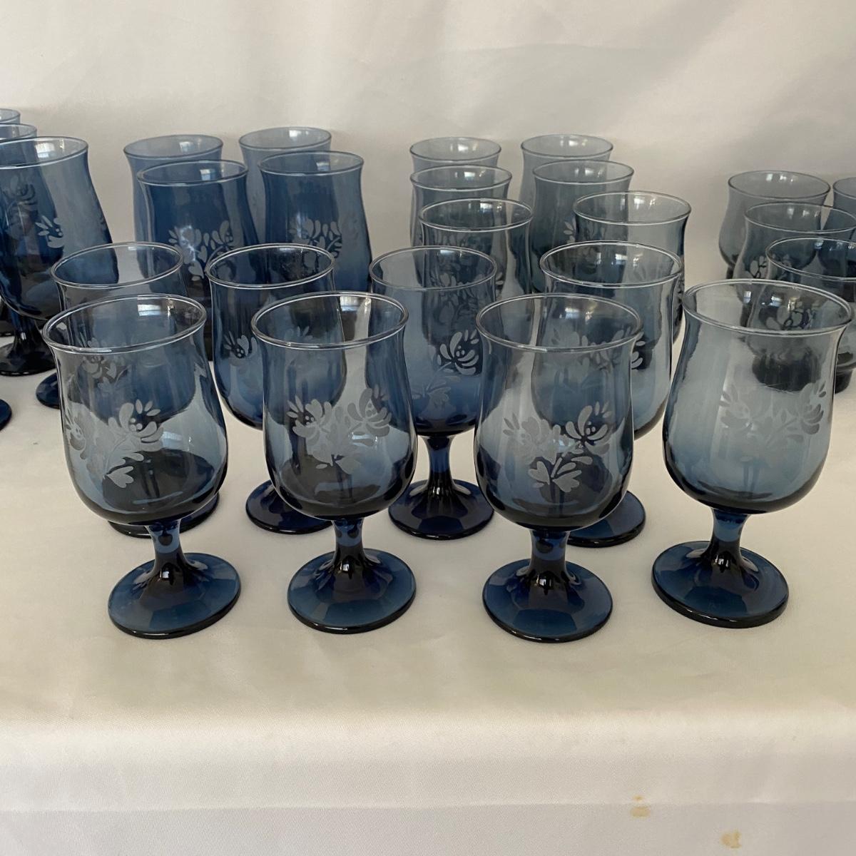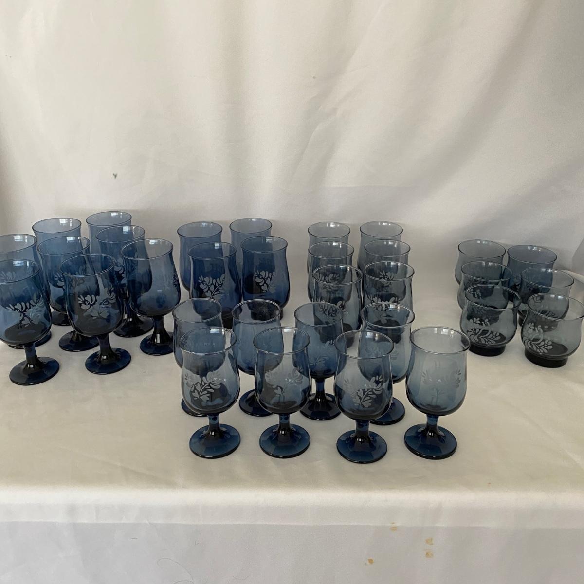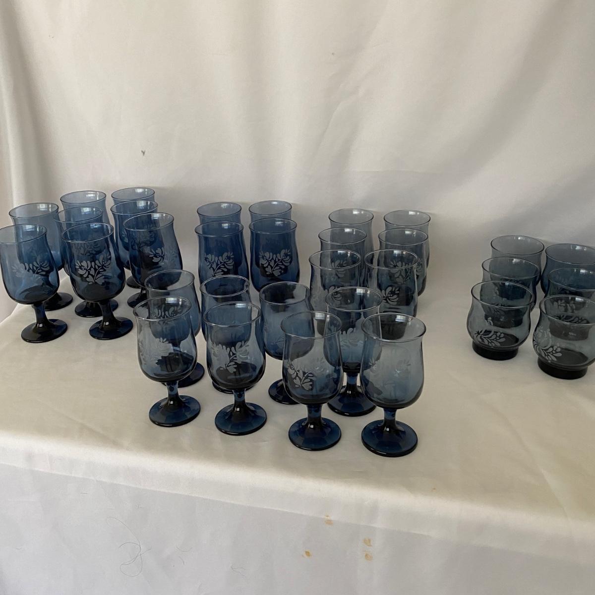 32 blue drinking glasses with etched flower design. Includes 8 goblets, 4 tall tumblers, 6 smaller tumblers, 6 juice glasses and 8 wine glasses. Appear to have been rarely used. Shipping available