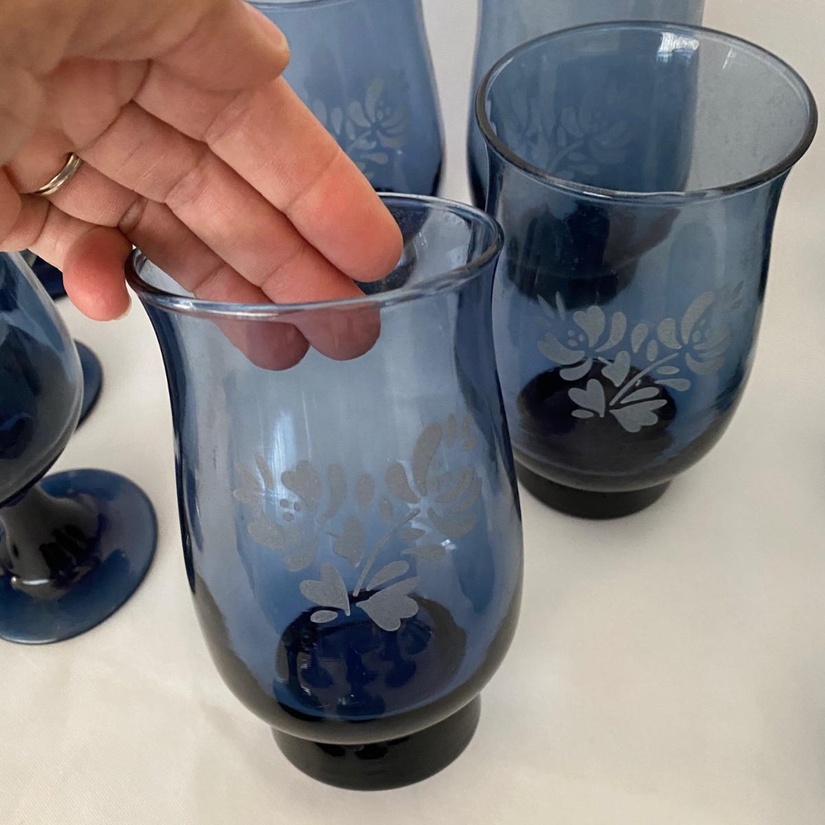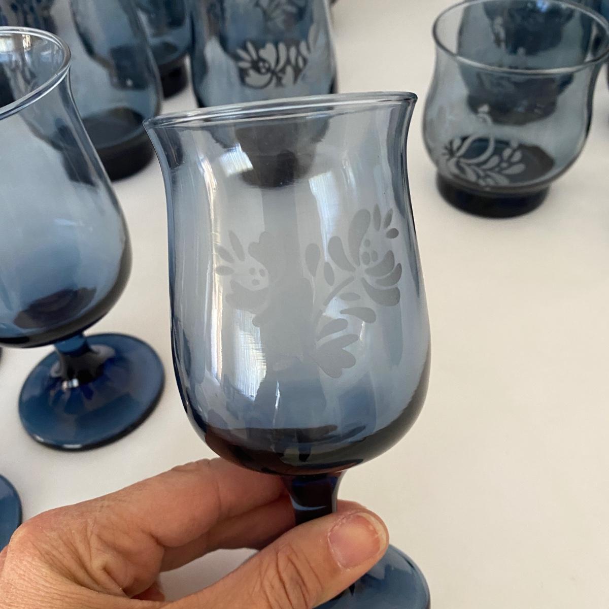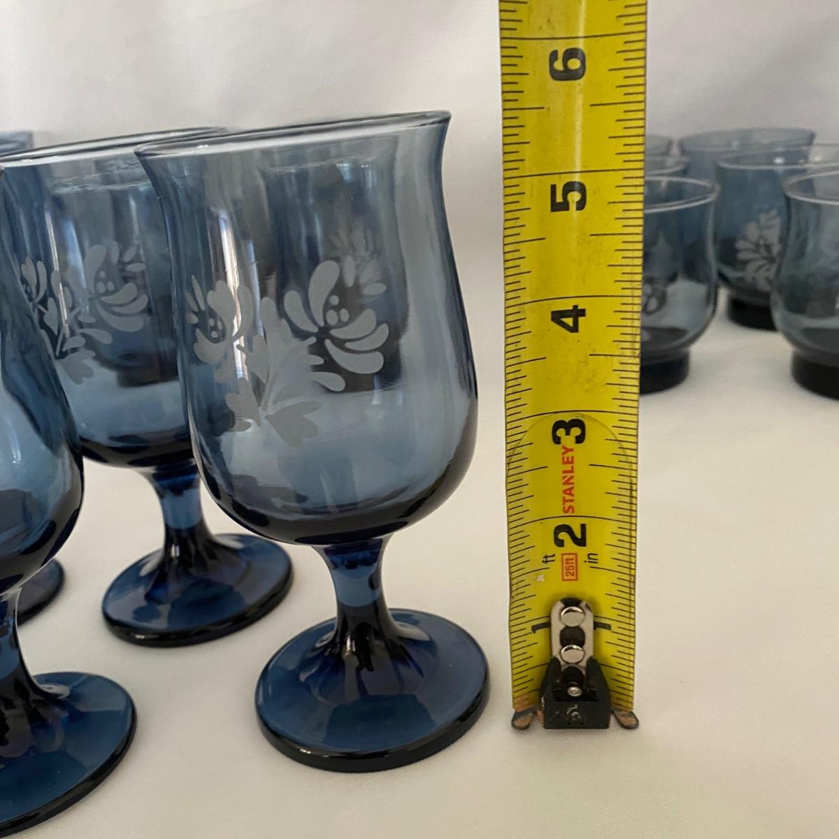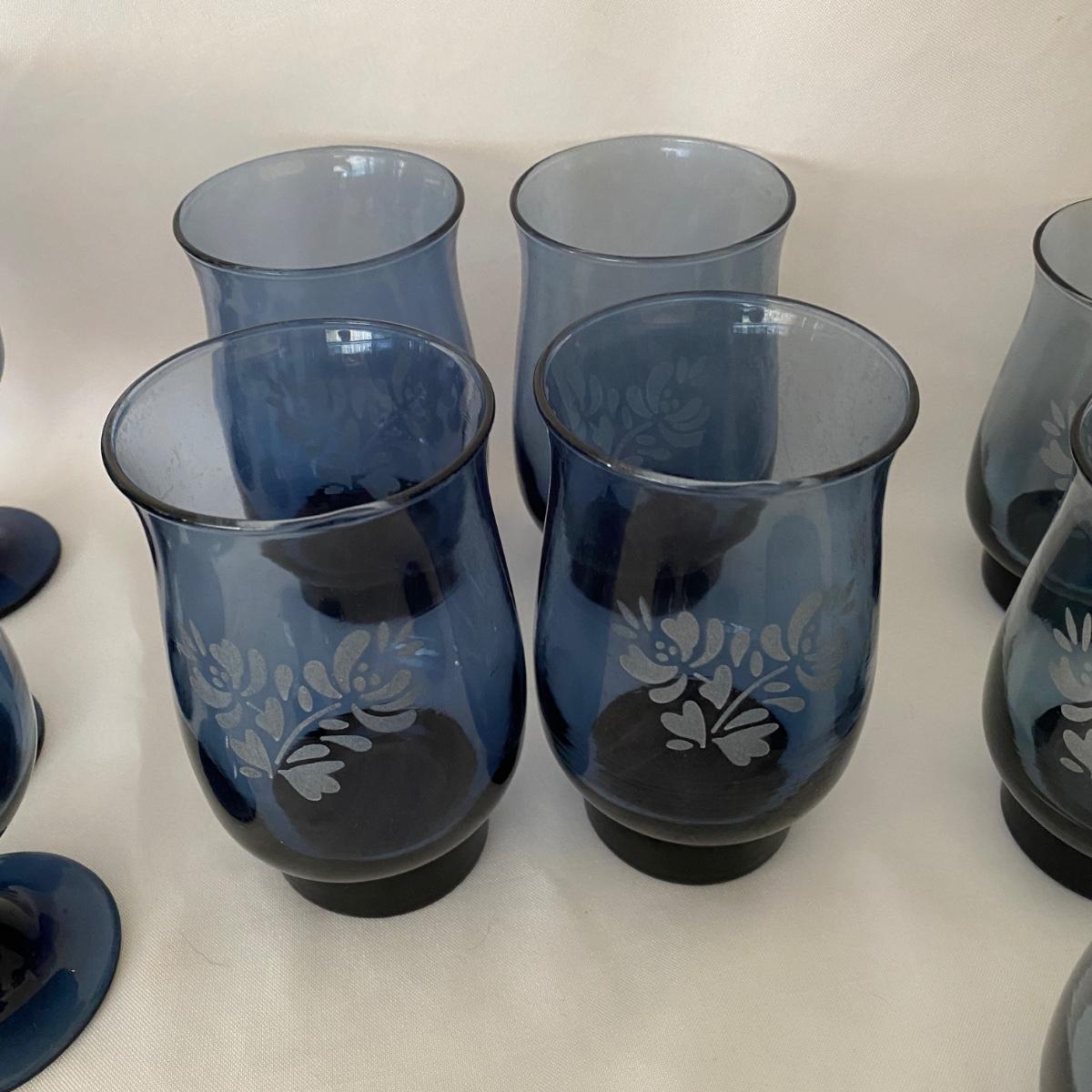 32 blue drinking glasses with etched flower design. Includes 8 goblets, 4 tall tumblers, 6 smaller tumblers, 6 juice glasses and 8 wine glasses. Appear to have been rarely used. Shipping available