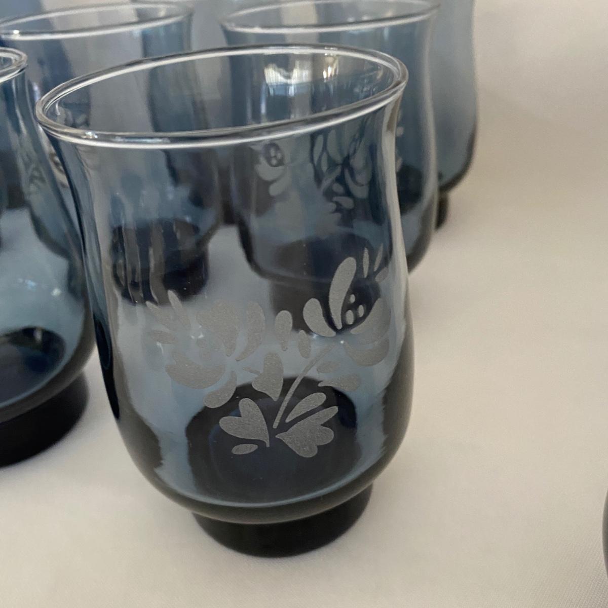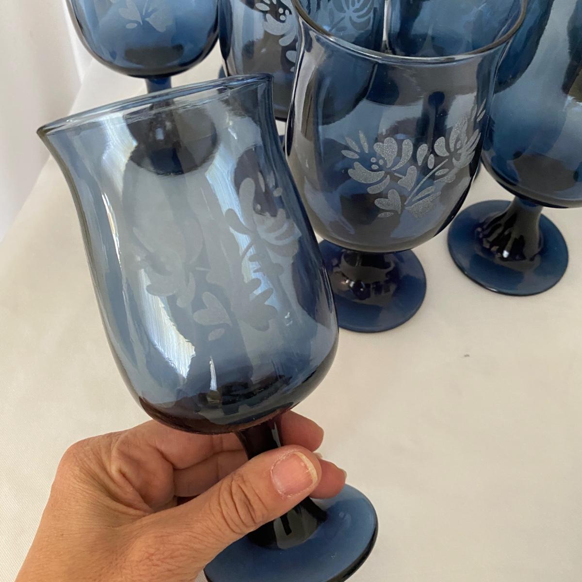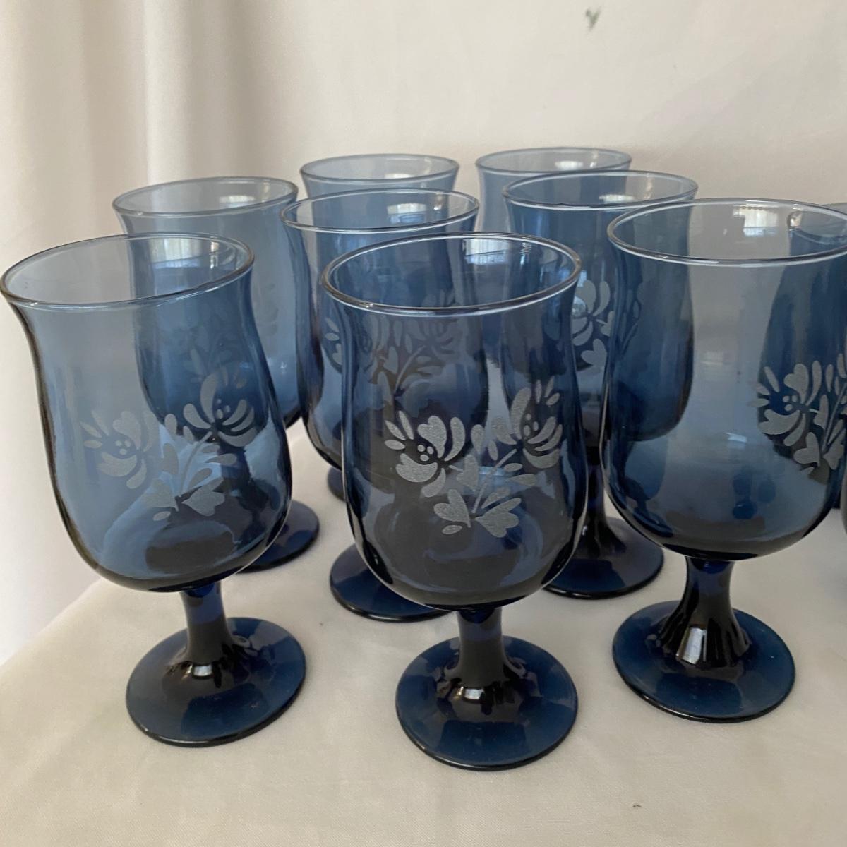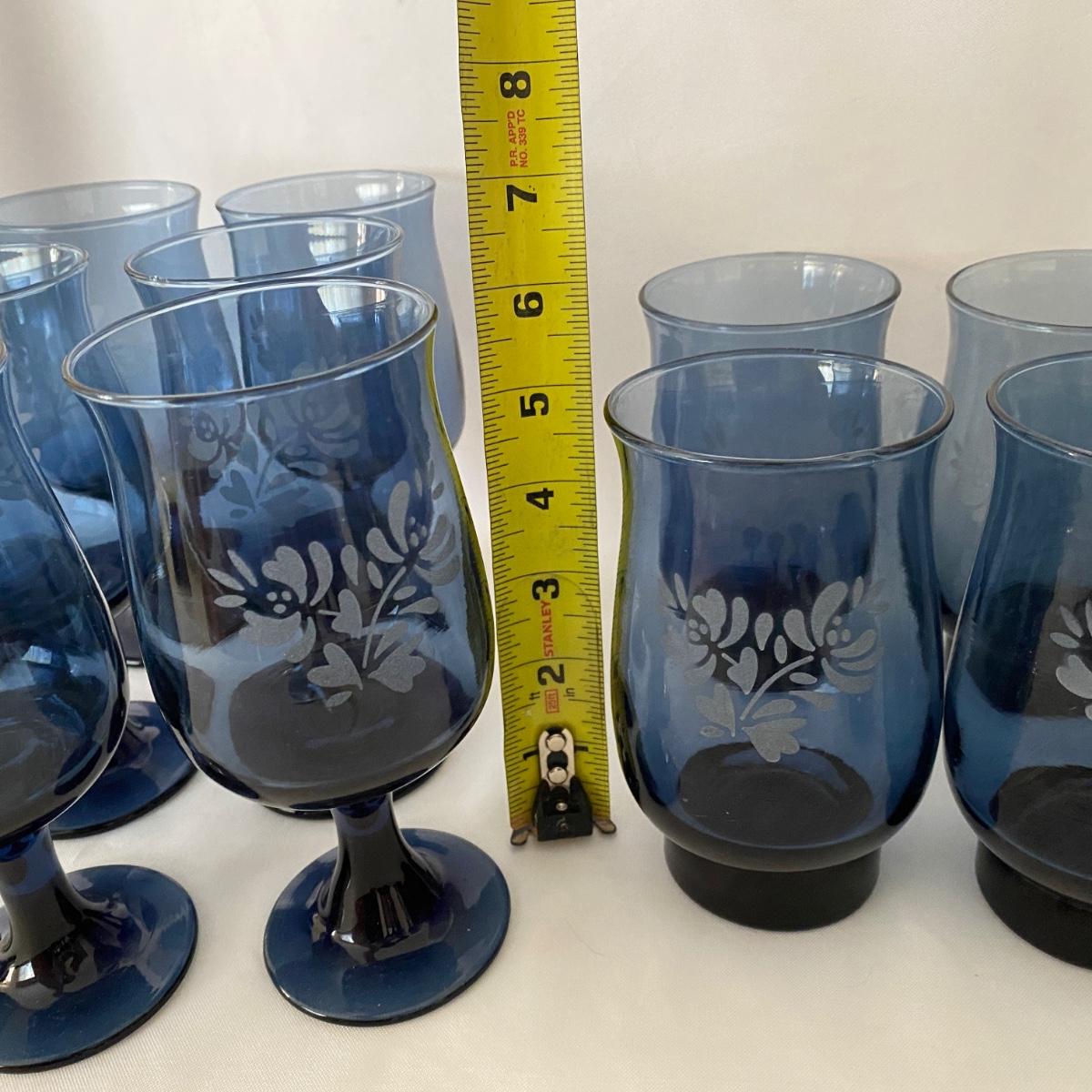 32 blue drinking glasses with etched flower design. Includes 8 goblets, 4 tall tumblers, 6 smaller tumblers, 6 juice glasses and 8 wine glasses. Appear to have been rarely used. Shipping available