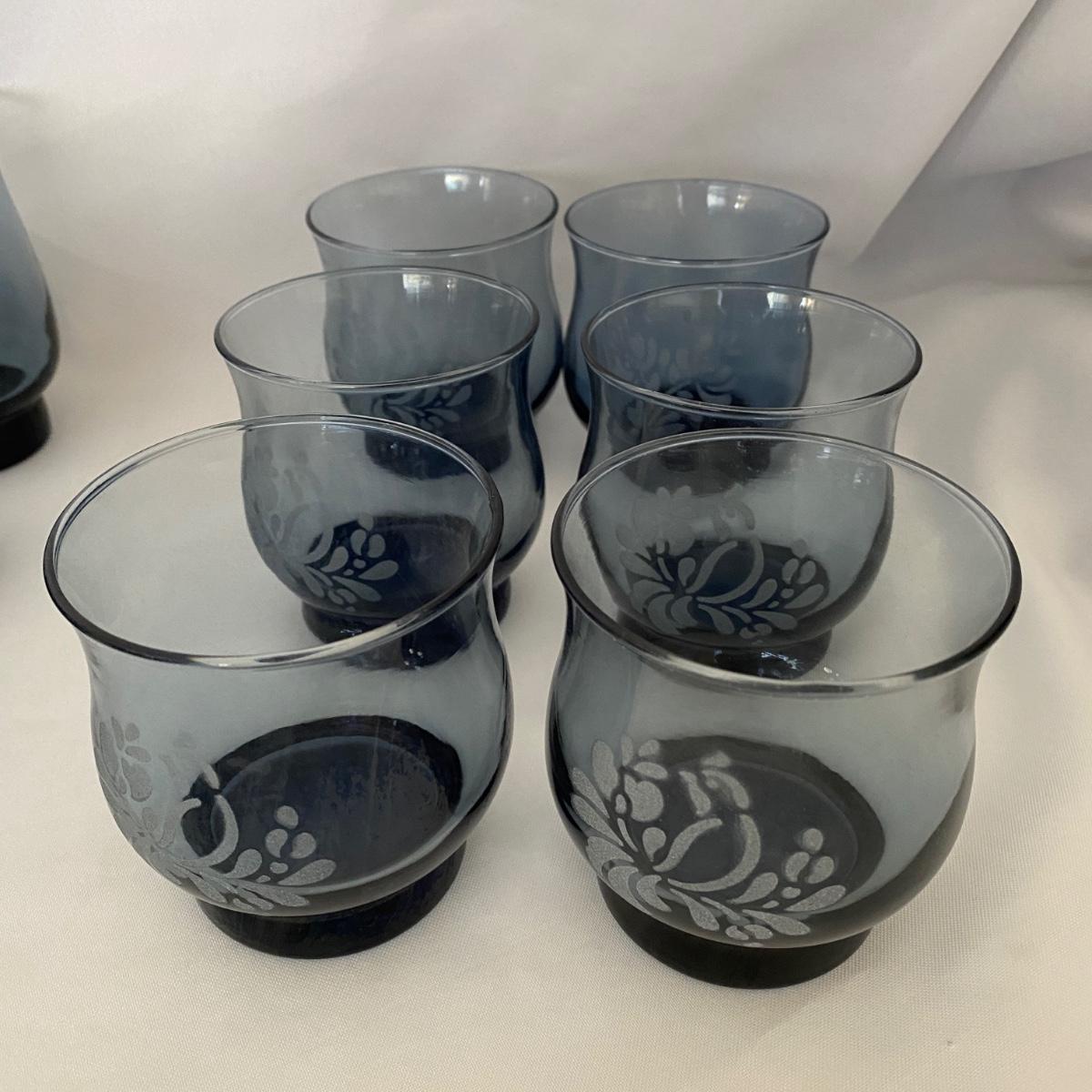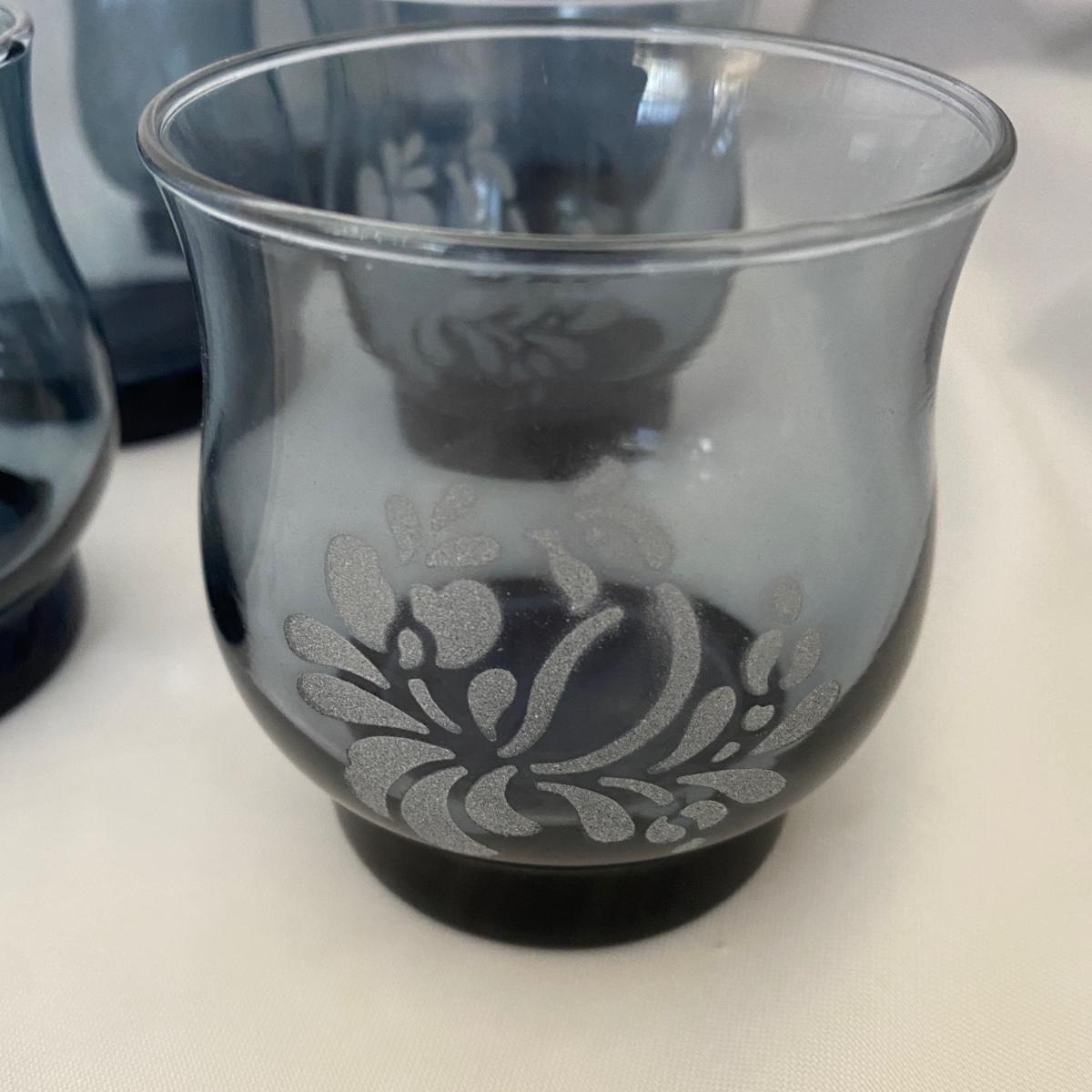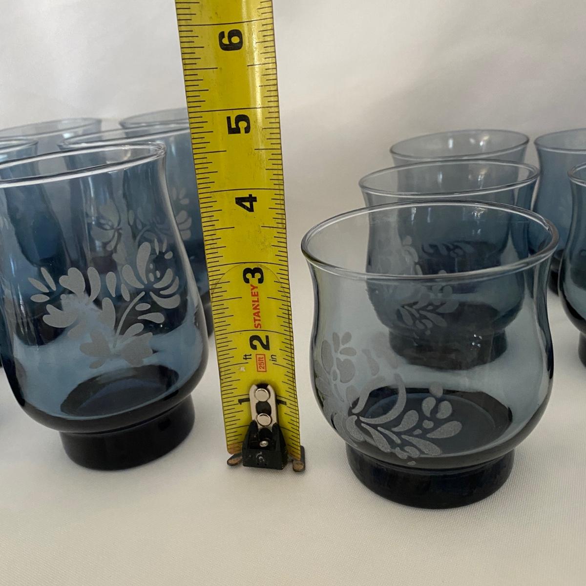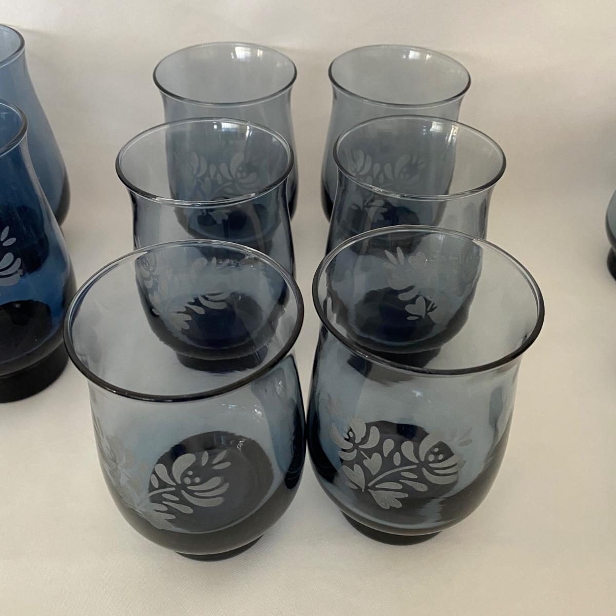 32 blue drinking glasses with etched flower design. Includes 8 goblets, 4 tall tumblers, 6 smaller tumblers, 6 juice glasses and 8 wine glasses. Appear to have been rarely used. Shipping available