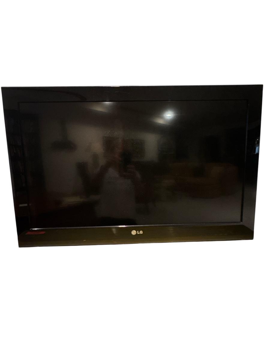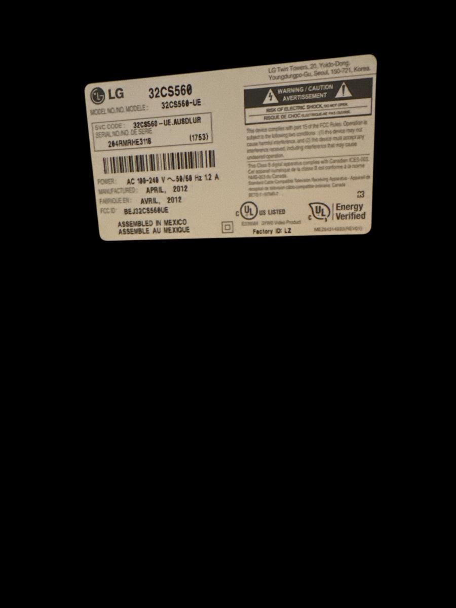 This is an LG 32-inch flat screen LCD TV, model 32CS560. It features a sleek black frame and was manufactured in April 2012. The model number is 32CS560-UE, and it is energy verified with UL certification. This TV offers 1080p Full HD resolution and is suitable for use as a secondary television, in a guest room, or paired with a vintage entertainment cabinet.