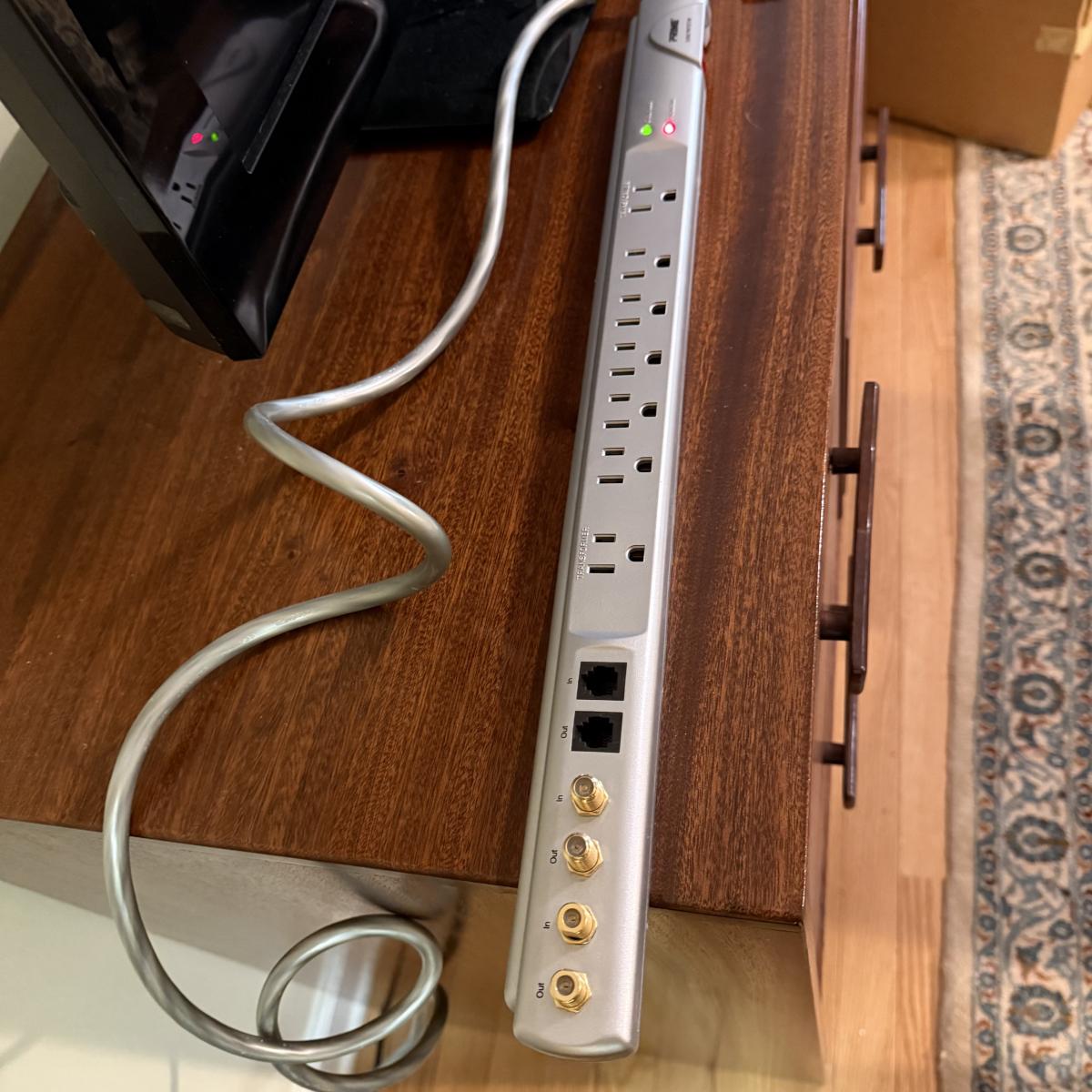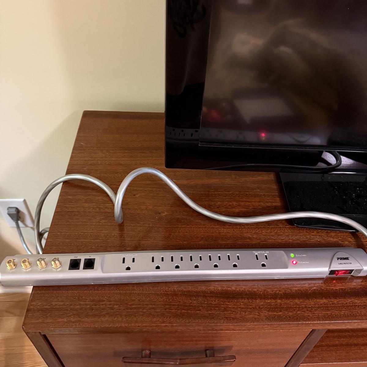 This lot contains a 32” LG TV with its remote, set up guide, and owner's manual. Also included in this lot is a seven-outlet Prime surge protector power strip. The surge protector measures 19” x 1.75”. Both of these items turn on. See pictures for model number. Desk not included but is for sale in another lot in this auction. Shipping available. Shipping can be costly. We suggest contacting our preferred local shipping provider, Postage Express, with dimensions and getting an estimate before bidding: (828) 255-9250 or shipping@postageexpressnc.com.