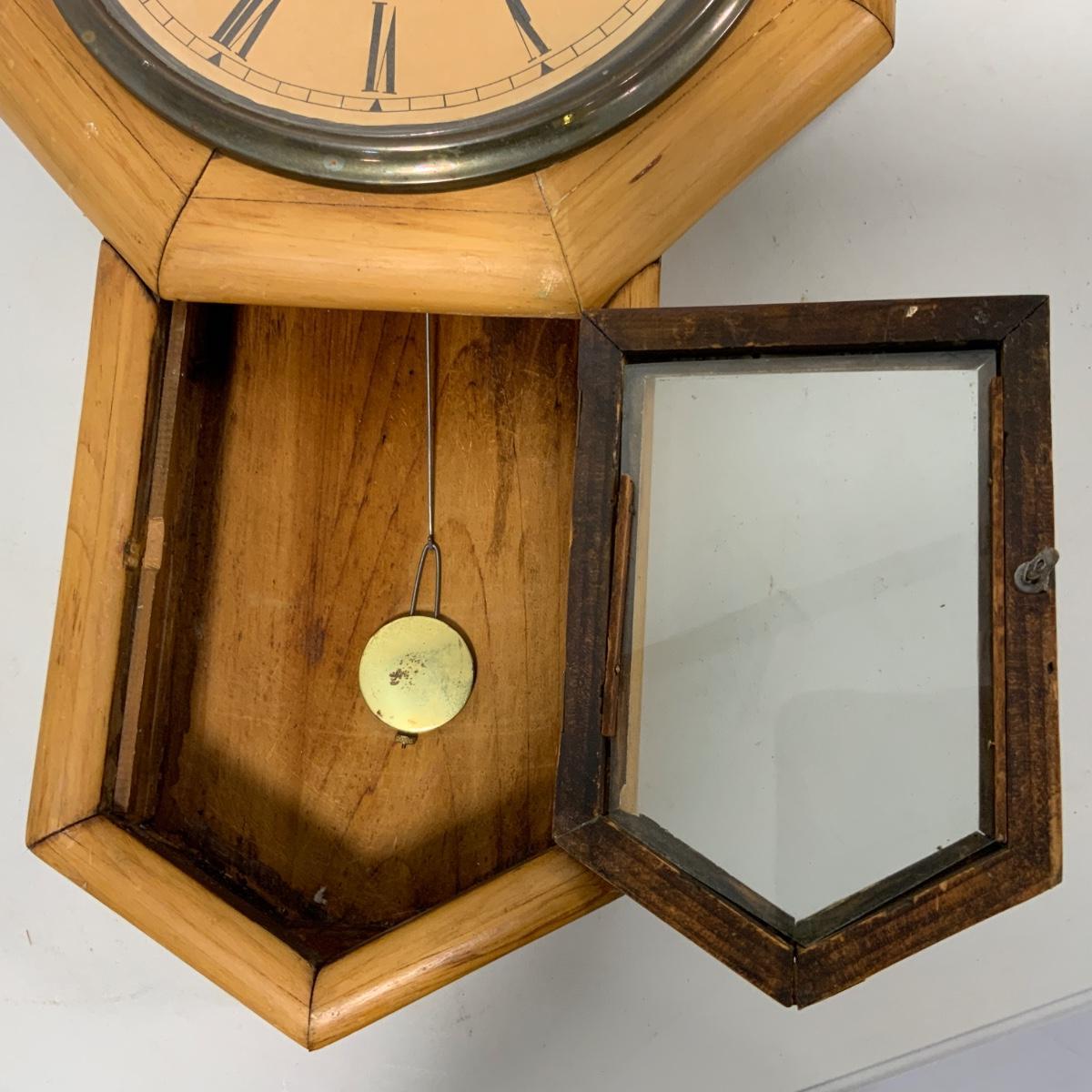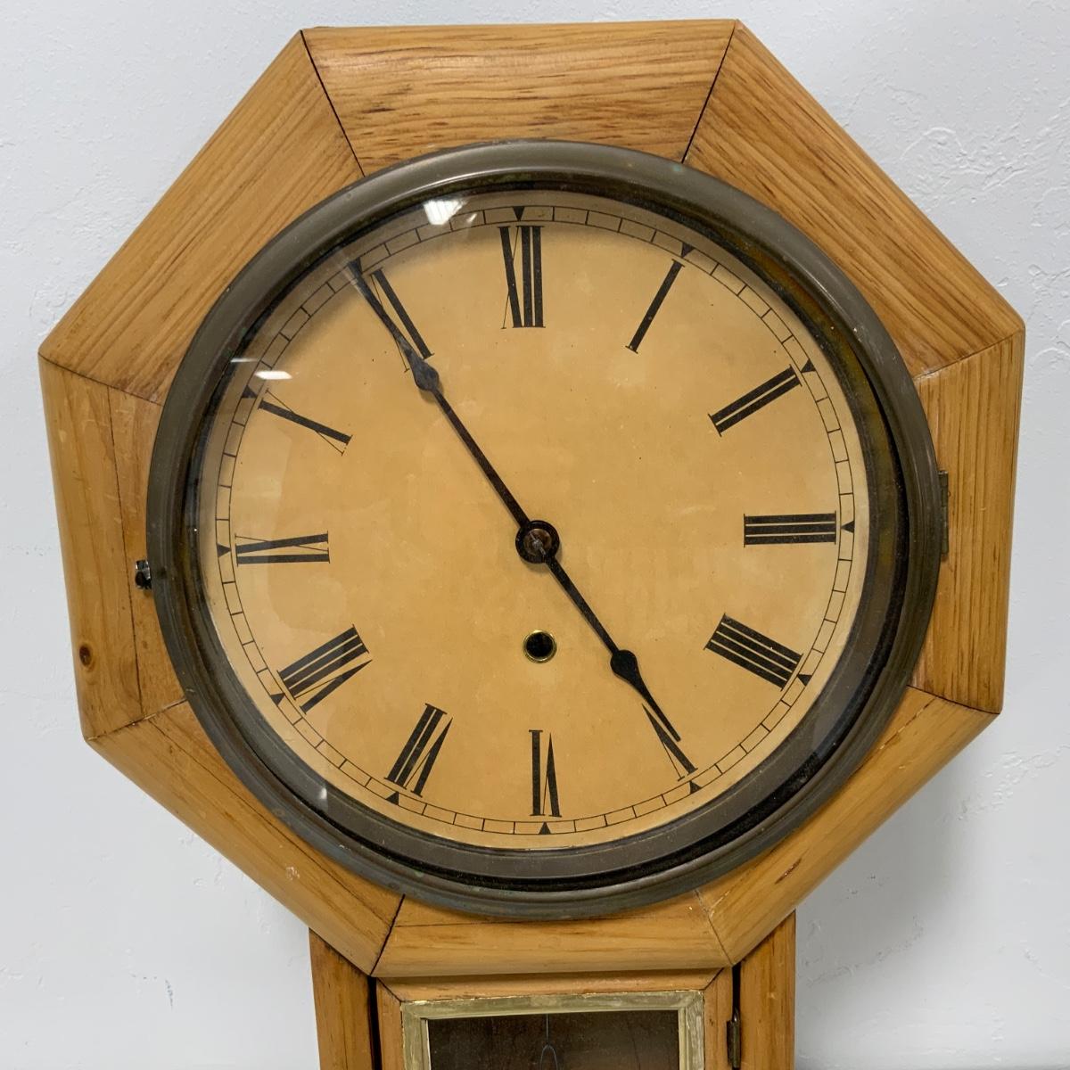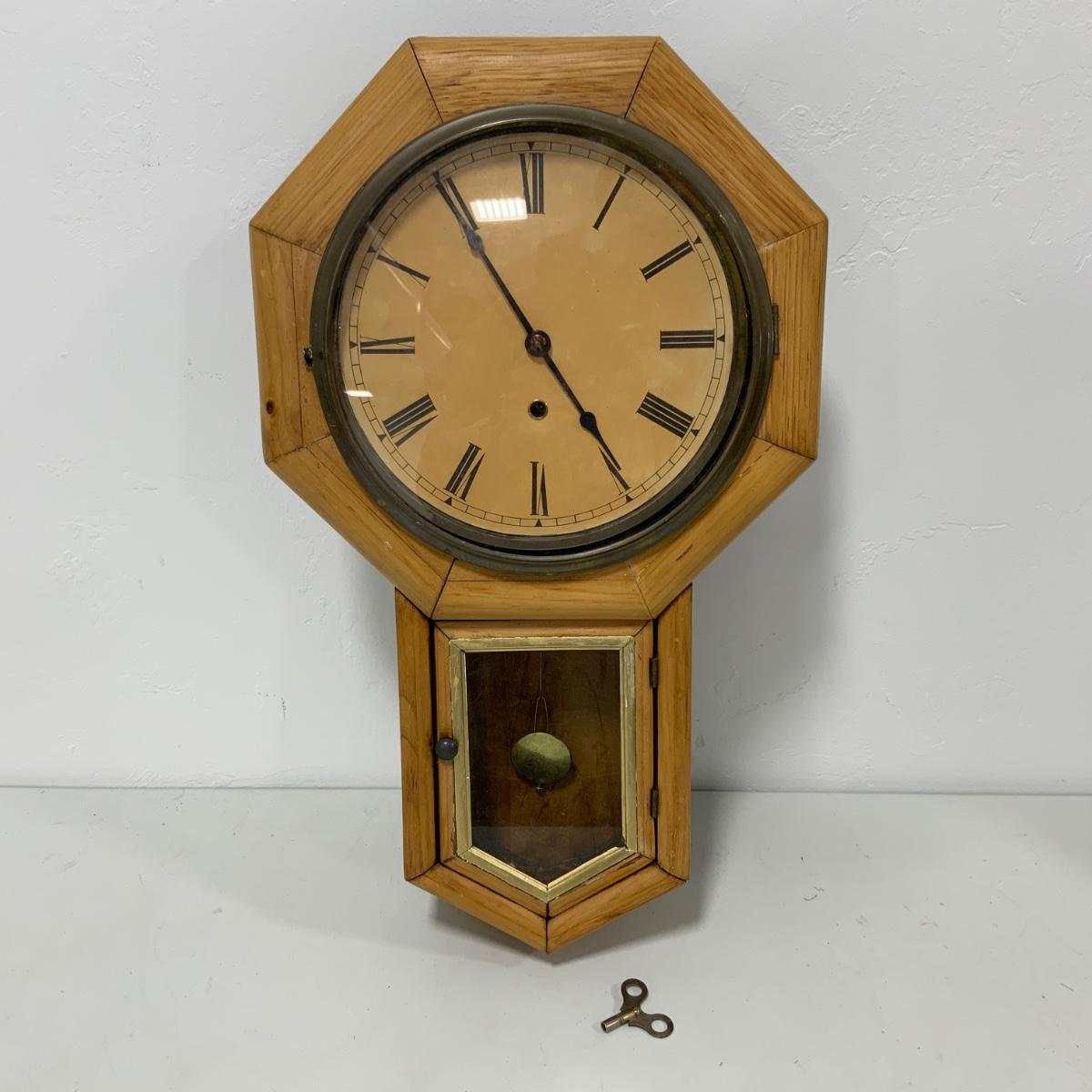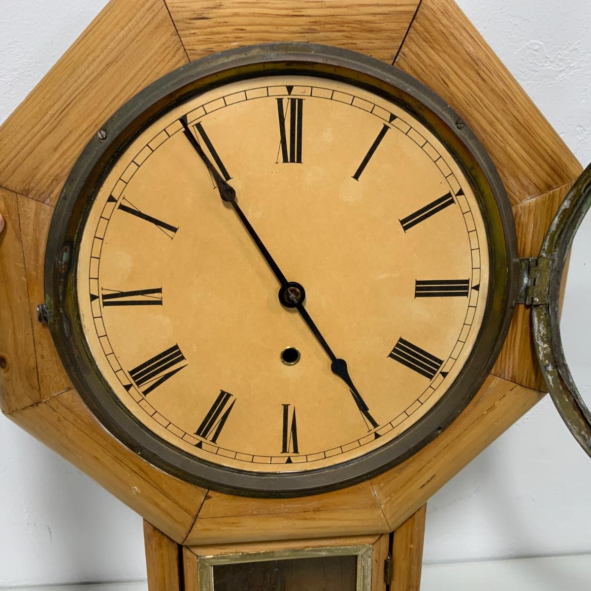 Attractive Pine 8 day 10-inch Octagon Clock. Clock has the original sticker on the reverse. Closure holds well, but doesn’t look fancy. It’s functional! Clock runs well, it’s ticking away as you read this! Clock measures 23” tall, 14” across and 4 1/2” deep. Please see photos for details and condition. ::: Shipping is NOT available on this lot. If you have any questions regarding this lot please contact the auctioneer either via this website, by direct email or by phone. PICK UP TIMES and other important information can be found in the TERMS and DESCRIPTION of the auction. Please take a look for pertinent information. Thanks!