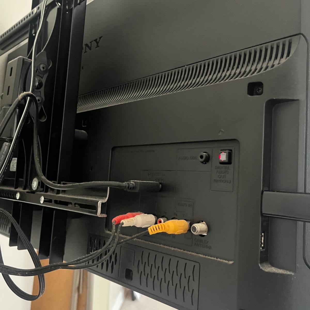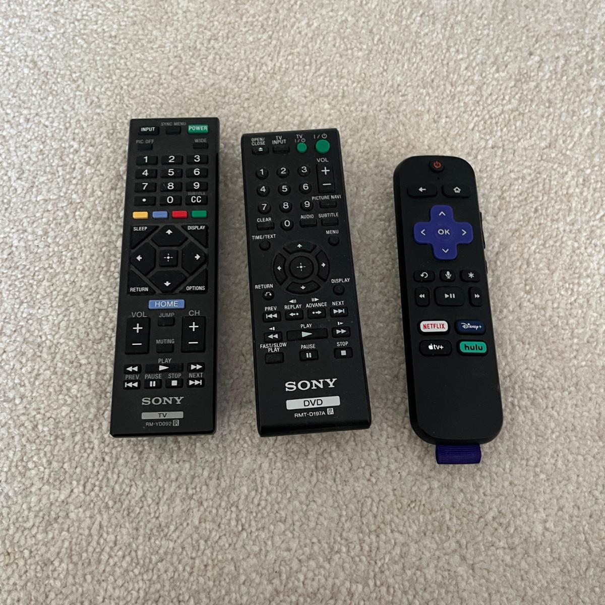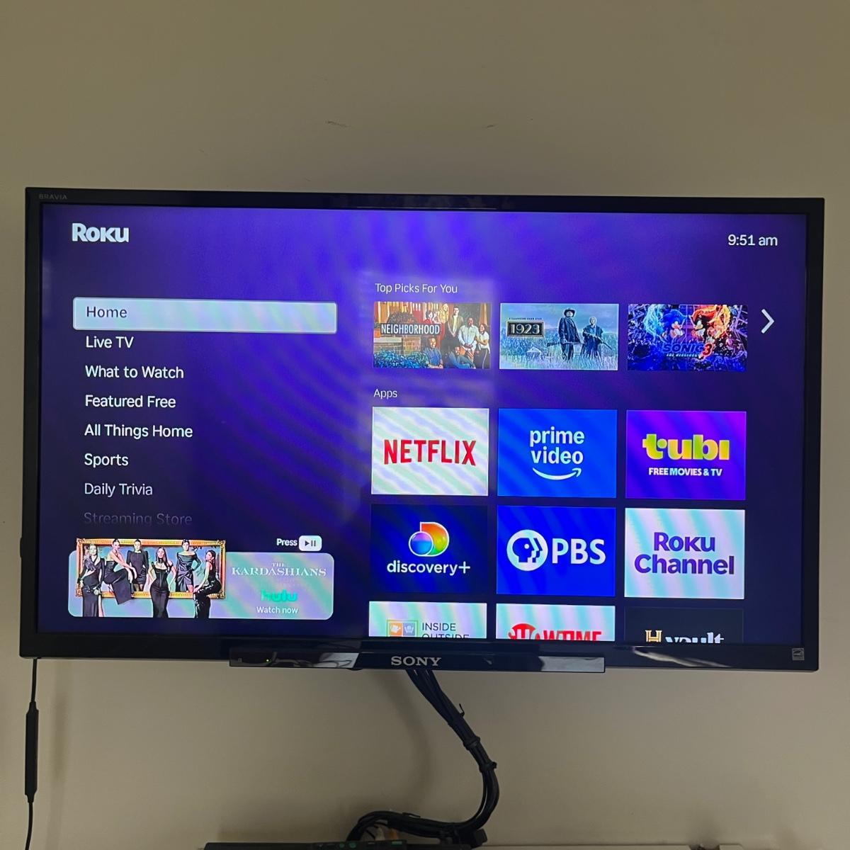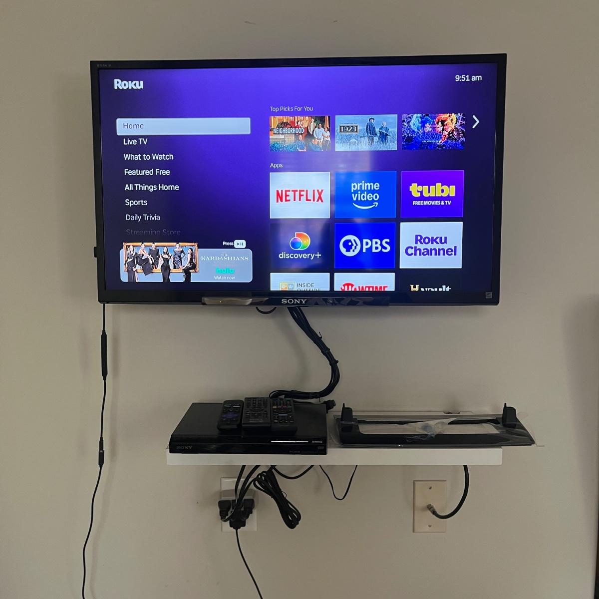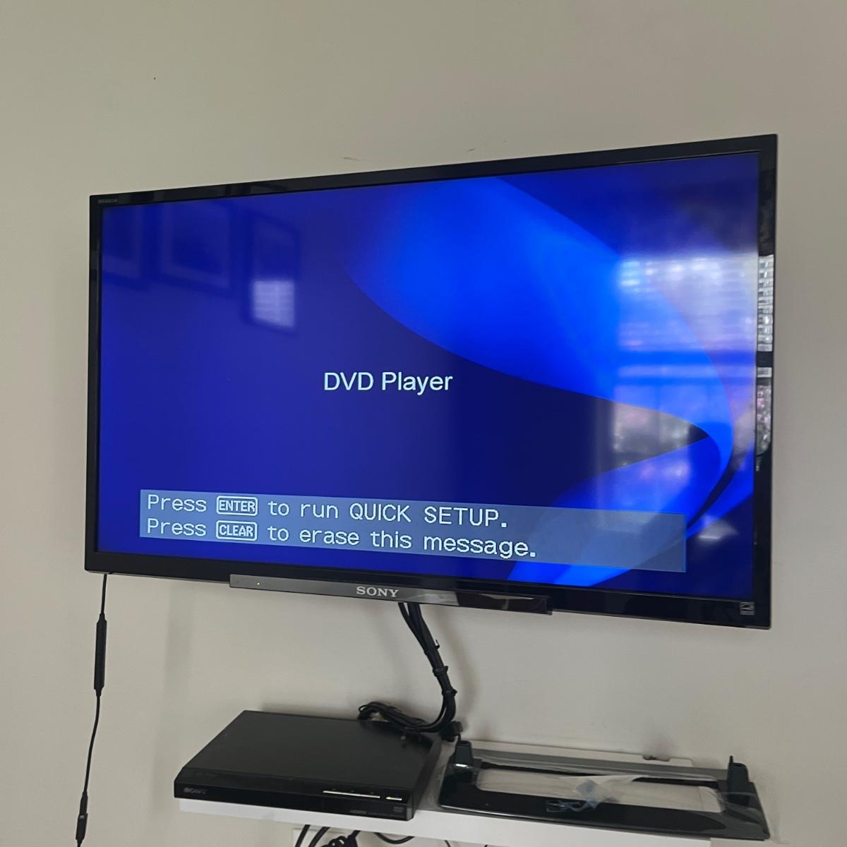 Lot includes a 32” Sony TV, Sony DVD player and a Roku stick. All items powered on when plugged in and include remotes that worked when buttons pushed. Winning bidder will need to remove TV from wall mount that is attached with four Phillips head screws. Wall mount not included but original foot for TV is included.