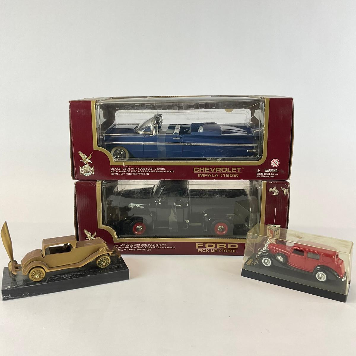 321 Two 1:18 Scale Chevy 1959 & Ford 1953 New In Box With Metal Desk Pen Holder With Small Scale Car