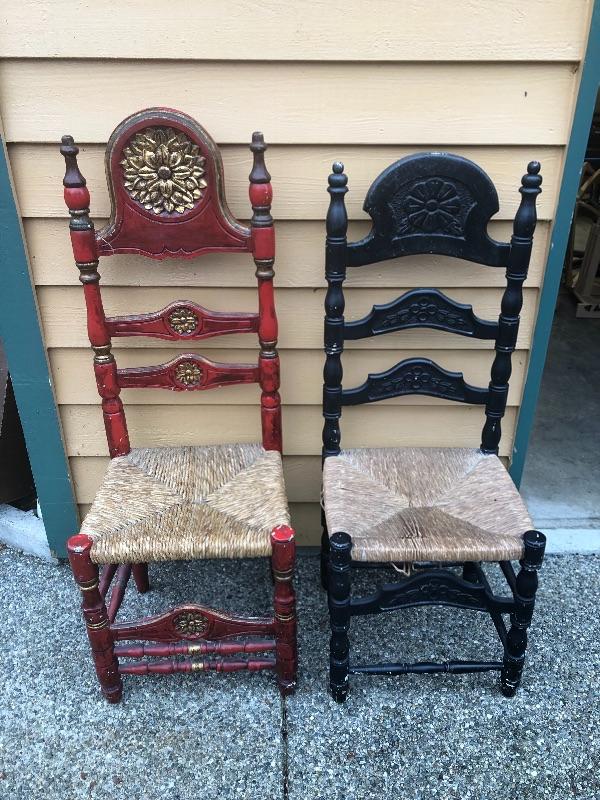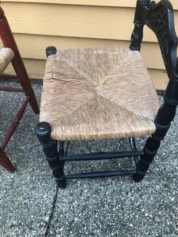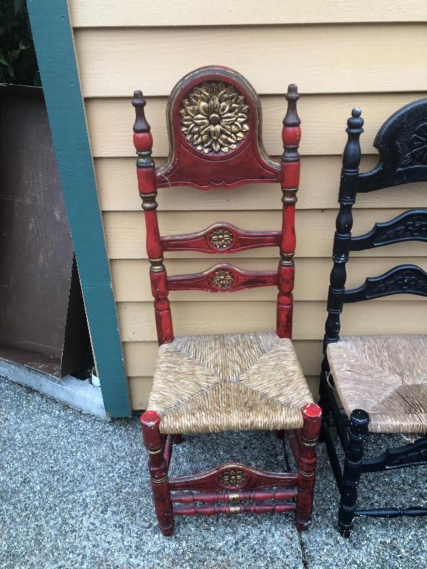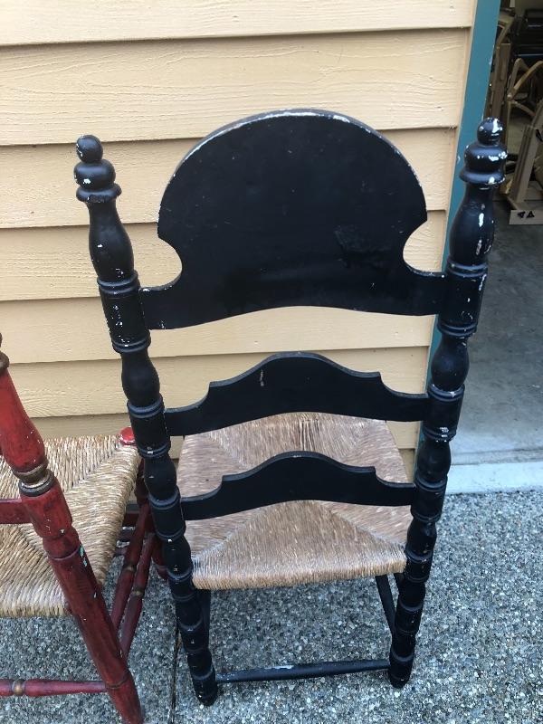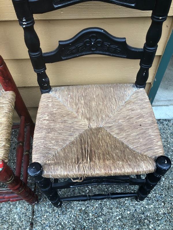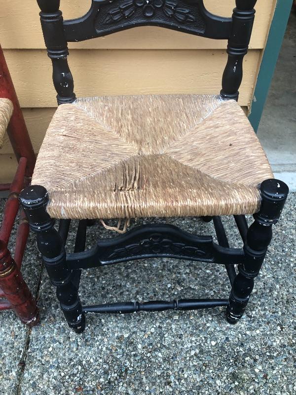 Vintage Wicker bottomed Wood Chairs. These chairs are not sturdy. Black chair has cut in wicker. Great for plant stands, lots of character.
